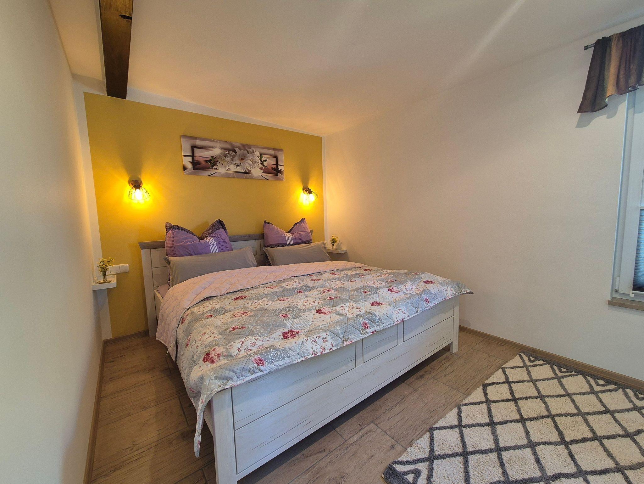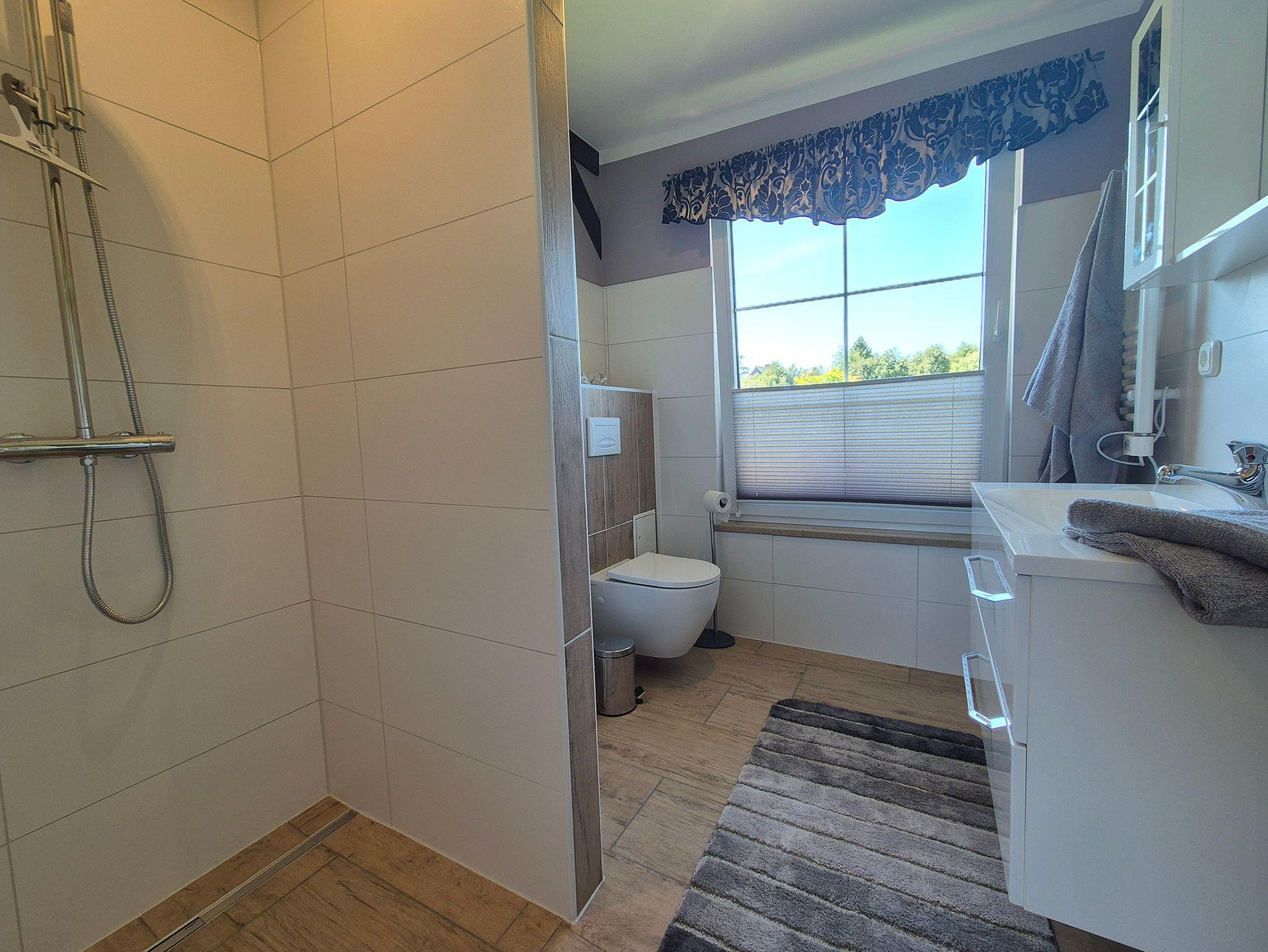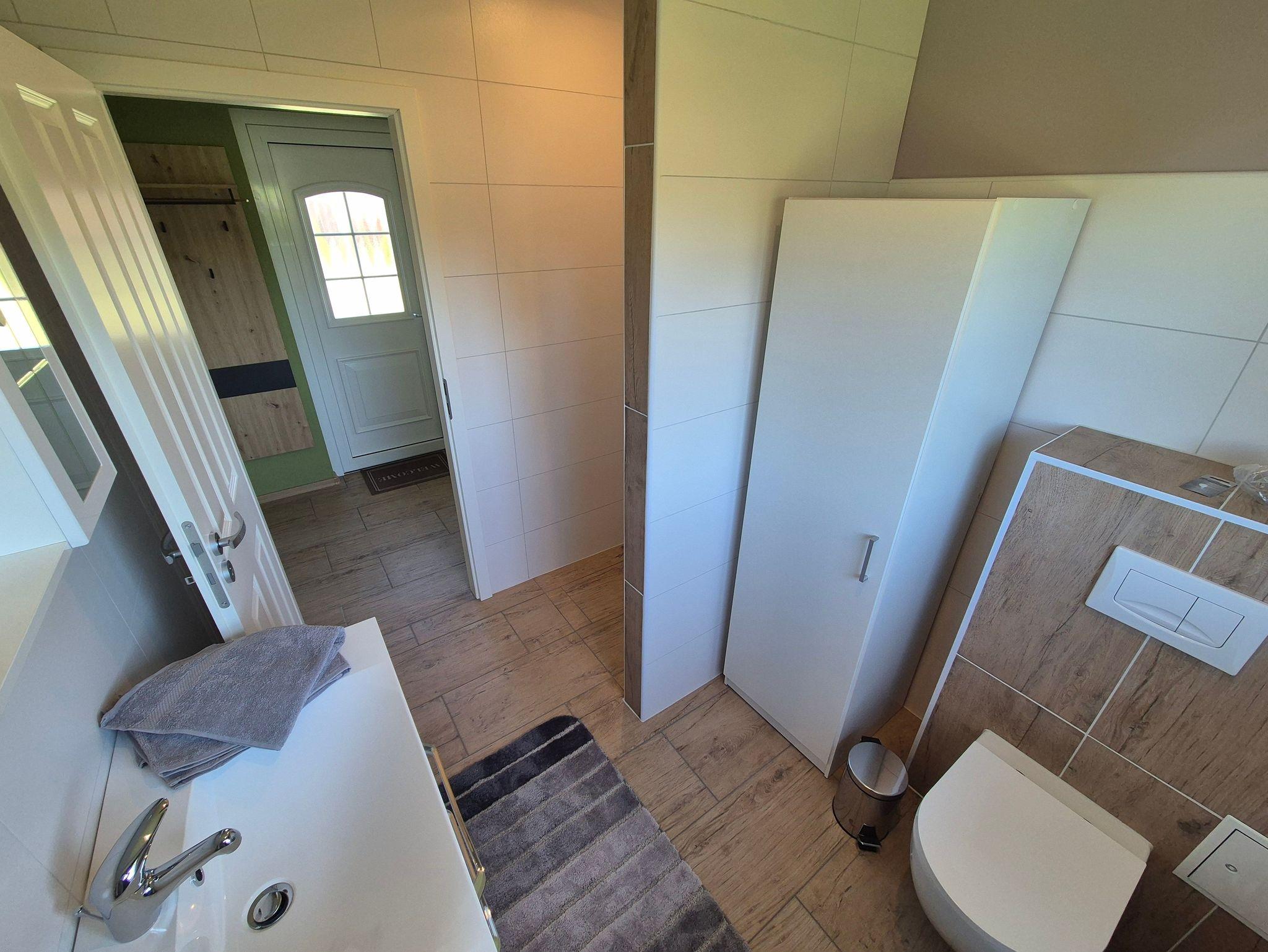 Das Tageslicht-Badezimmer verfügt über eine ebenerdige Dusche, ein WC und einen Waschtisch. Im Schlafzimmer erwartet Sie ein komfortables Doppelbett und ein geräumiger Kleiderschrank. Zudem gibt es ausreichend Platz, um ein Kinderbett aufzustellen.