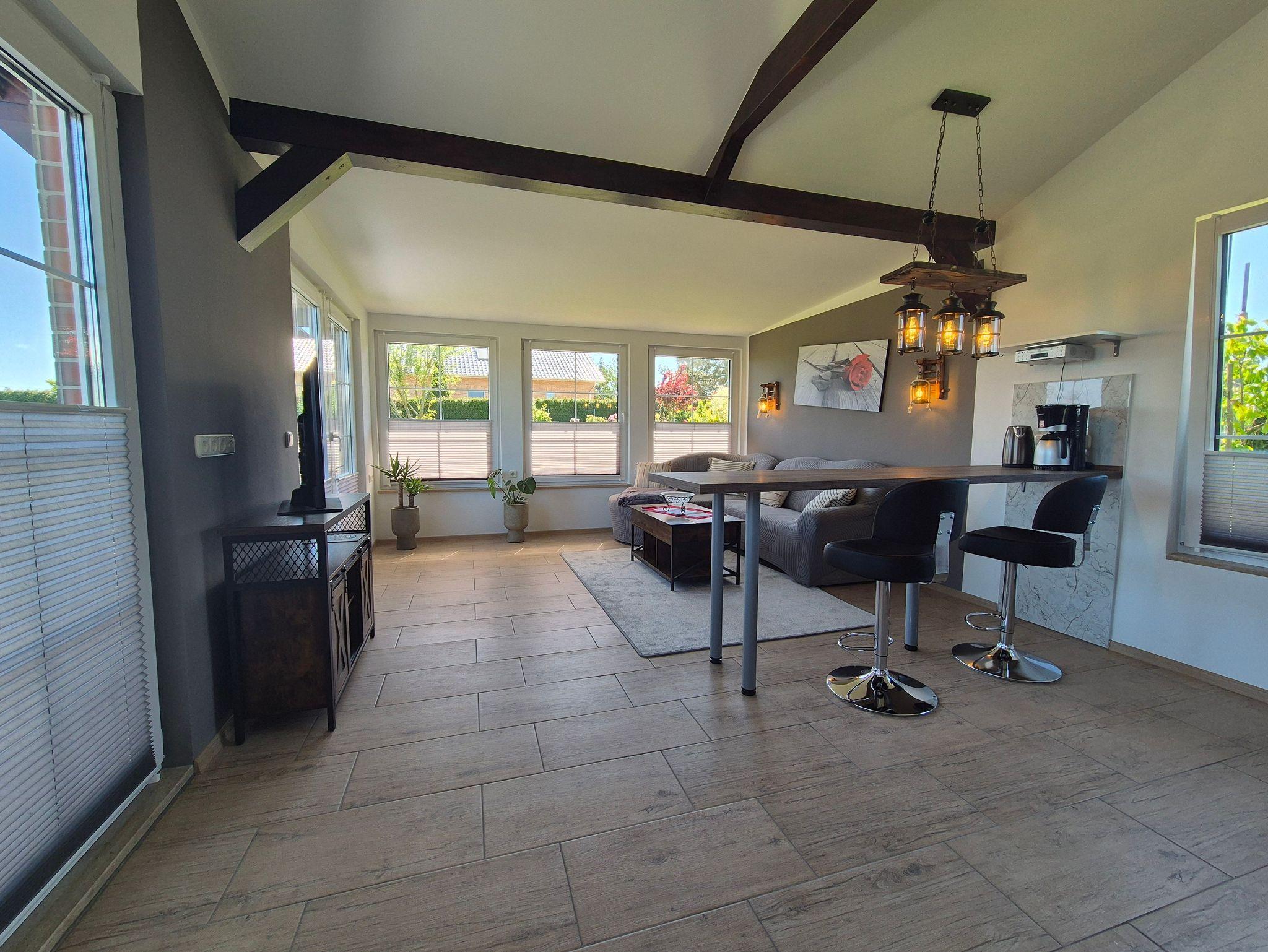 Das neuerbaute Ferienhaus bietet Ihnen ein lichtdurchflutetes Ambiente und empfängt Sie mit einem großzügigen, offenen Wohn- und Küchenbereich. Hier finden Sie eine gemütliche Couchlandschaft und einen TV. Die Küche ist mit zwei Kochplatten, einer Mikrowelle mit Ofenfunktion, einem Geschirrspüler und weiteren technischen Geräten bestens ausgestattet.