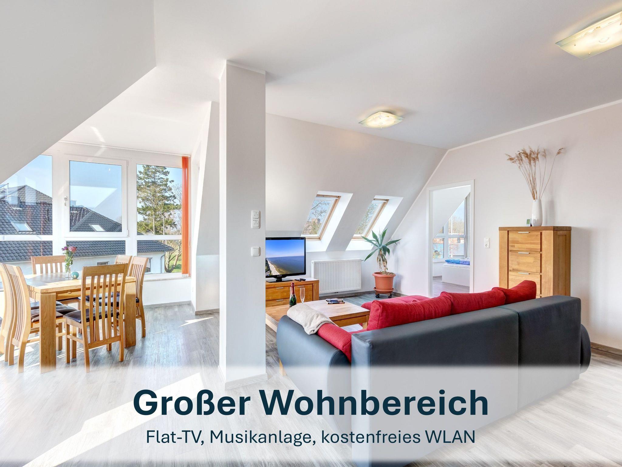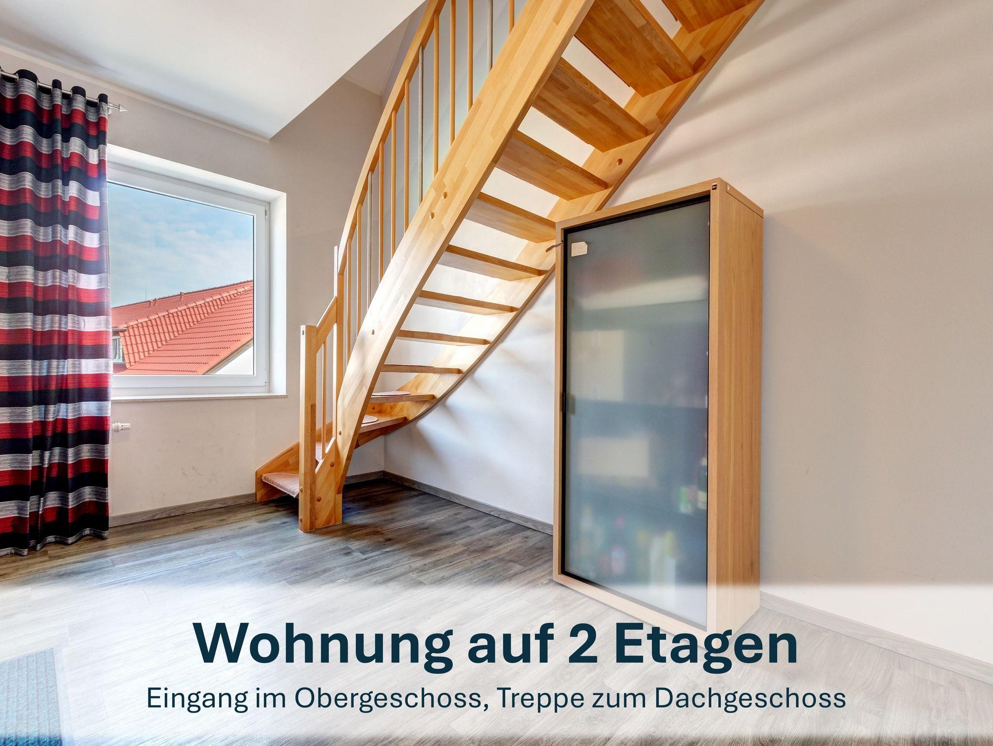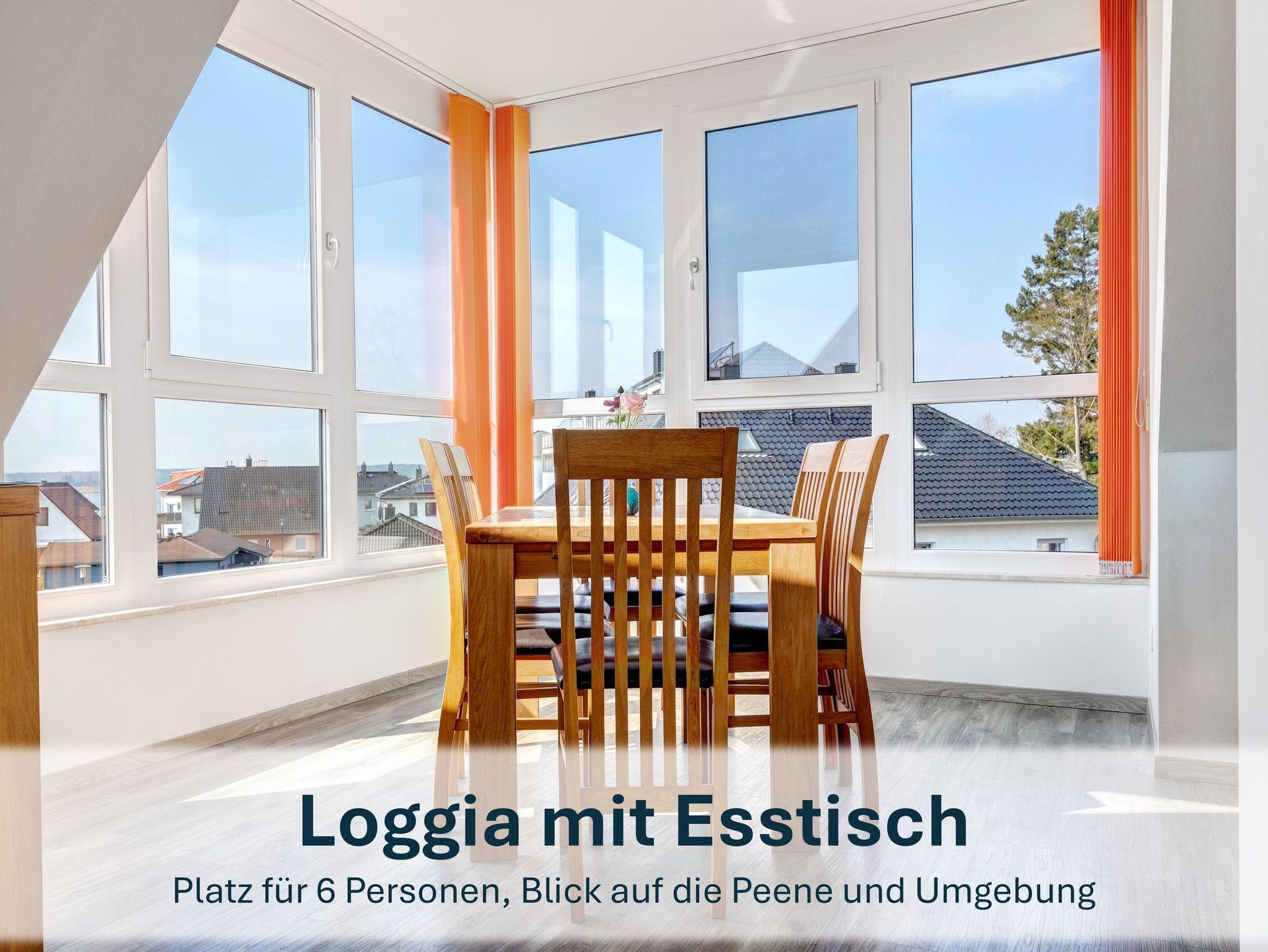 Die Maisonettewohnung erreichen Sie über den Eingangsbereich im Obergeschoss. Über eine Wendeltreppe gelangen Sie ins Dachgeschoss, wo sich der großzügige Wohnbereich mit gemütlicher Couch (ausziehbar), Flat-TV und einer einladenden Loggia mit großem Esstisch für bis zu 6 Personen befindet ? perfekt für gemeinsame Mahlzeiten oder Spieleabende mit Blick aufs Wasser.
