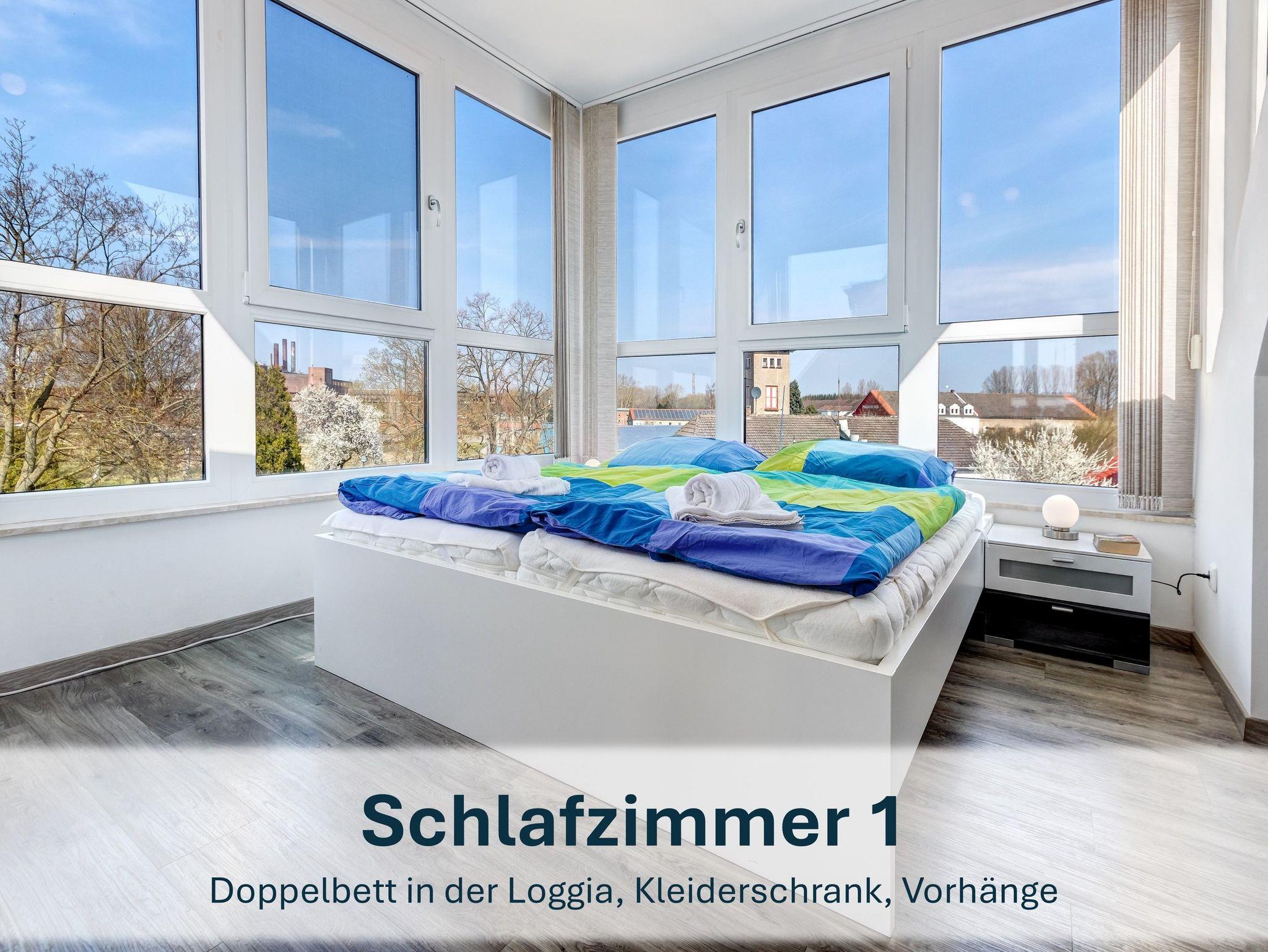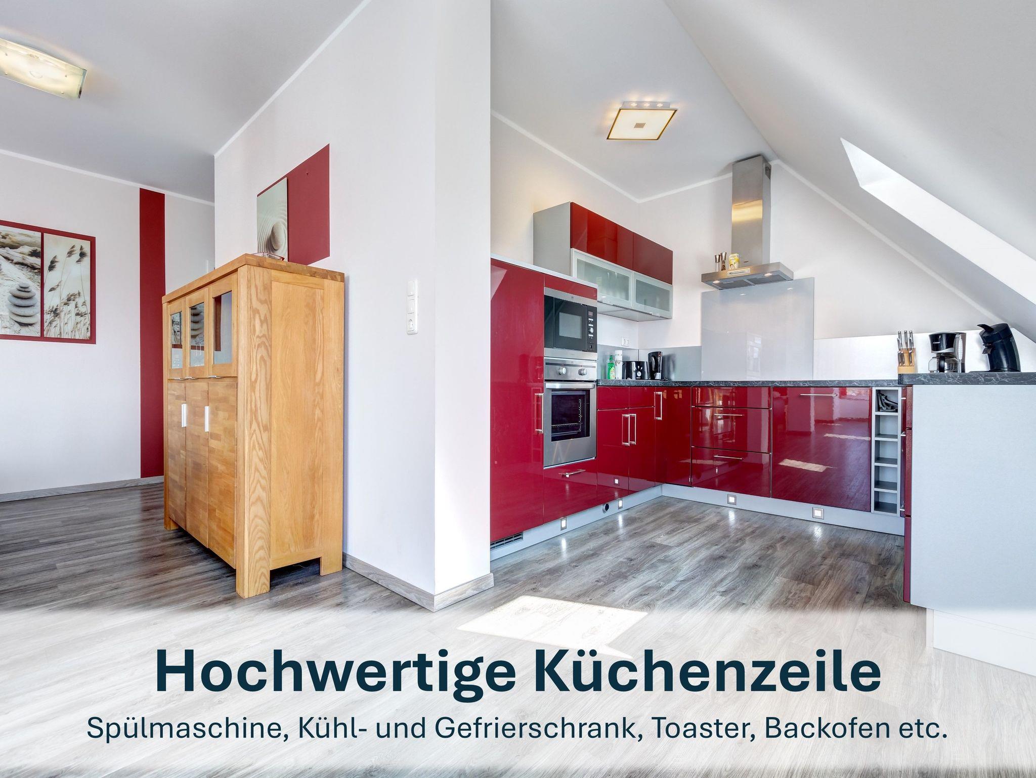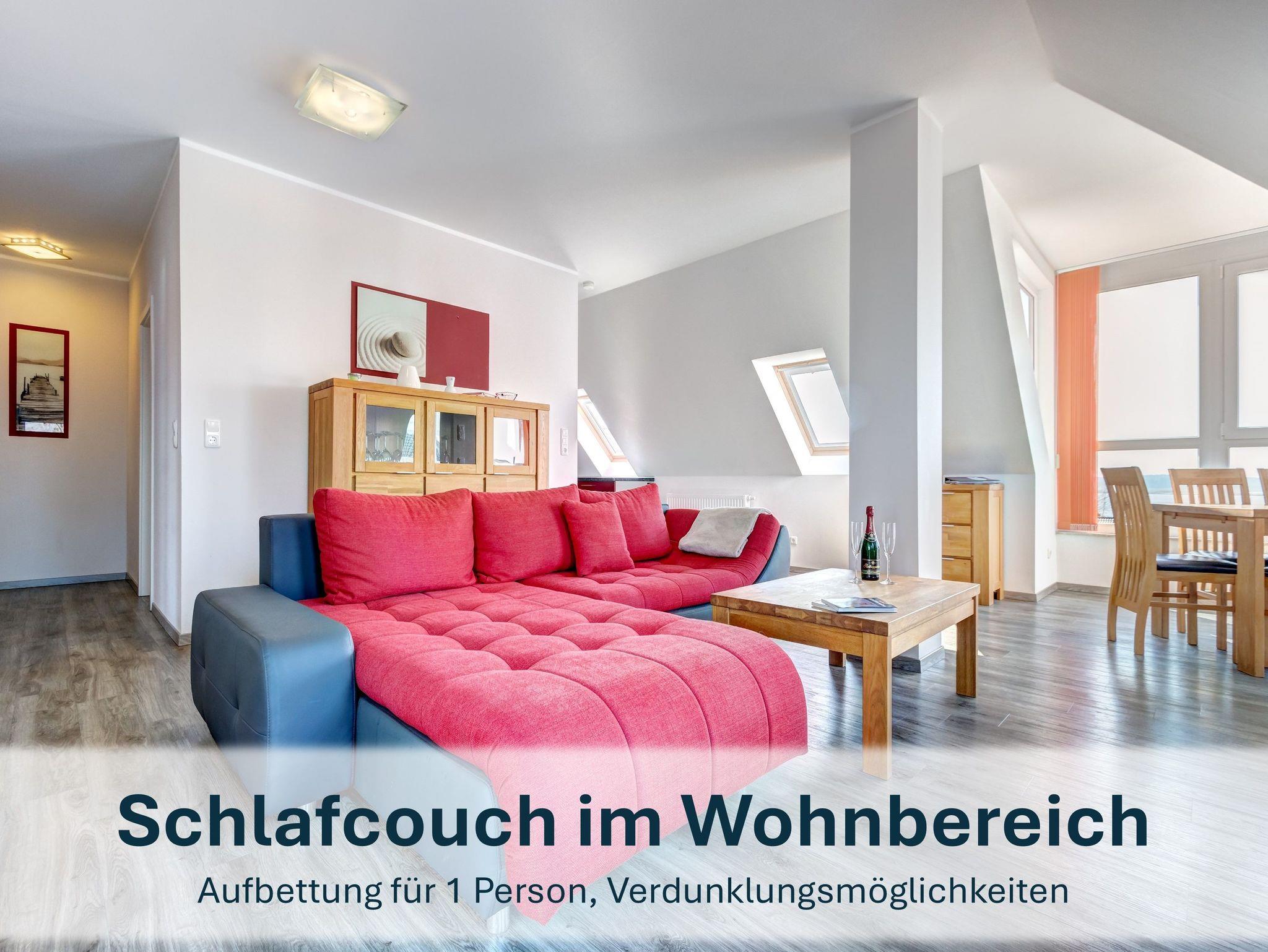 Die Maisonettewohnung erreichen Sie über den Eingangsbereich im Obergeschoss. Über eine Wendeltreppe gelangen Sie ins Dachgeschoss, wo sich der großzügige Wohnbereich mit gemütlicher Couch (ausziehbar), Flat-TV und einer einladenden Loggia mit großem Esstisch für bis zu 6 Personen befindet ? perfekt für gemeinsame Mahlzeiten oder Spieleabende mit Blick aufs Wasser.