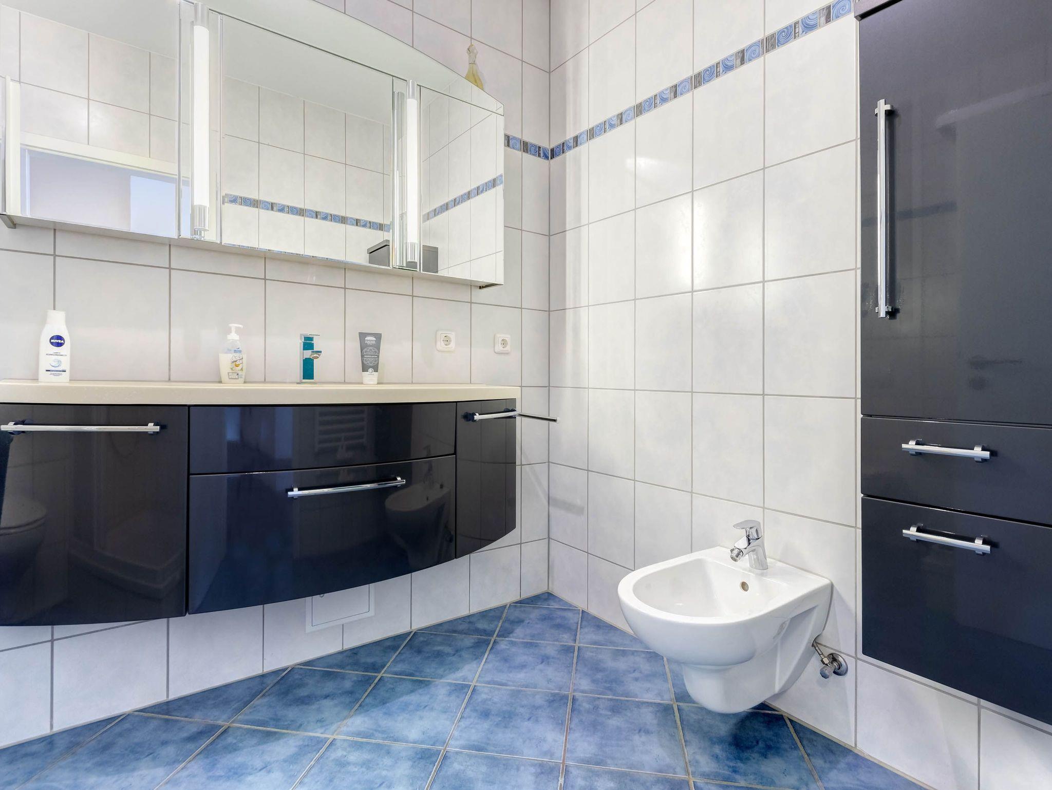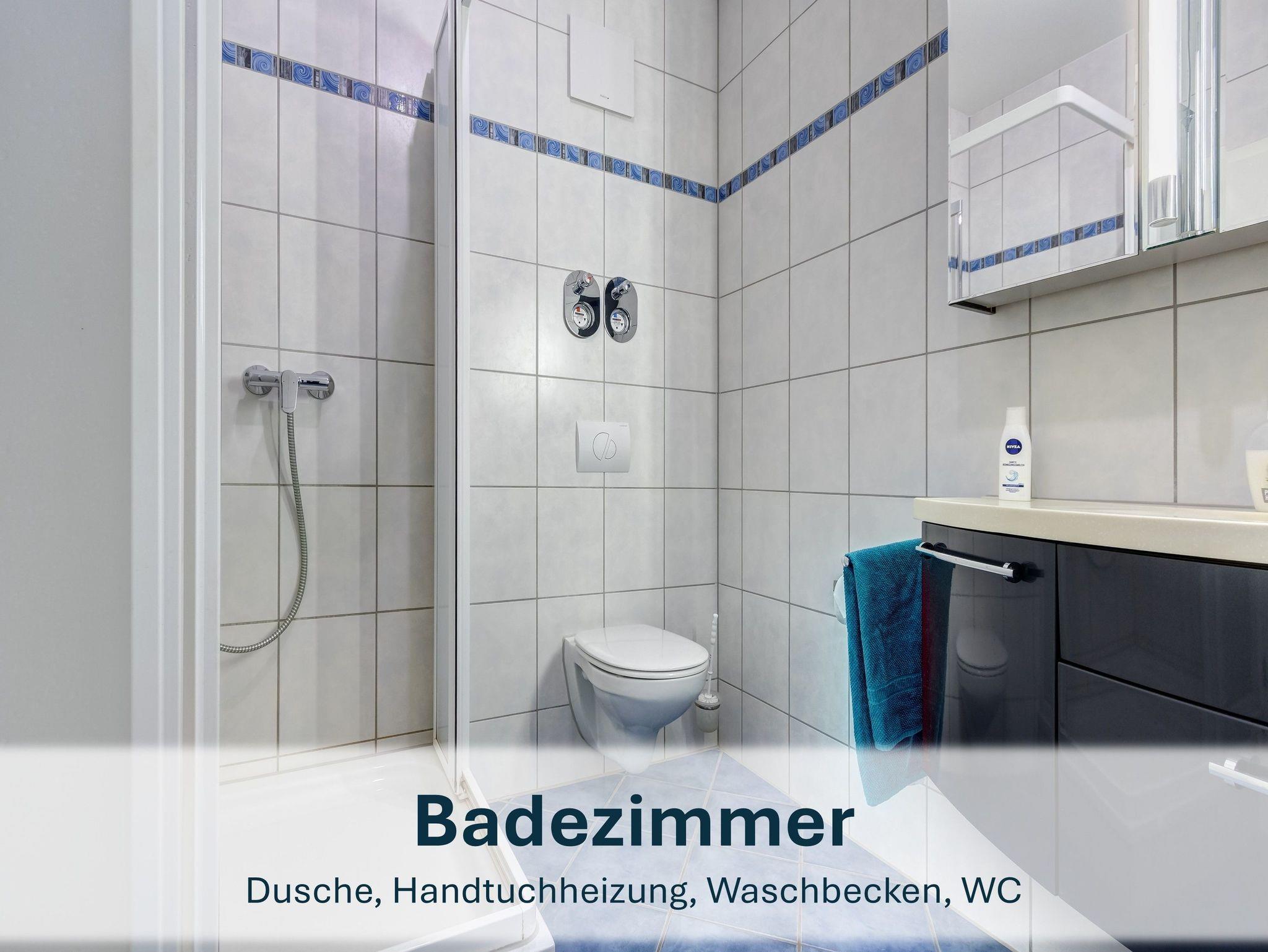 Das moderne Badezimmer ist mit Dusche, WC, Waschbecken und Ablagemöglichkeiten ausgestattet.