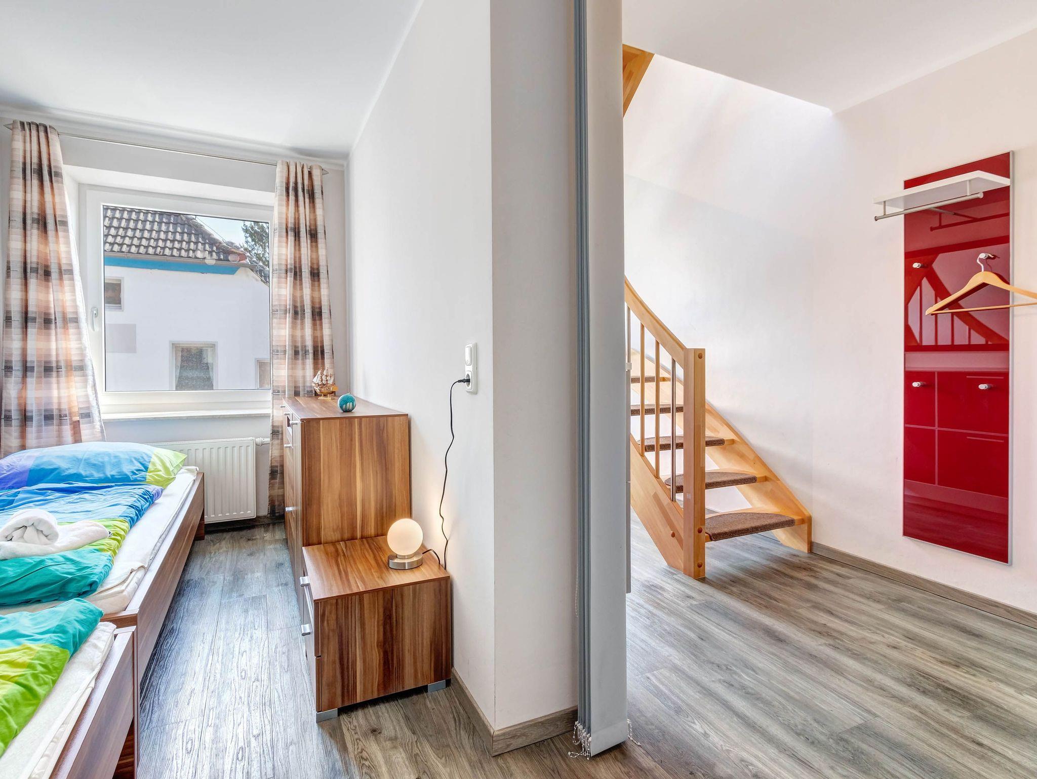 Die Maisonettewohnung Nr.12 erstreckt sich über das Ober- und Dachgeschoss und bietet auf 63m² ausreichend Platz für bis zu 5 Personen und ein Kleinkind bis 3 Jahre. Der Eingangsbereich liegt im linken Flügel des Obergeschosses. Von hier aus gelangen Sie in eine kleine Diele, die ein halb offenes Schlafzimmer mit zwei Einzelbetten sowie das Badezimmer mit Dusche und Badewanne erschließt.