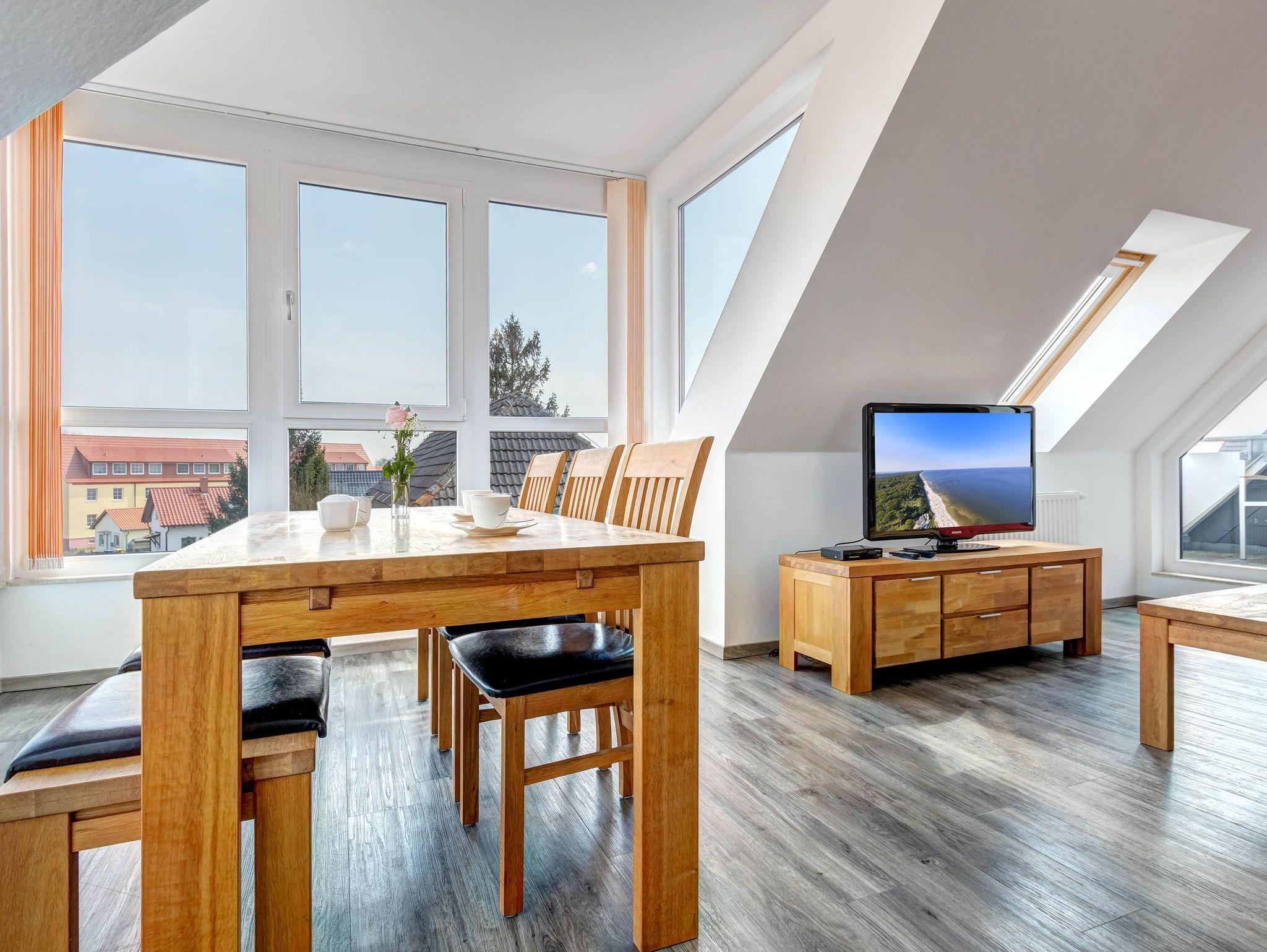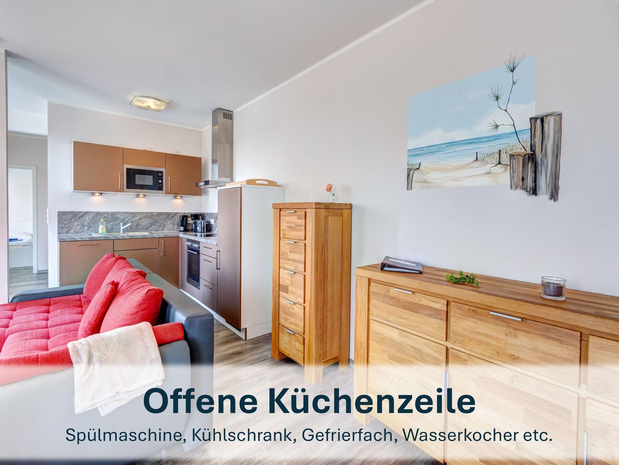Die Ferienwohnung Nr.12 ist eine gemütliche Maisonettewohnung, die sich über das Ober- und Dachgeschoss erstreckt und ideal für Familien geeignet ist. Sie verfügt über zwei Schlafzimmer ? eines mit Doppelbett, das andere (halb offen) mit zwei Einzelbetten. Der offene Wohnbereich lädt zum Verweilen ein und ist mit einer voll ausgestatteten Küche inklusive Spülmaschine, Kühlschrank mit Gefrierfach, Cerankochfeld, Backofen, Mikrowelle, Wasserkocher, Kaffeemaschine und Toaster eingerichtet. Die Loggia mit Essecke und Außenrollos bietet einen gemütlichen Platz mit Ausblick, zusätzlich steht ein Balkon zur Verfügung. Das Badezimmer ist mit Dusche und Badewanne ausgestattet.