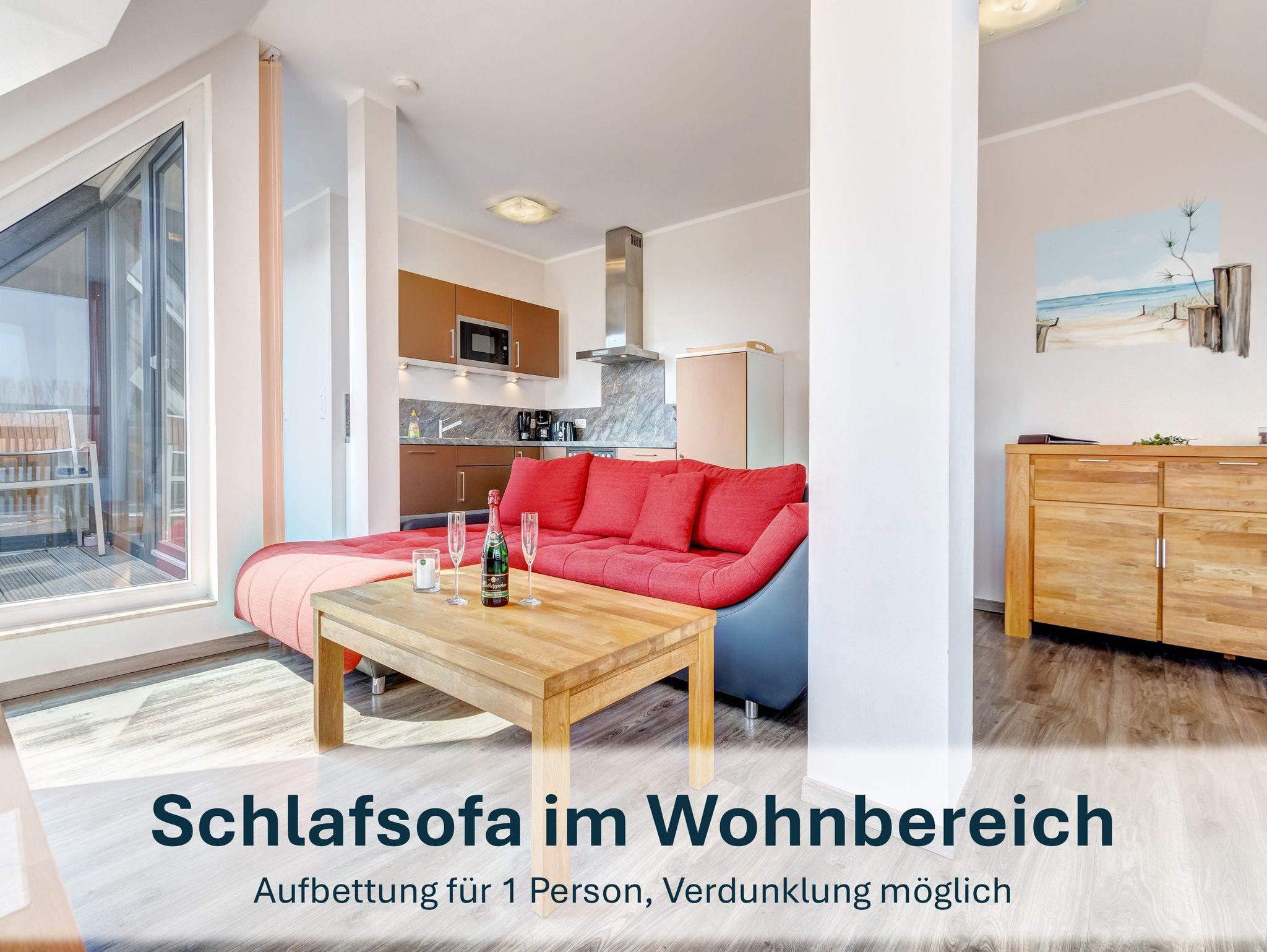 Im oberen Bereich erwartet Sie ein großzügiger Wohnbereich mit Schlafcouch, eine offene, voll ausgestattete Küche sowie der Zugang zum Balkon. Der Essplatz in der Loggia mit Panoramablick lädt zu geselligen Stunden ein. Für mehr Komfort sorgt die Ausstattung der Loggia mit Innenjalousien und Außenrollos.