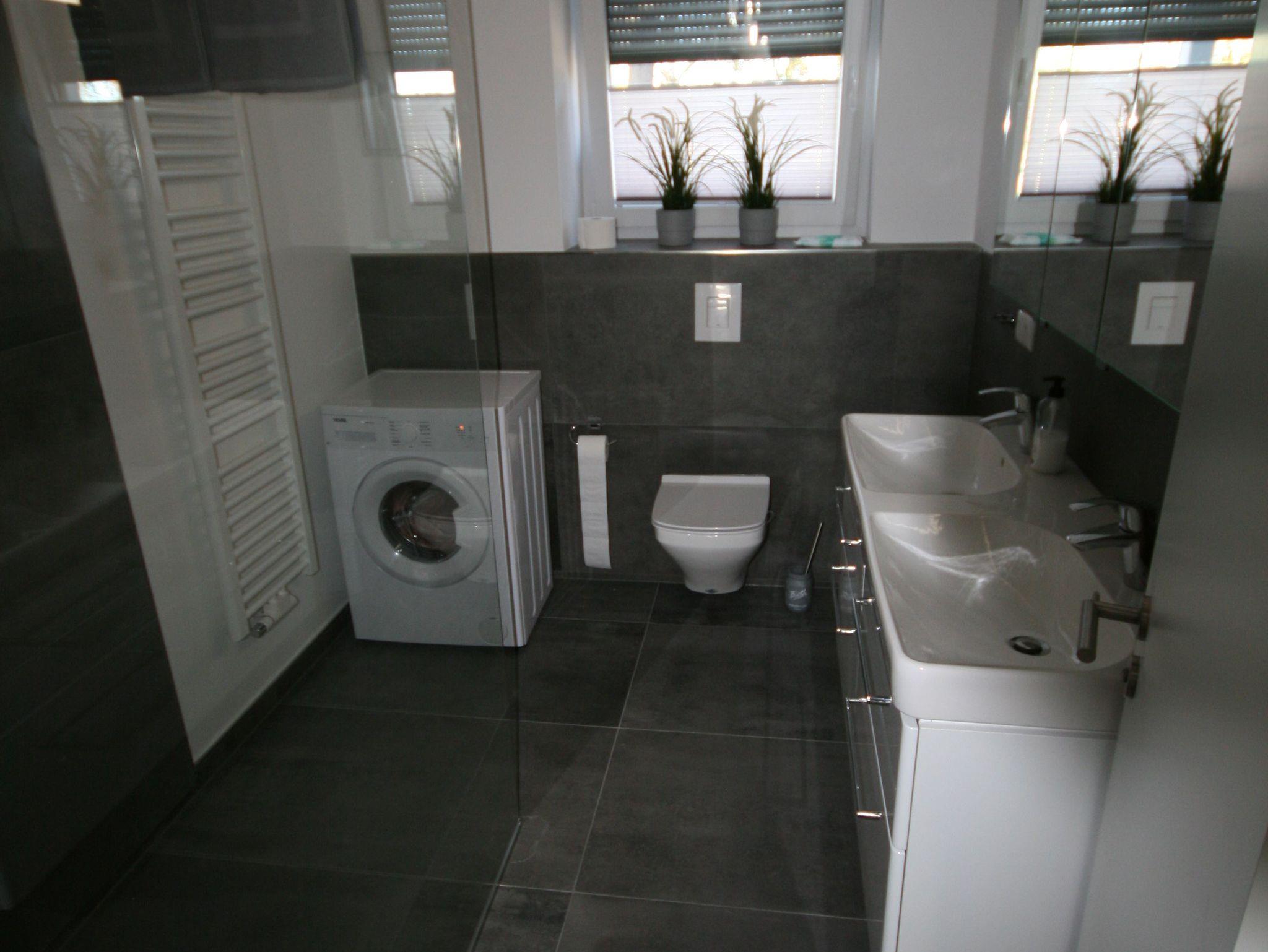 In dem Tageslichtbad mit ebenerdiger Dusche gibt es auch eine Waschmaschine, welche Ihnen während Ihres Aufenthaltes zur Verfügung steht.