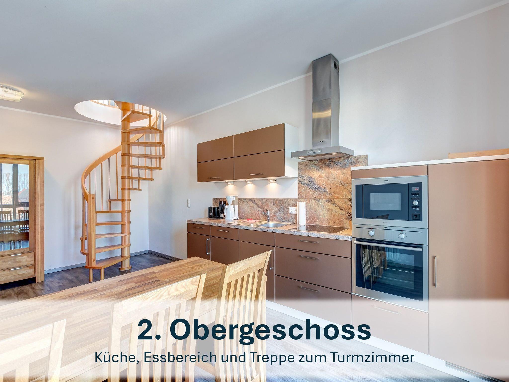 Im Obergeschoss befindet sich ein Schlafzimmer mit zwei Einzelbetten, die zusammengeschoben werden können. Über eine Wendeltreppe erreichen Sie das zweite Schlafzimmer im Turmzimmer ? ebenfalls mit zwei Einzelbetten. Beide Zimmer verfügen über Kleiderschränke.
