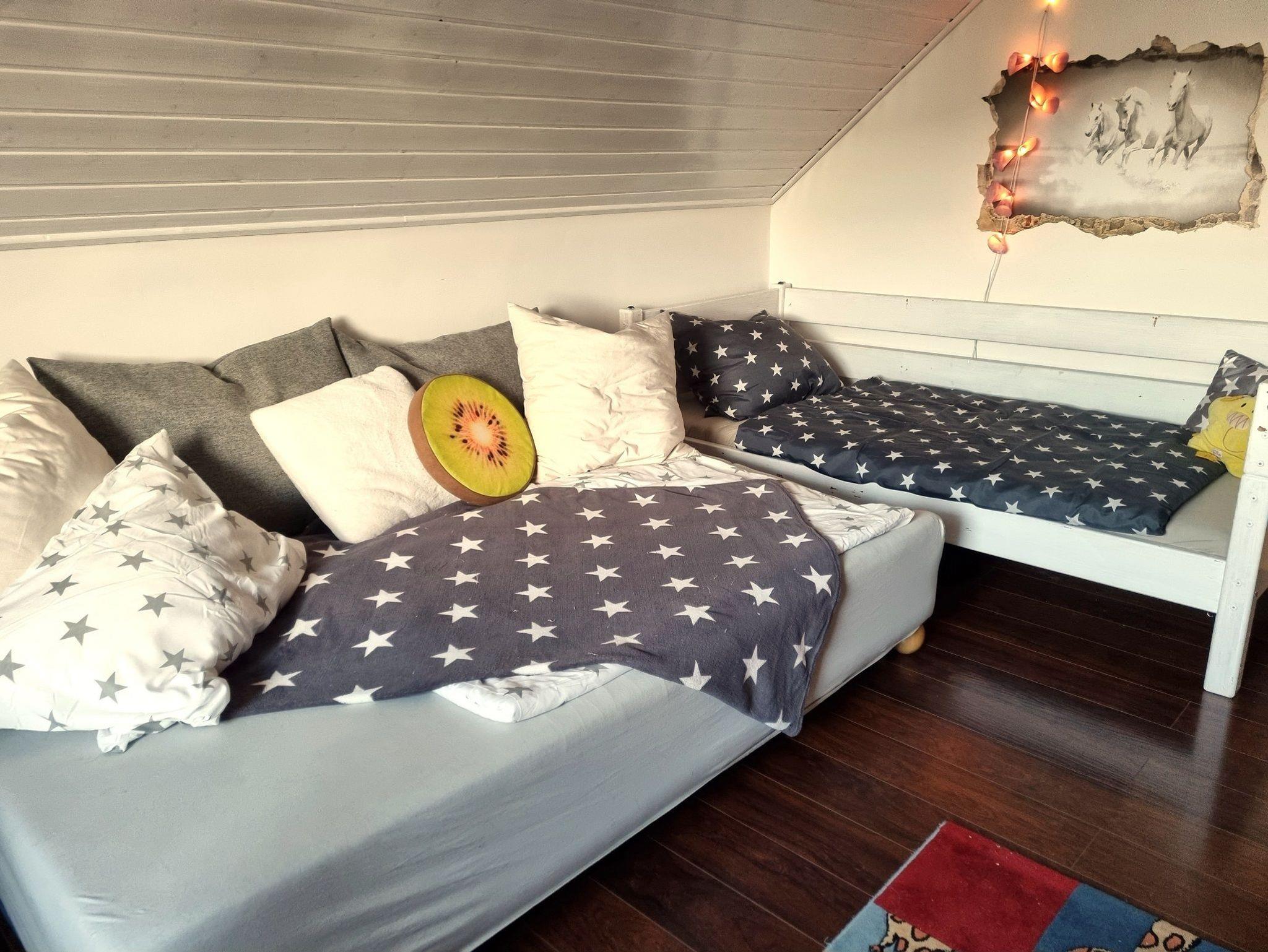 Das Schlafzimmer mit einem Doppelbett (180x200) ist zudem mit einem Kleiderschrank möbliert. Im Kinderzimmer befindet sich ein Sideboard für Kleidung und eine Schlafmöglichkeit für zwei Kinder (ggf. auch drei Kinder).