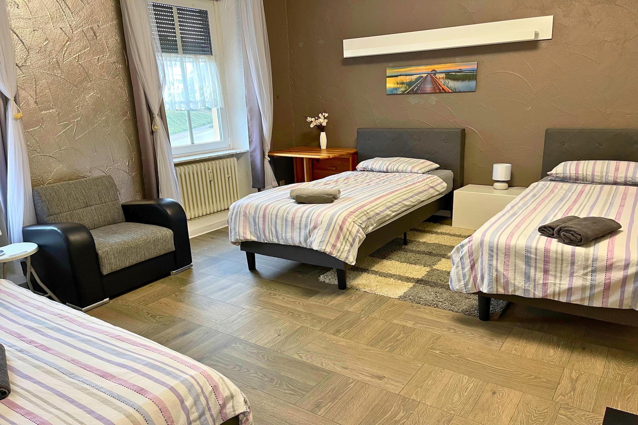 Velkommen til dit rummelige landlige tilflugtssted i Pellingen, hvor komfort møder charme, kun en kort køretur fra historiske Trier. Denne indbydende lejlighed er perfekt til familier eller små grupper og har plads til op til seks gæster. Den har en hyggelig stue med sovesofa, spiseplads og tv - ideel til afslapning efter en dag med sightseeing eller vandreture i naturen. Lejligheden kan prale af to indbydende soveværelser: et med en dobbeltseng (eller to enkeltsenge) og eget opholdsområde, og et større andet soveværelse med tre enkeltsenge, en charmerende pejs og et loungehjørne - perfekt til børn eller venner, der deler plads. To moderne badeværelser sikrer, at alle har plads til at gøre sig klar, hvoraf det ene har badekar-bruser-kombination og det andet en bruseniche. Lav gode måltider i det fuldt udstyrede køkken, komplet med ovn, opvaskemaskine, mikrobølgeovn, køleskab med fryser, kaffemaskine og elkedel. Vaskerifaciliteter er tilgængelige på stedet (mod et gebyr), sammen med strygejern, strygebræt, hårtørrer og privat parkering. Med nem adgang til den naturskønne Moseldal, naturparken Saar-Hunsrück og dagsture til Luxembourg er denne lejlighed i Pellingen en ideel base for både afslapning og udforskning.