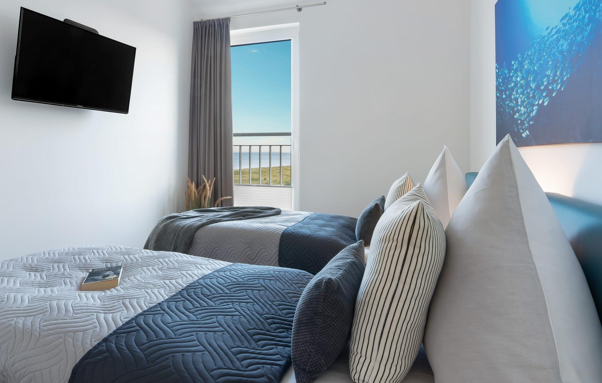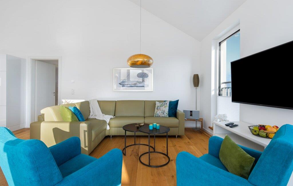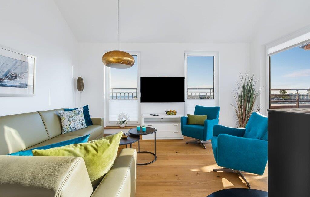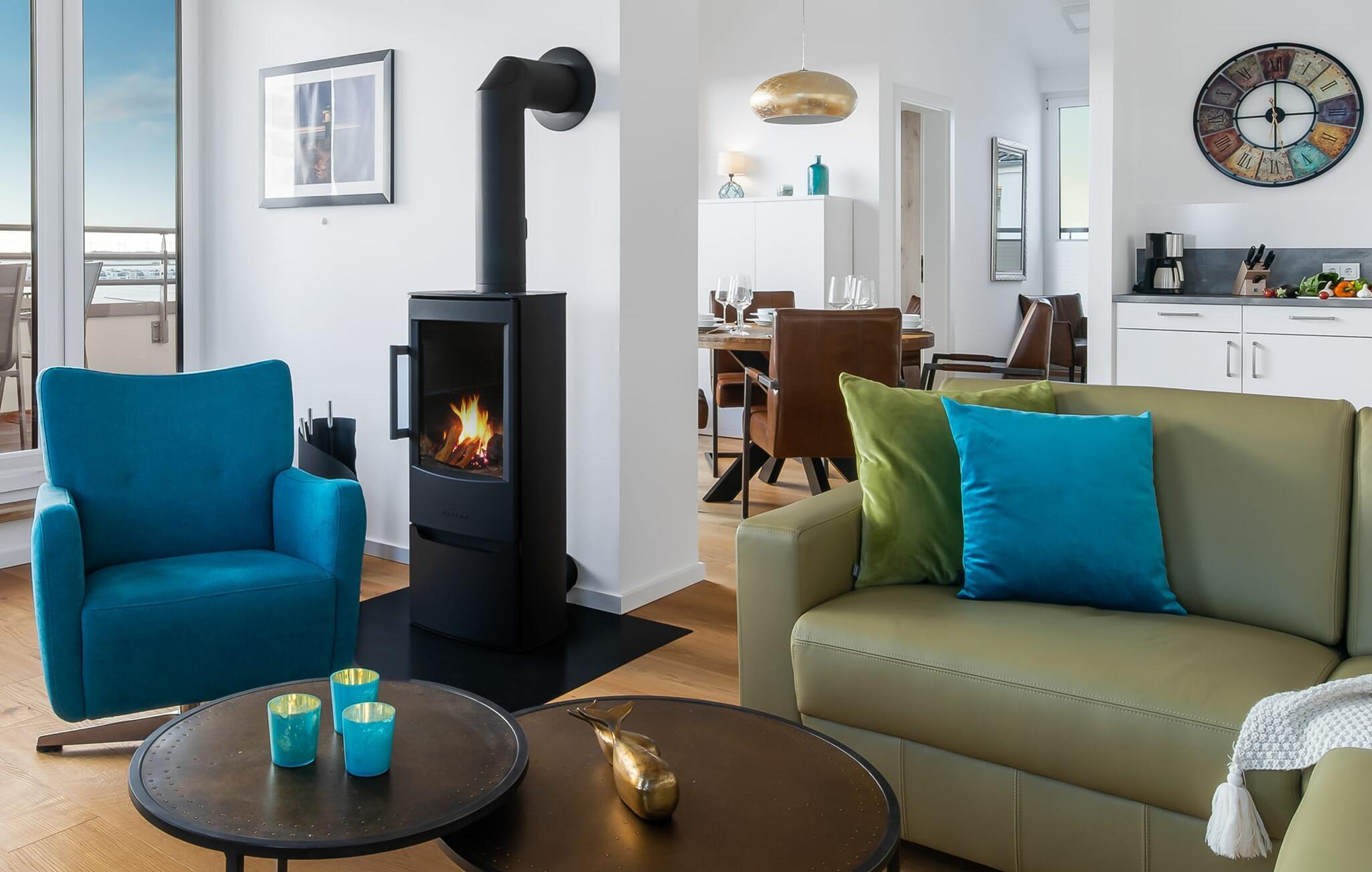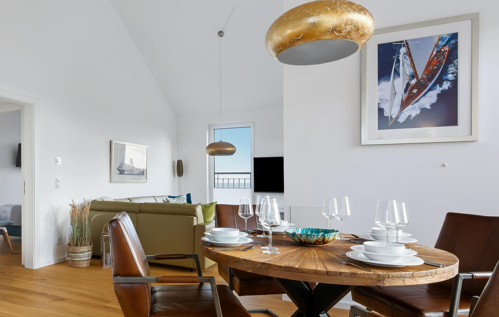 Penthouselejligheden MEERESTOCHTER inviterer sine gæster til en uforglemmelig ferie ved Østersøen. Bare et par minutters gang fra Weidenfelds sandstrand og Østersøen byder MEERESTOCHTER jer velkommen til sin rummelige og lyse stue/spisestue. Træd ind og kig straks gennem de gulv-til-loft-vinduer ud på sportsbådshavnen, slimets smukke mund med dets sømænd og naturreservatet og til siden den uendelige Østersø med dens bølger ! Den moderne og hyggelige indretning med deres kærligt designede maritime detaljer får jer hurtigt til at glemme hverdagen. Ud over fjernsyn og pejs til den køligere sæson, er alt der for at føles helt behageligt. Bluetooth musiksystemet sikrer den rigtige stemning med jeres yndlingsmusik. Og når I først har opdaget den komfortable L-formede sofa i stuen, vil I bestemt ikke rejse jer så hurtigt igen. Det integrerede åbne køkken er udstyret med alt, der ikke kun gør madlavningen nemmere, men også gør madlavningen sjov. Og hvad kunne være hyggeligere end at spise den tilberedte mad på den tilstødende rummelige loggia med udsigt til travlheden i lystbådehavnsområdet. Med den elektriske grill vil grillfans også få noget for pengene med udsigt til solnedgangen over Sleien, måske med et glas vin...? De to soveværelser har hver et fjernsyn og gulv til loft-vinduer. I kan vælge mellem en dobbelt boxmadras eller to enkelt boxmadrasser. Uanset hvilken beslutning I træffer, er I garanteret en afslappende søvn. Ydermere sikrer det perfekt udstyrede badeværelse med bruser i gulvniveau behagelig komfort. Der er også en elevator ved siden af opgangen, der bringer jer komfortabelt til jeres ferielejlighed på øverste etage. Da det næsten er obligatorisk at cykle i dette smukke landskab, er der en rummelig, aflåselig cykelkælder lige ved siden af den underjordiske parkeringsplads (indgangshøjde: 2m). Vores favoritsted: At sidde på loggiaen, kigge ud i det fjerne og lytte til bølgerne og vinden... Bemærk venligst: OstseeResort Olpenitz er meget populært, og der bygges fortsat i parken. Ikke desto mindre kan I se frem til en 5-stjernet standard og et førsteklasses ophold. Byggeaktiviteterne kommer ikke til at forstyrre jer på ferien, og derfor gives der ikke yderligere afslag i prisen.