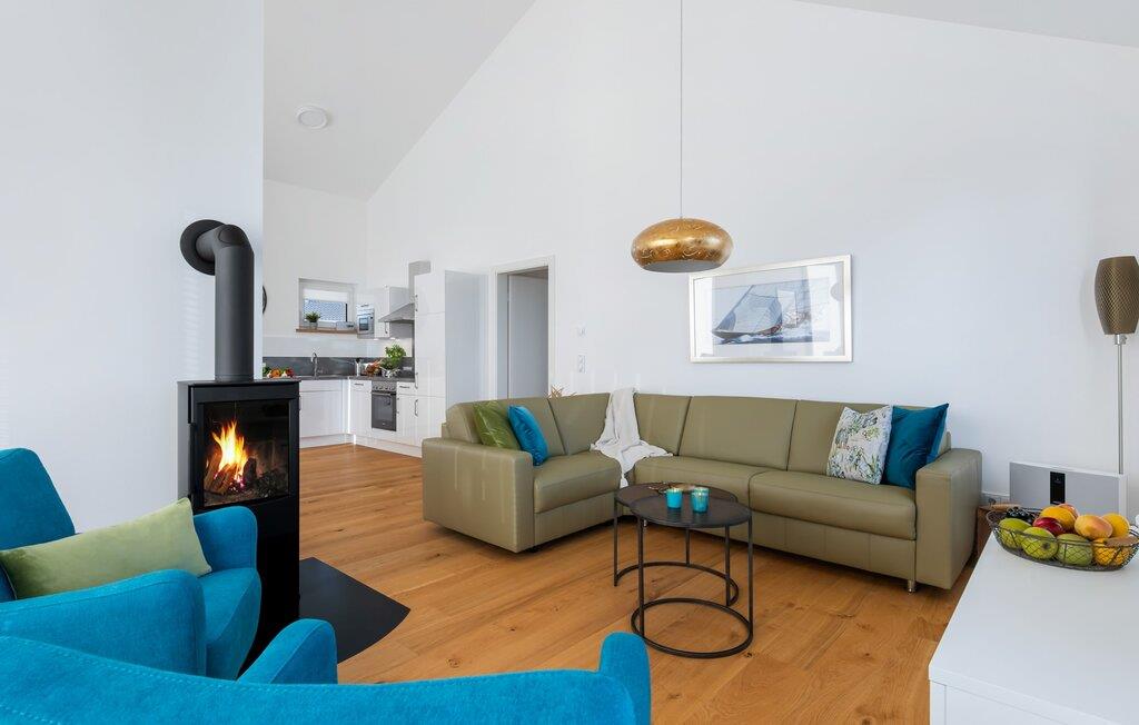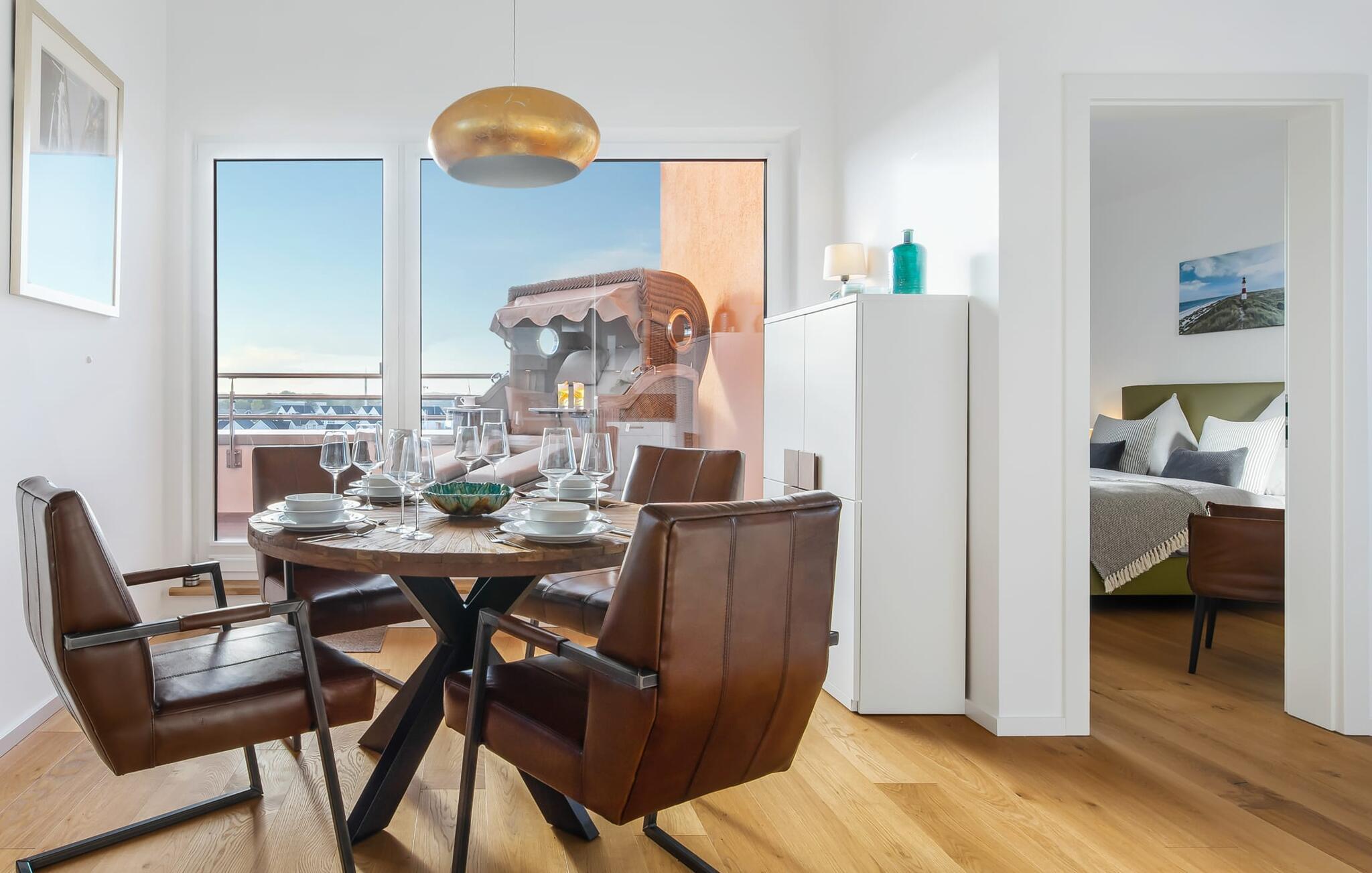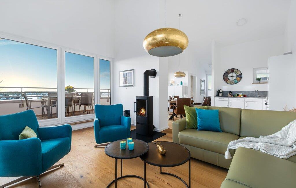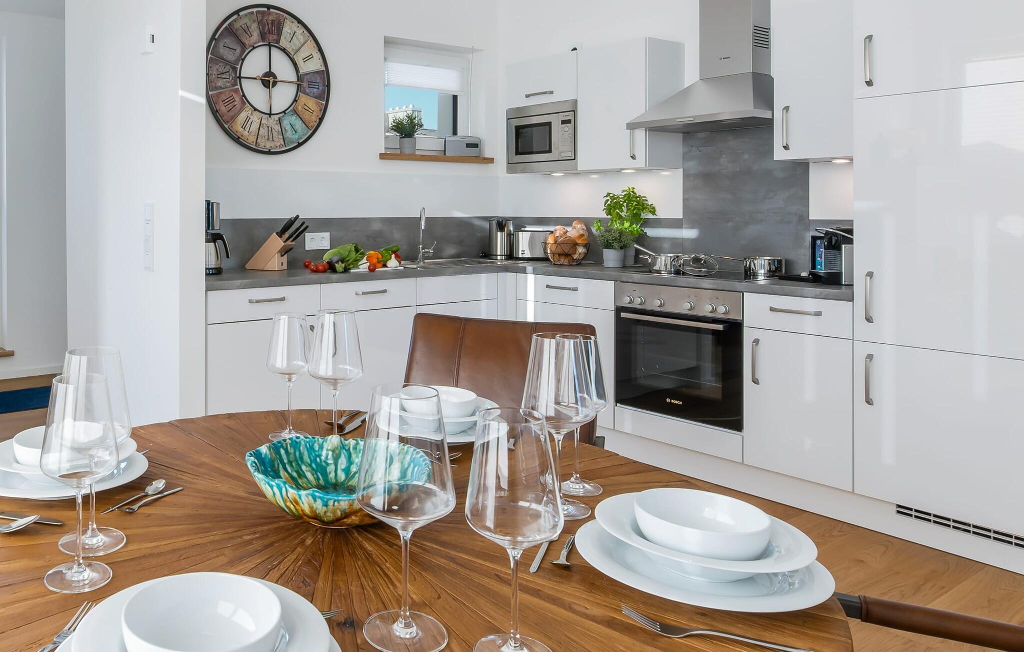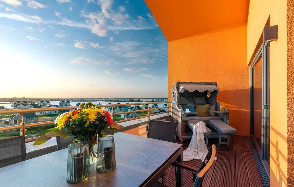 Penthouselejligheden MEERESTOCHTER inviterer sine gæster til en uforglemmelig ferie ved Østersøen. Bare et par minutters gang fra Weidenfelds sandstrand og Østersøen byder MEERESTOCHTER jer velkommen til sin rummelige og lyse stue/spisestue. Træd ind og kig straks gennem de gulv-til-loft-vinduer ud på sportsbådshavnen, slimets smukke mund med dets sømænd og naturreservatet og til siden den uendelige Østersø med dens bølger ! Den moderne og hyggelige indretning med deres kærligt designede maritime detaljer får jer hurtigt til at glemme hverdagen. Ud over fjernsyn og pejs til den køligere sæson, er alt der for at føles helt behageligt. Bluetooth musiksystemet sikrer den rigtige stemning med jeres yndlingsmusik. Og når I først har opdaget den komfortable L-formede sofa i stuen, vil I bestemt ikke rejse jer så hurtigt igen. Det integrerede åbne køkken er udstyret med alt, der ikke kun gør madlavningen nemmere, men også gør madlavningen sjov. Og hvad kunne være hyggeligere end at spise den tilberedte mad på den tilstødende rummelige loggia med udsigt til travlheden i lystbådehavnsområdet. Med den elektriske grill vil grillfans også få noget for pengene med udsigt til solnedgangen over Sleien, måske med et glas vin...? De to soveværelser har hver et fjernsyn og gulv til loft-vinduer. I kan vælge mellem en dobbelt boxmadras eller to enkelt boxmadrasser. Uanset hvilken beslutning I træffer, er I garanteret en afslappende søvn. Ydermere sikrer det perfekt udstyrede badeværelse med bruser i gulvniveau behagelig komfort. Der er også en elevator ved siden af opgangen, der bringer jer komfortabelt til jeres ferielejlighed på øverste etage. Da det næsten er obligatorisk at cykle i dette smukke landskab, er der en rummelig, aflåselig cykelkælder lige ved siden af den underjordiske parkeringsplads (indgangshøjde: 2m). Vores favoritsted: At sidde på loggiaen, kigge ud i det fjerne og lytte til bølgerne og vinden... Bemærk venligst: OstseeResort Olpenitz er meget populært, og der bygges fortsat i parken. Ikke desto mindre kan I se frem til en 5-stjernet standard og et førsteklasses ophold. Byggeaktiviteterne kommer ikke til at forstyrre jer på ferien, og derfor gives der ikke yderligere afslag i prisen.