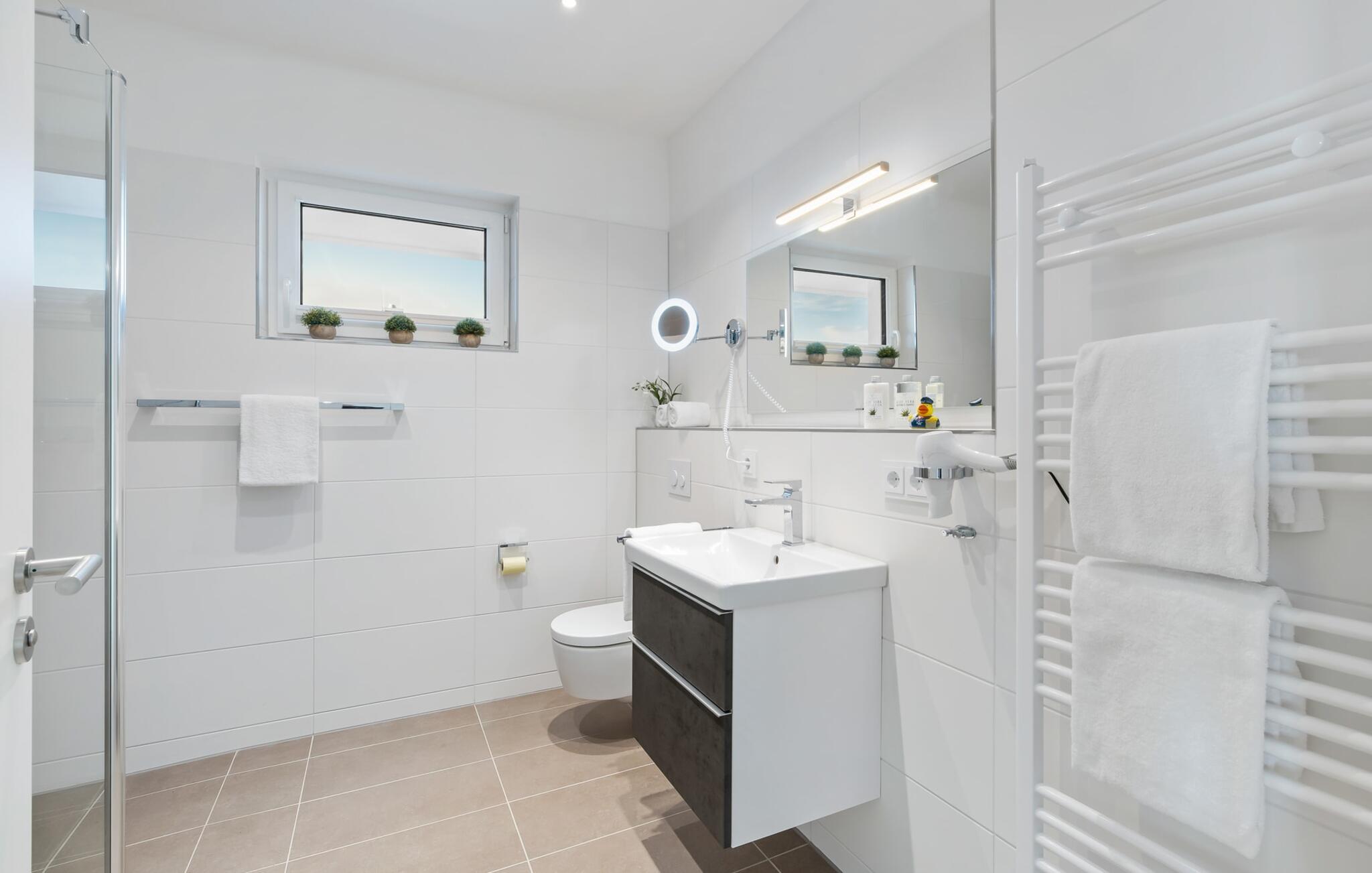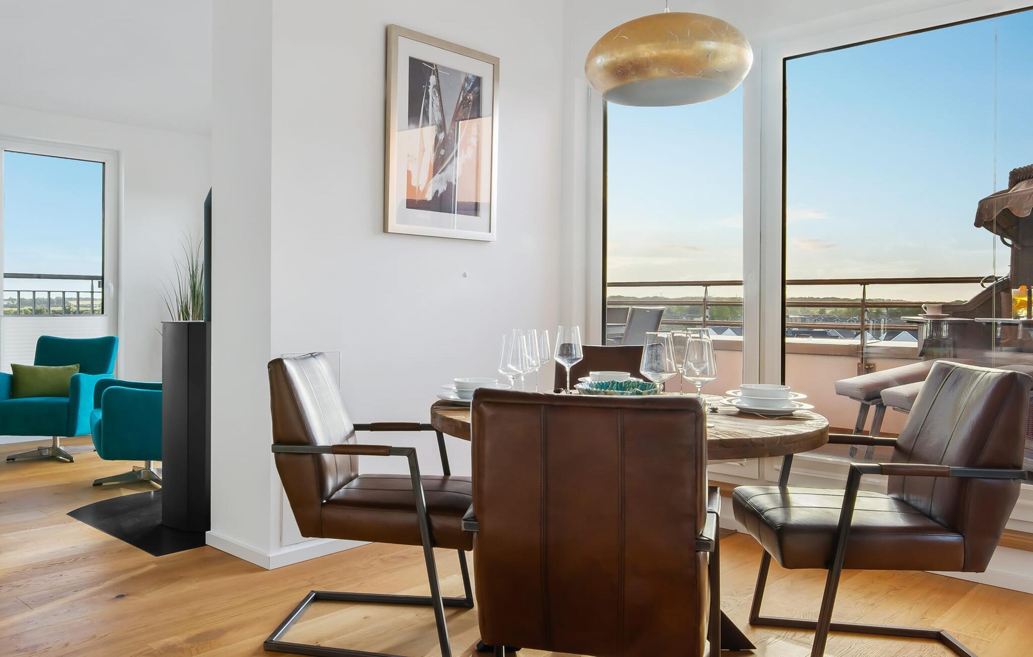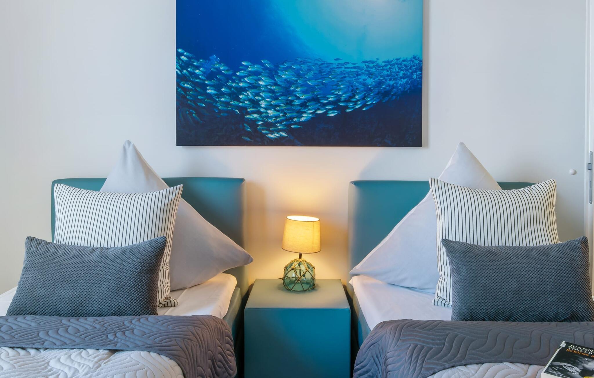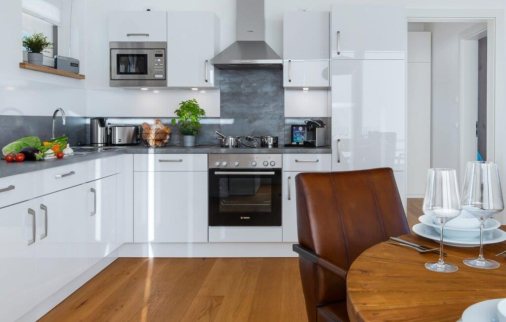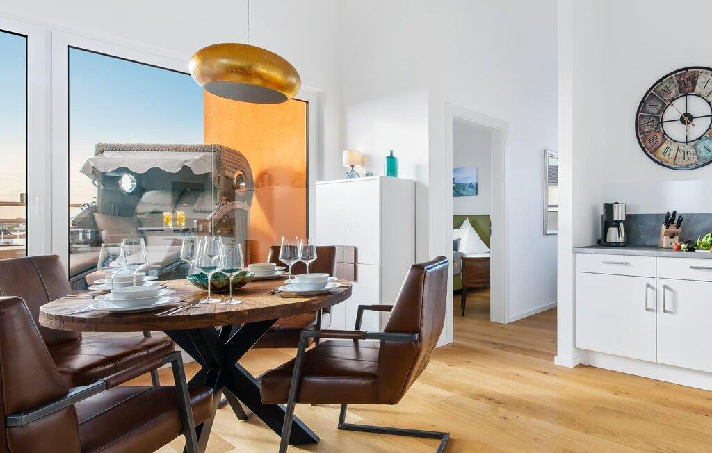 Penthouselejligheden MEERESTOCHTER inviterer sine gæster til en uforglemmelig ferie ved Østersøen. Bare et par minutters gang fra Weidenfelds sandstrand og Østersøen byder MEERESTOCHTER jer velkommen til sin rummelige og lyse stue/spisestue. Træd ind og kig straks gennem de gulv-til-loft-vinduer ud på sportsbådshavnen, slimets smukke mund med dets sømænd og naturreservatet og til siden den uendelige Østersø med dens bølger ! Den moderne og hyggelige indretning med deres kærligt designede maritime detaljer får jer hurtigt til at glemme hverdagen. Ud over fjernsyn og pejs til den køligere sæson, er alt der for at føles helt behageligt. Bluetooth musiksystemet sikrer den rigtige stemning med jeres yndlingsmusik. Og når I først har opdaget den komfortable L-formede sofa i stuen, vil I bestemt ikke rejse jer så hurtigt igen. Det integrerede åbne køkken er udstyret med alt, der ikke kun gør madlavningen nemmere, men også gør madlavningen sjov. Og hvad kunne være hyggeligere end at spise den tilberedte mad på den tilstødende rummelige loggia med udsigt til travlheden i lystbådehavnsområdet. Med den elektriske grill vil grillfans også få noget for pengene med udsigt til solnedgangen over Sleien, måske med et glas vin...? De to soveværelser har hver et fjernsyn og gulv til loft-vinduer. I kan vælge mellem en dobbelt boxmadras eller to enkelt boxmadrasser. Uanset hvilken beslutning I træffer, er I garanteret en afslappende søvn. Ydermere sikrer det perfekt udstyrede badeværelse med bruser i gulvniveau behagelig komfort. Der er også en elevator ved siden af opgangen, der bringer jer komfortabelt til jeres ferielejlighed på øverste etage. Da det næsten er obligatorisk at cykle i dette smukke landskab, er der en rummelig, aflåselig cykelkælder lige ved siden af den underjordiske parkeringsplads (indgangshøjde: 2m). Vores favoritsted: At sidde på loggiaen, kigge ud i det fjerne og lytte til bølgerne og vinden... Bemærk venligst: OstseeResort Olpenitz er meget populært, og der bygges fortsat i parken. Ikke desto mindre kan I se frem til en 5-stjernet standard og et førsteklasses ophold. Byggeaktiviteterne kommer ikke til at forstyrre jer på ferien, og derfor gives der ikke yderligere afslag i prisen.