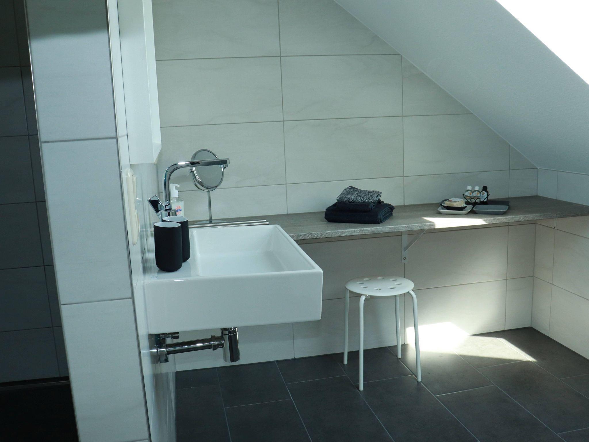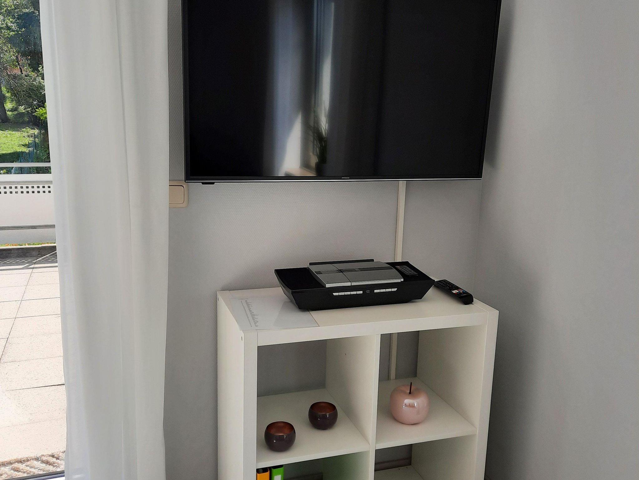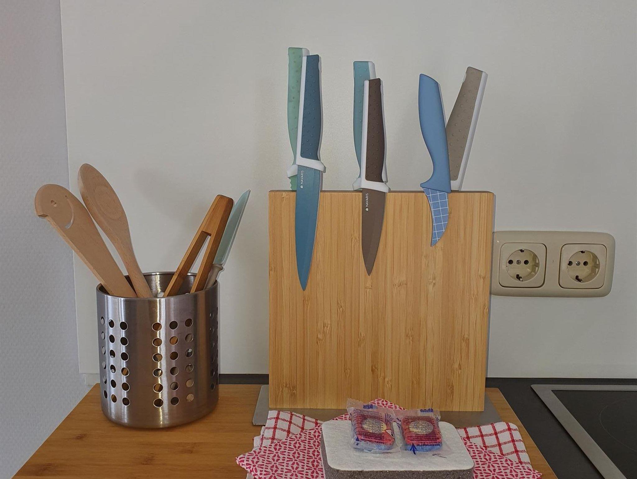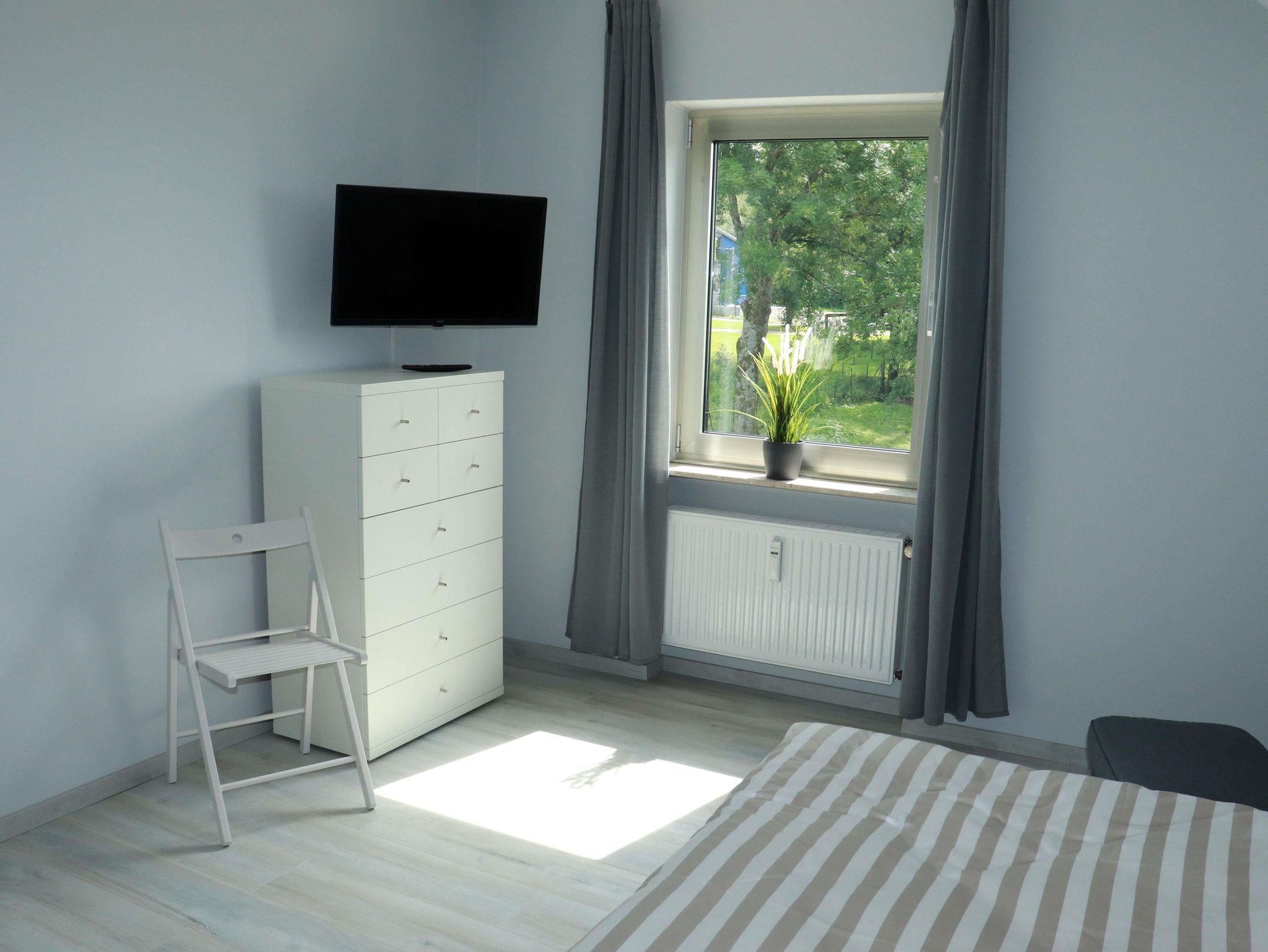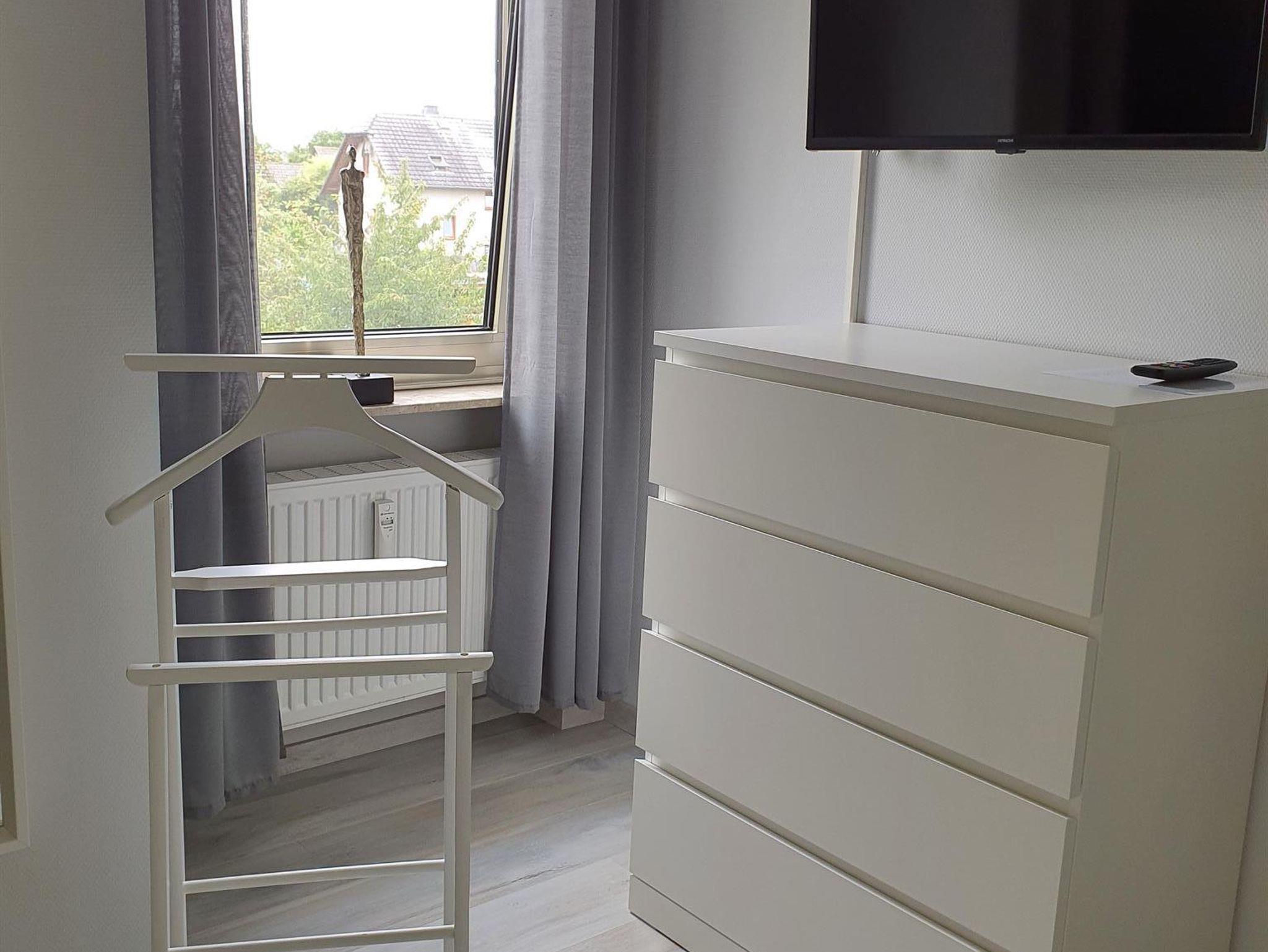 Die FeWo erstreckt sich über zwei Stockwerke. Der Eingangsbereich empfängt die Gäste und führt über eine offene Treppe in die zweite Etage. Im unteren Stockwerk befinden sich eine Gästetoilette, ein Hauswirtschaftsraum, ein Wohn- Essraum und eine offene Küche. Sowohl die Küche als auch der Wohnraum bieten die Möglichkeit, den Balkon zu begehen. Auf der zweiten Etage sind zwei Schlafzimmer, eines mit einem Boxspringbett möbliert, das andere mit zwei Einzelbetten. Ein großer Ankleideraum ist vorhanden. Das Badezimmer verfügt über eine begehbare Dusche. Für Autos und Räder gibt es Stellplätze.