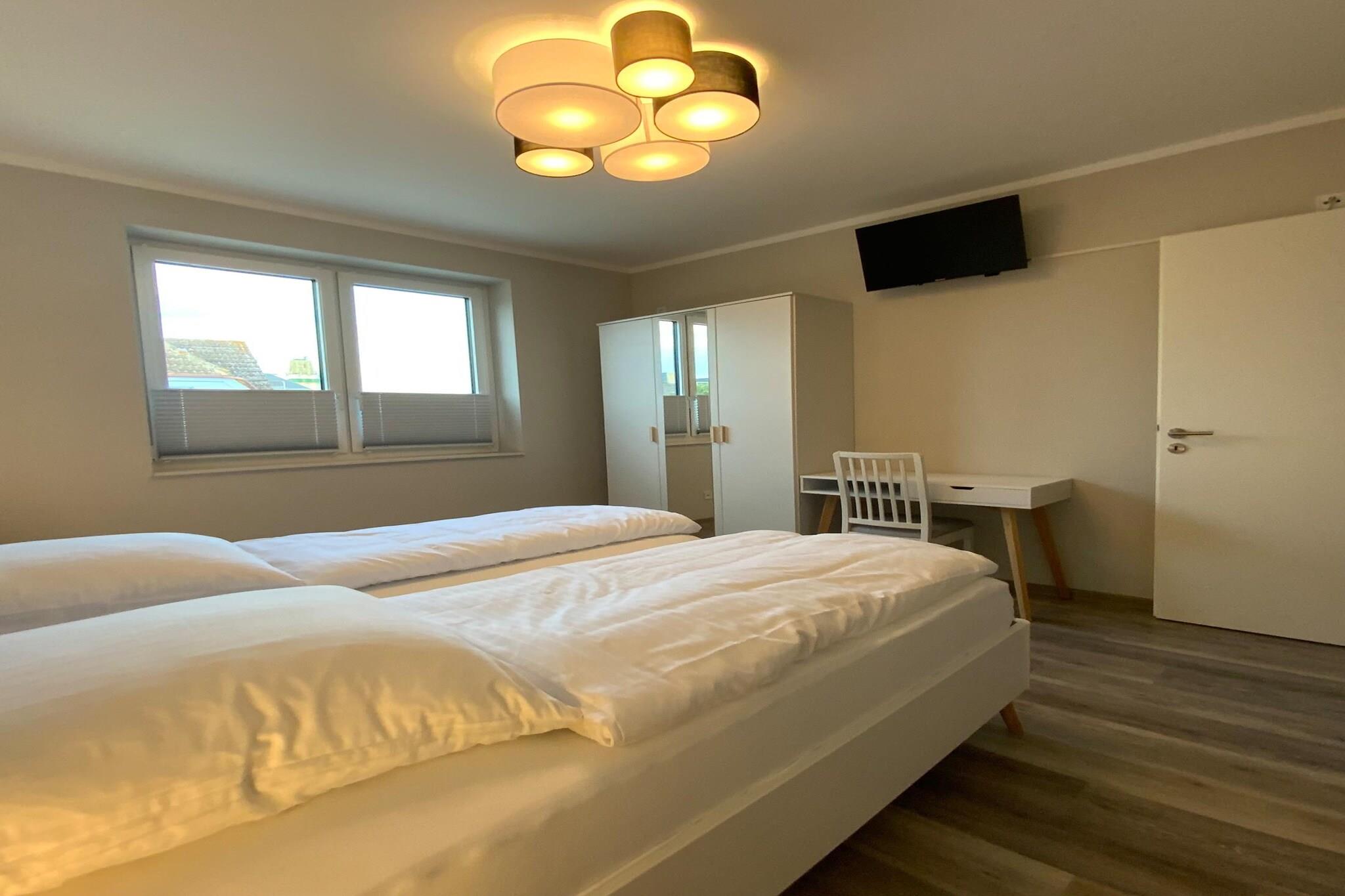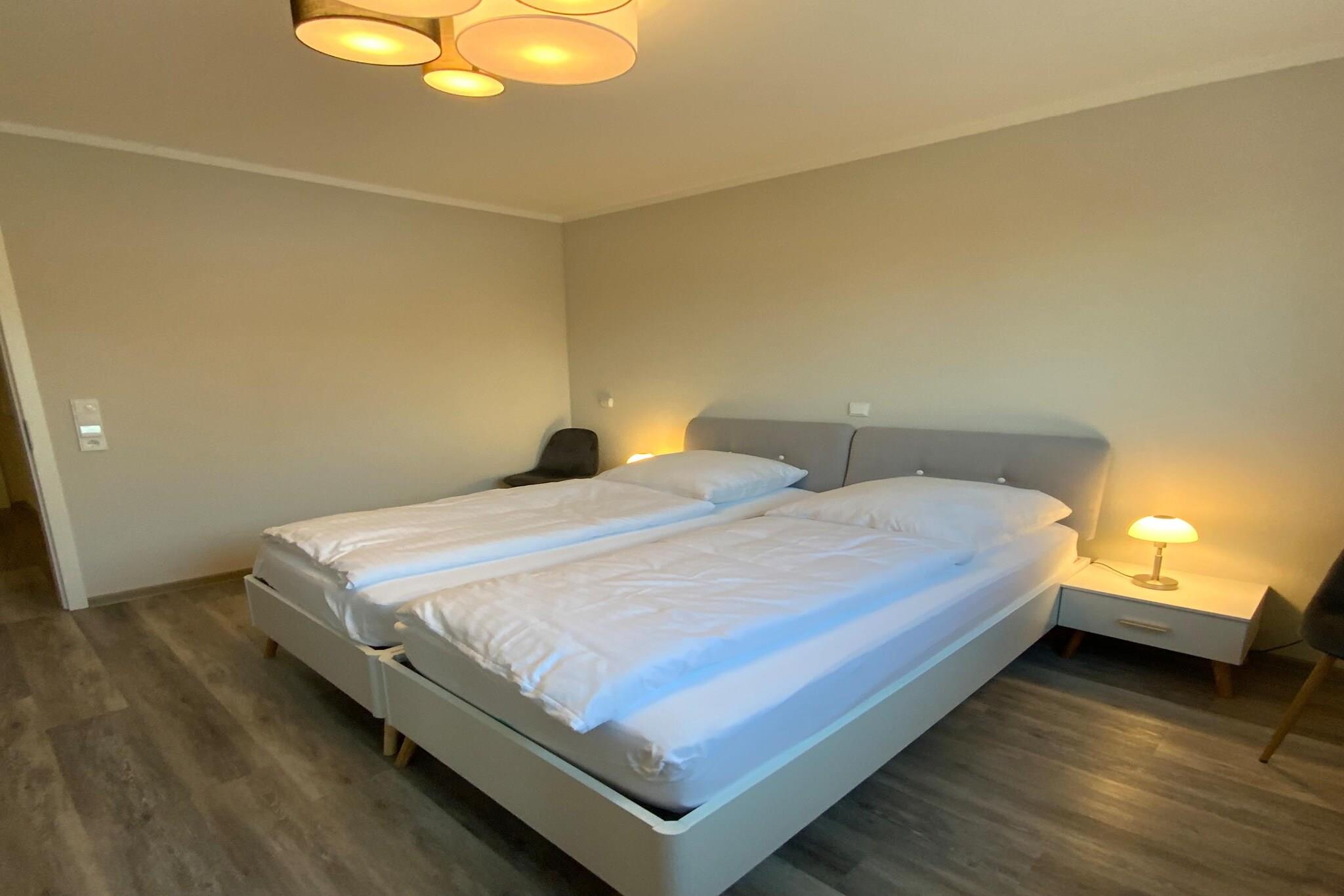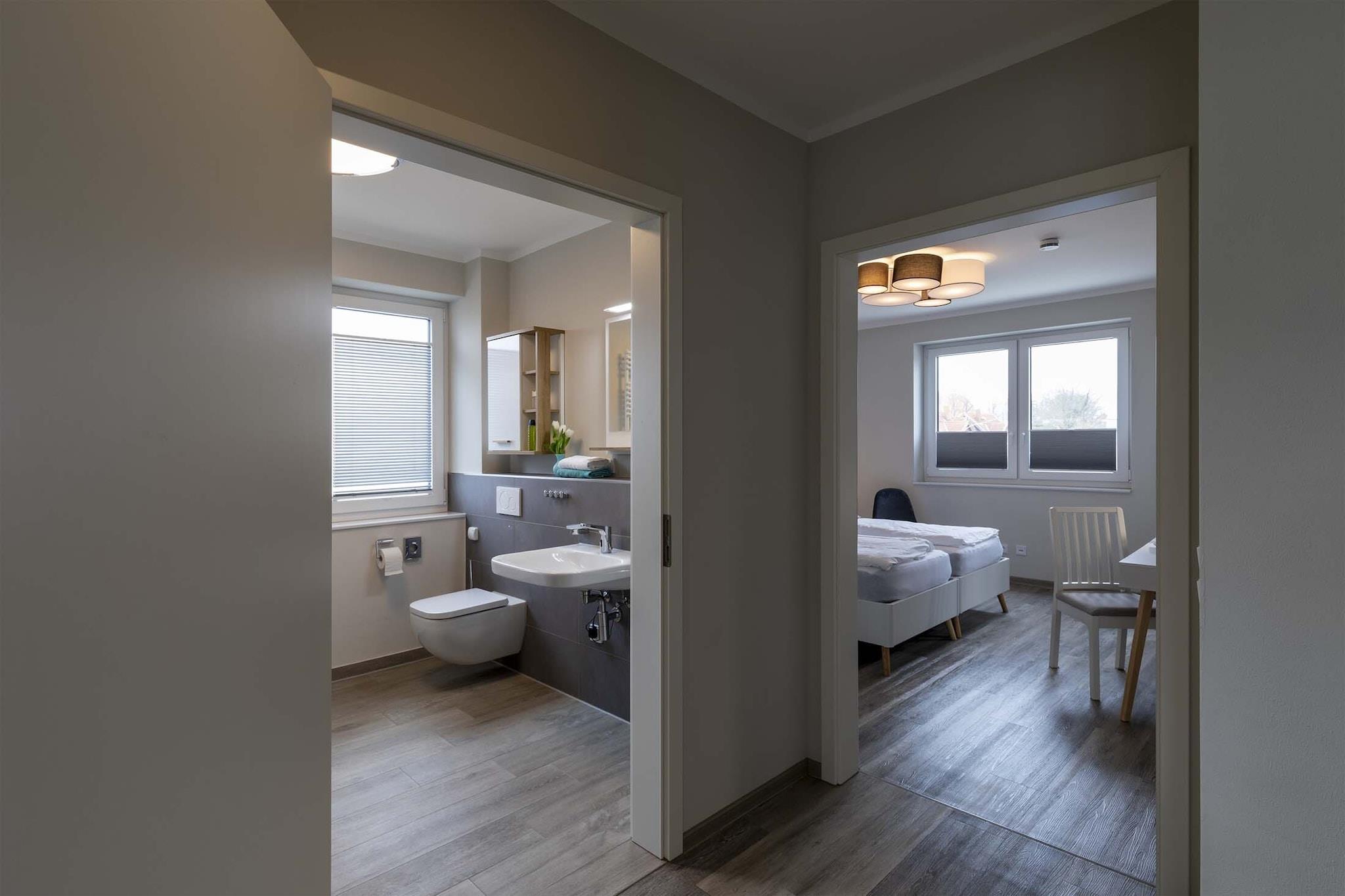 Du vil føle dig hjemme i vores smukke og moderne ferielejlighed på 86 m² - prøv det! Den nye "Vespucci" ferielejlighed ligger på 1. sal i etageejendommen og har takket være sin tilgængelighed en bred indgangsdør på ca 90 cm. Rumdørene har også denne generøse bredde. Lejligheden kan nås via trapper eller elevatoren, og der er parkeringsplads lige foran huset. En smagfuld, lysfyldt, moderne og venlig atmosfære venter på dig. Du vil føle kærligheden til detaljerne fra første sekund, og opholdet i denne fantastiske ferielejlighed vil få dig til at glemme hverdagen. Lejligheden har en rummelig stue med sovesofa og et stort 55" Smart TV samt soundbar. Lige ved siden af stuen ligger det skræddersyede åbne køkken, der er udstyret med service og husholdningsapparater. intet tilbage at ønske for entusiastiske kokke Lejligheden har en rummelig altan, hvor du kan nyde din morgenmad eller afslutte dagen. Hvis vejret ikke er til din smag, kan du også nyde aftenen foran det hyggelige og romantiske pejs i stuen. Alle senge har madrasser af høj kvalitet, som har en blød og en hårdere side. Det store soveværelse har en dobbeltseng og et 32" Smart TV. Det andet soveværelse har også et 32" Smart TV og 2 enkeltsenge. Badeværelset scorer med en walk-in, bred bruser, som du kan komme ind gennem en 1,20 m bred dør. Højdepunkter inkluderer: Alle forbrugsbaserede energiomkostninger WLAN parkeringsplads elevator i den vestlige del af den smukke ø Femern. Stranden i Bojendorf er omkring 3 km væk. De næste større butikker er omkring 400 m væk med forskellige butikker, Supe