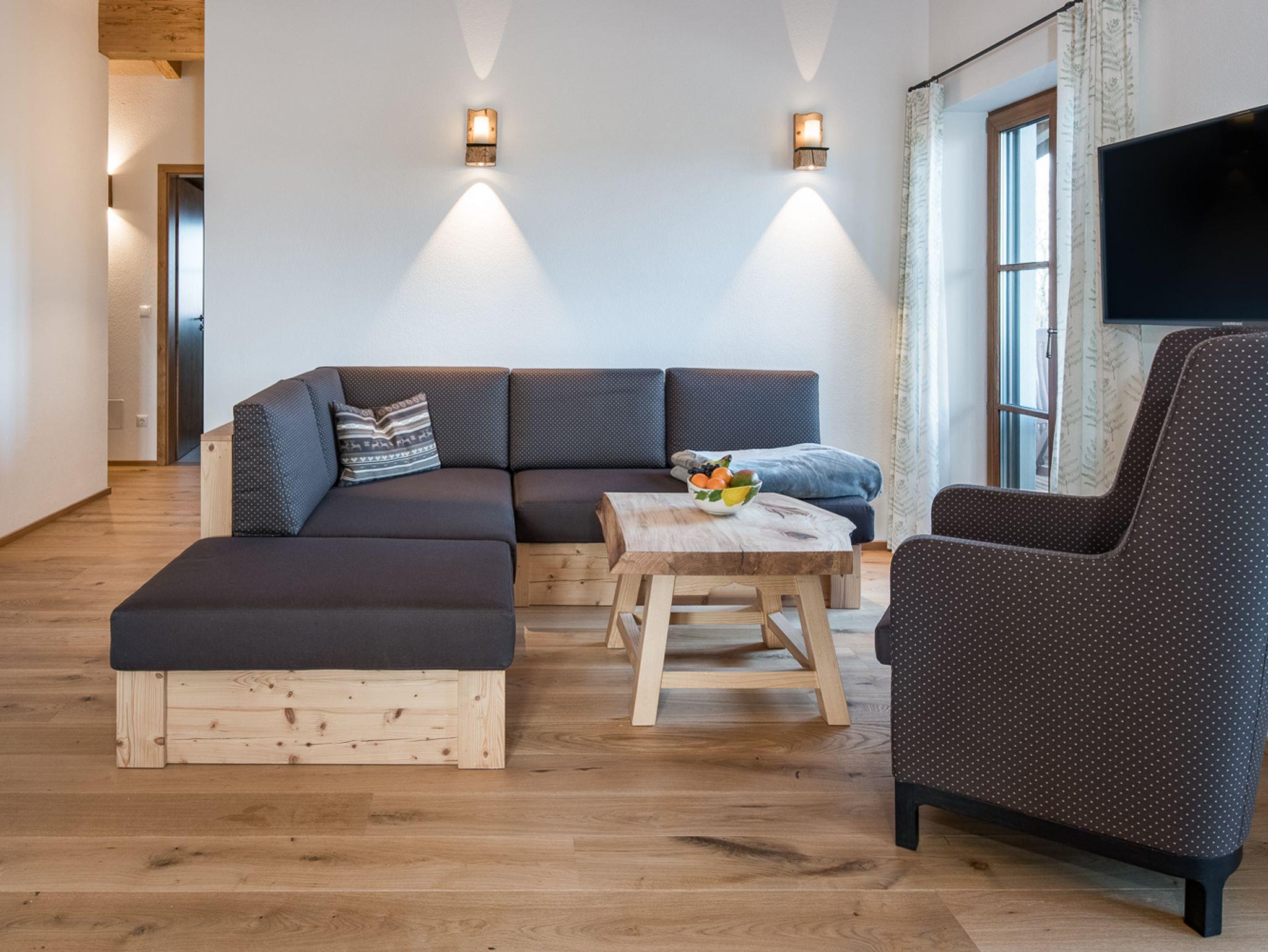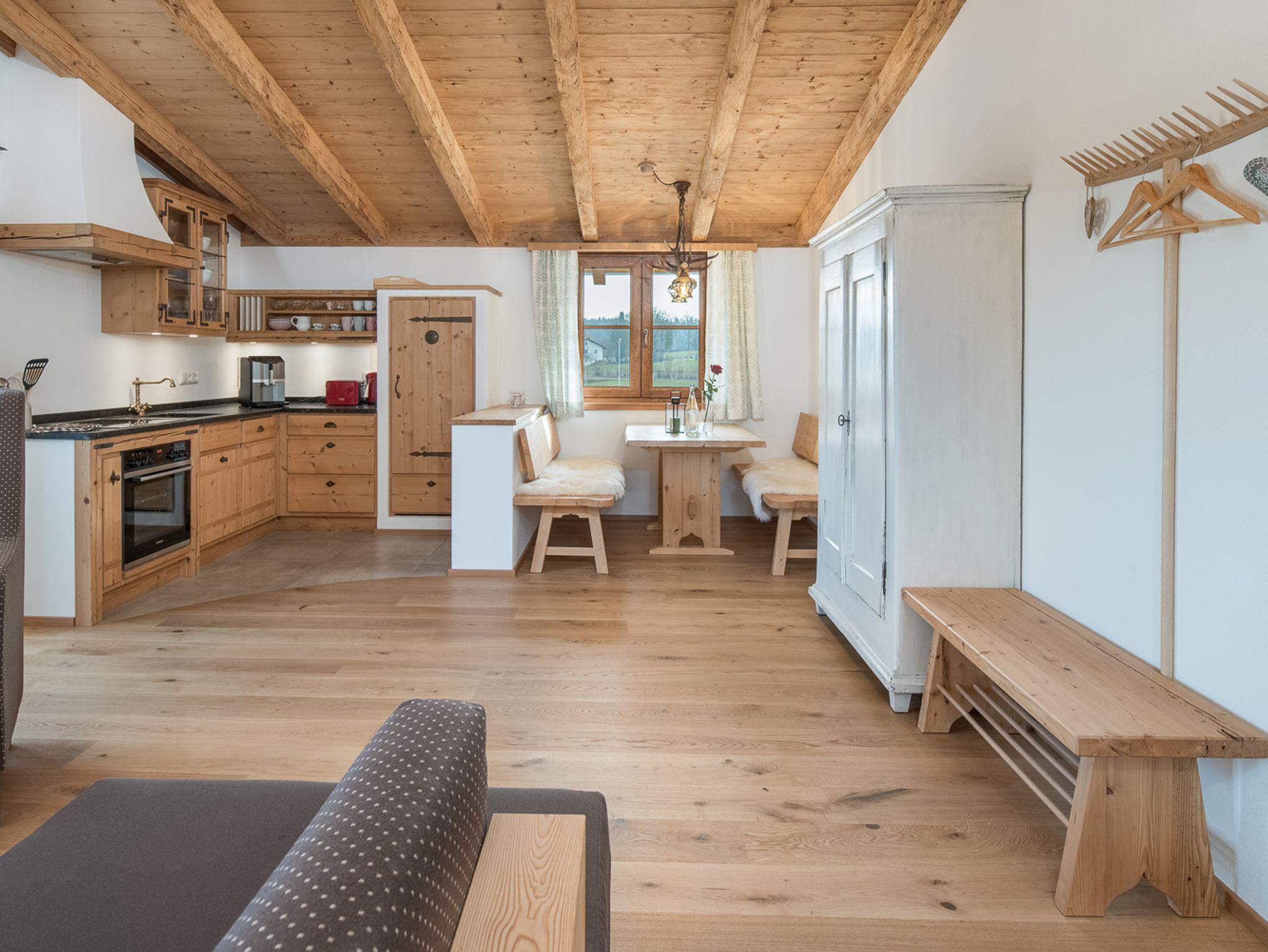 Ferienwohnung im 2. Stock (Lift) mit moderner, exklusiver Einrichtung und einem beeindruckendem Altholz-Sichtdachstuhl und großem Balkon (14qm) mit Panoramablick.