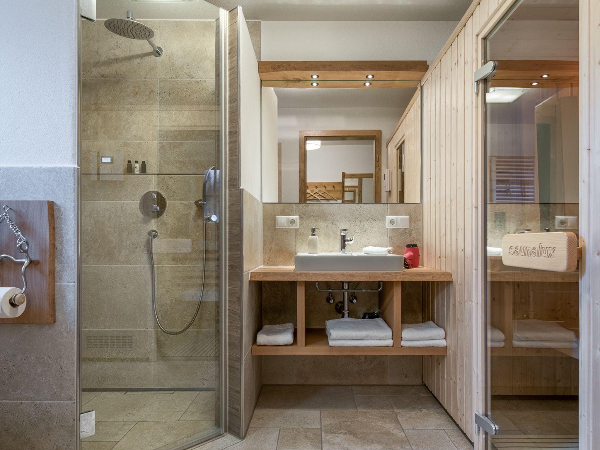 Ferienwohnung mit moderner, exklusiver Eichenholzeinrichtung im Landhausstil. Exklusive Terrasse und Balkon mit Bergblick.