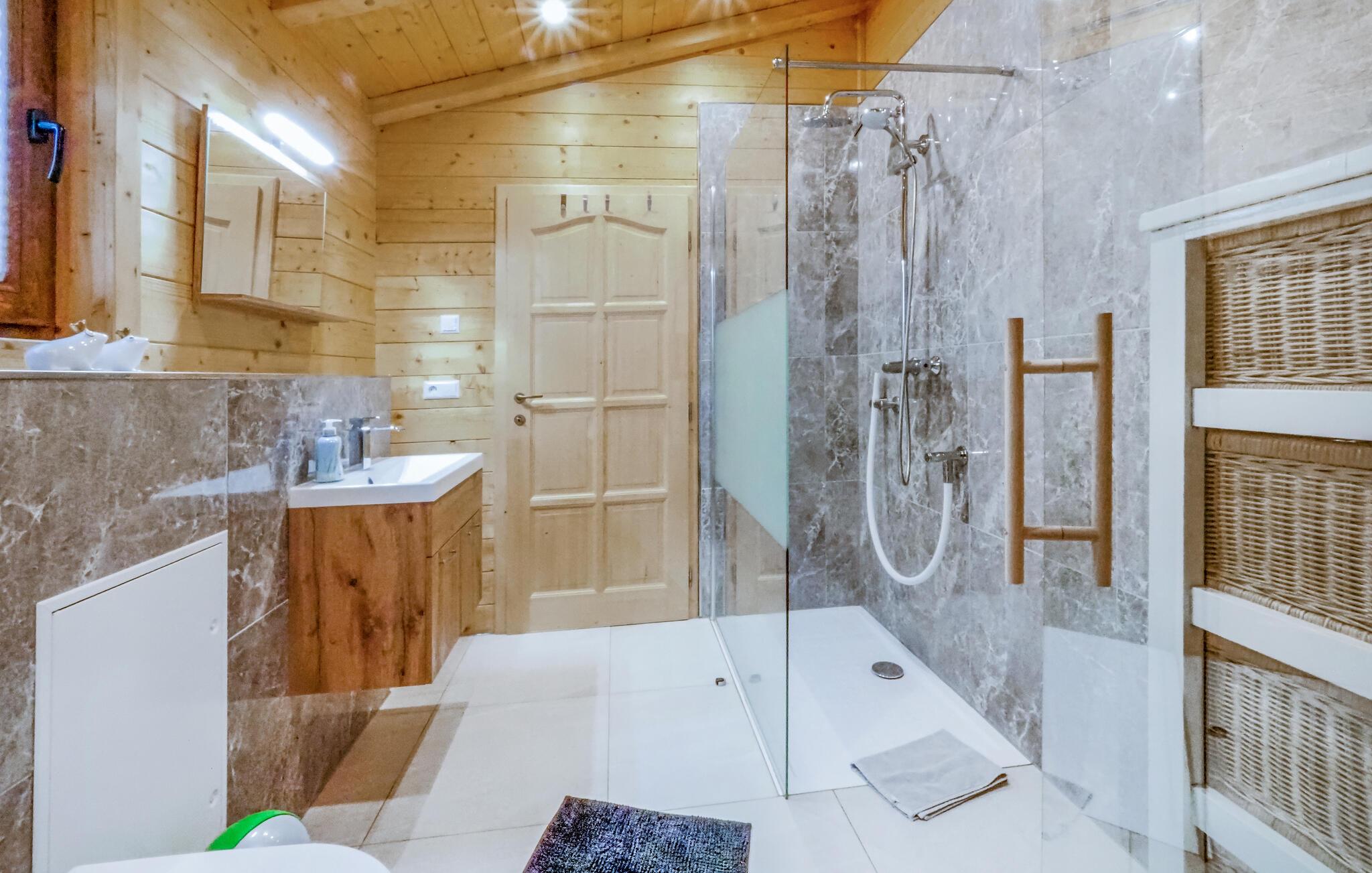 Dette attraktive træhus har en helt fantastisk beliggenhed i naturskønne omgivelser i Gräfensteiner Land. Huset er virkelig hyggeligt indrettet med tydelige træpaneler- og gulve, som sammen med de moderne faciliteter og komfortable møbler danner de perfekte rammer for et afslappende ophold. Se frem til hyggelige fællesmåltider med en skøn udsigt og til hyggelige filmaftener i den bløde sofa. Og måske I skal hvile stængerne i saunaen efter en aktiv feriedag i naturen?