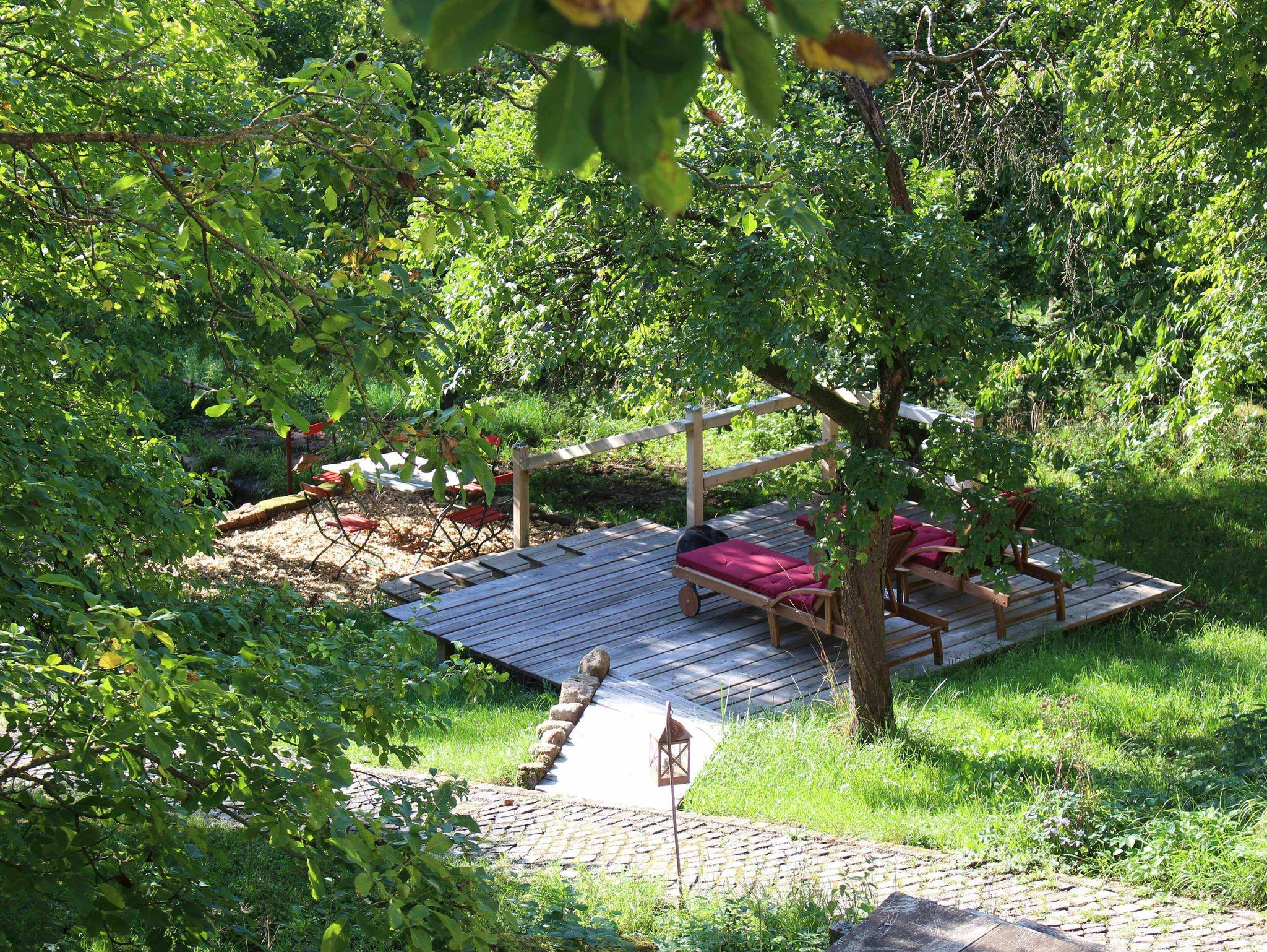 Finden Sie Ruhe und Erholung inmitten idyllischer Natur und eine romantische Ferienwohnung in einem besonderen Haus voller Geschichte (n). Ihr eigener Eingang über eine Empore mit einer schnuckeligen Sitzgelegenheit führt Sie in Ihr zu Hause auf Zeit. Fühlen Sie sich sofort wohl in einem gemütlichen Wohnzimmer mit voll ausgestatteter Küche und einem Schwedenofen für behagliche Wärme. Vom Schlafzimmer aus schweift der Blick über die Wiesen und Ihre Sonnenterrasse im Garten bis hin zur Burg Altenstein. Beschließen Sie den Tag mit einem entspannenden Bad unter offenem Fachwerk.