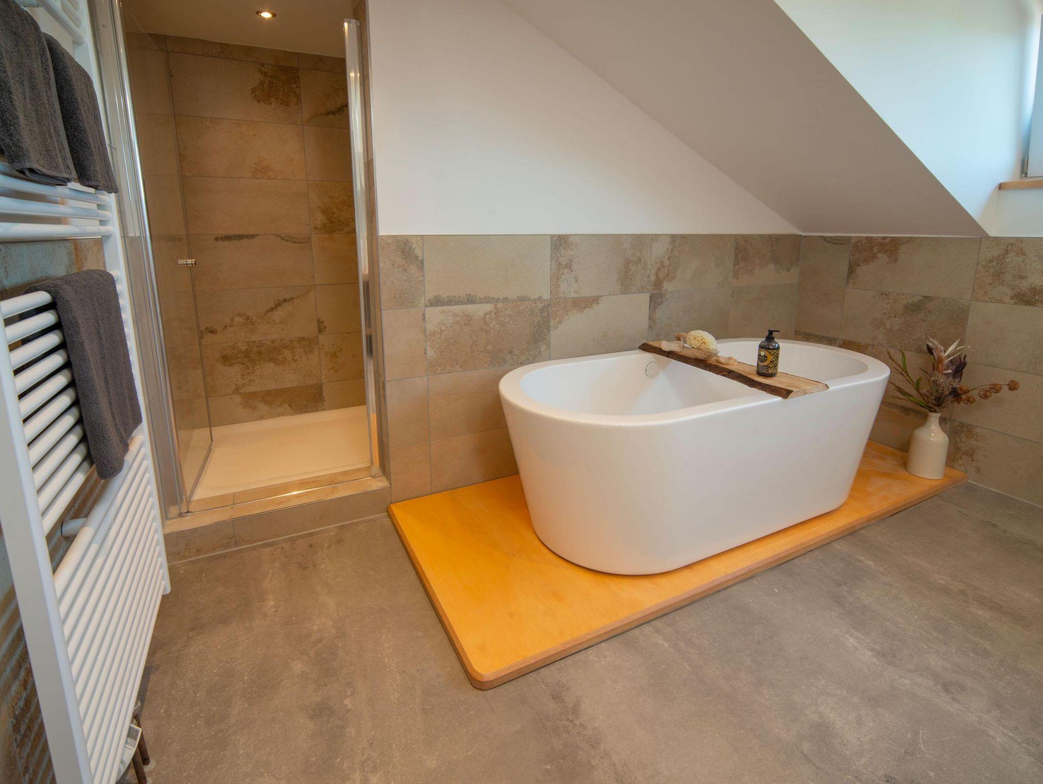 • Bad mit Dusche, freistehender Badewanne und Föhn