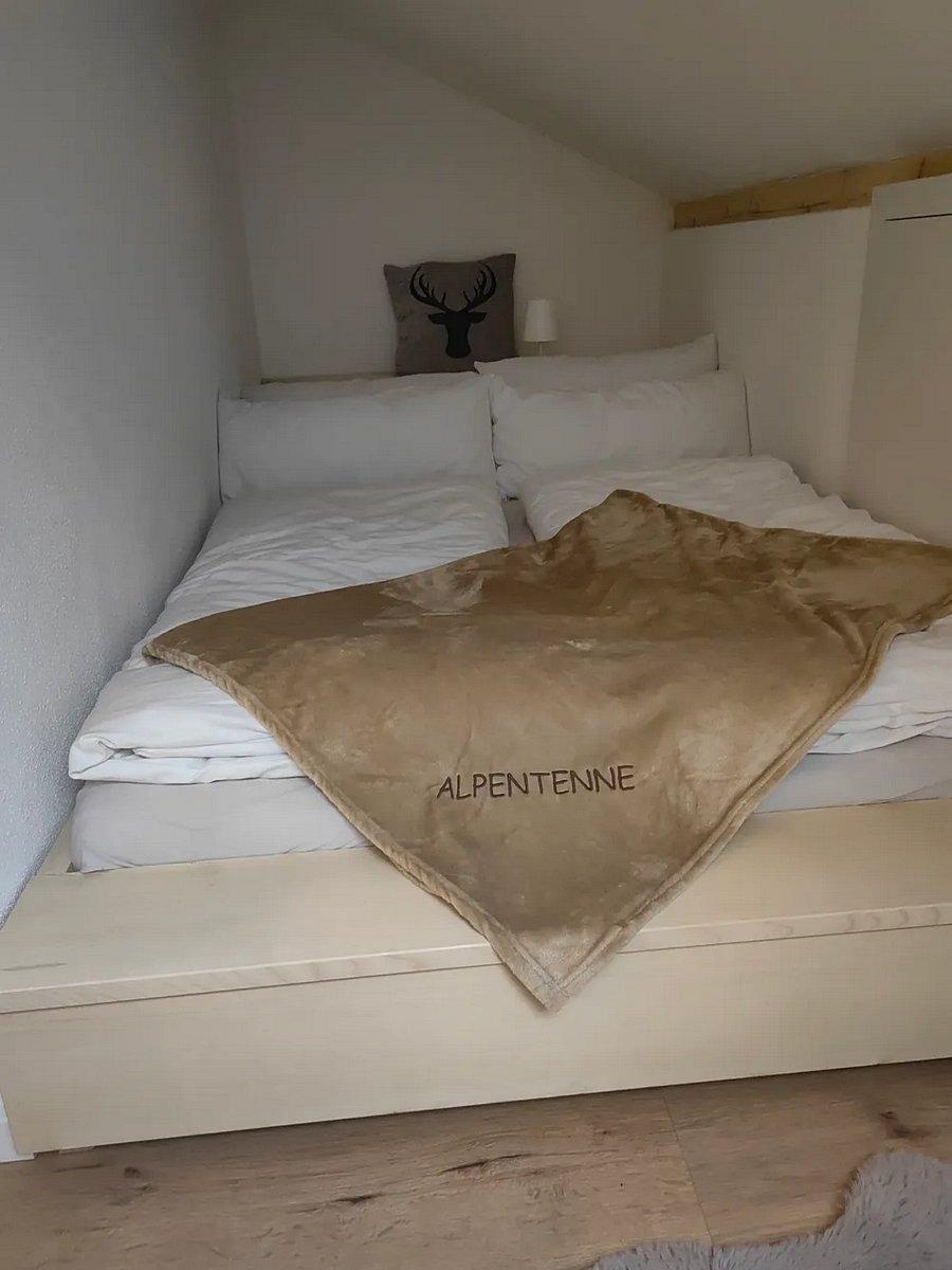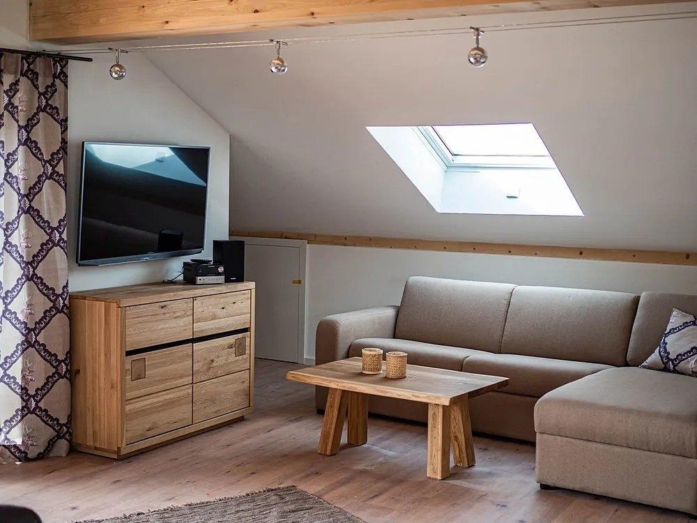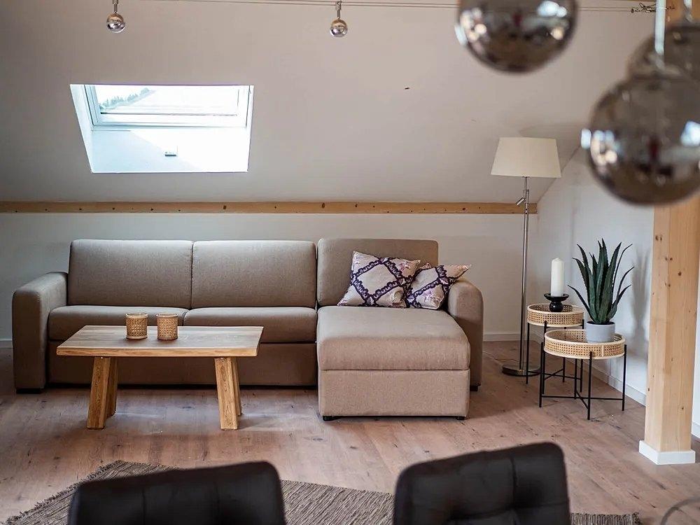 83 qm Zweizimmerwohnung im Dachgeschoss mit einem Schlafzimmer mit Zirbenholzbett und einer vollwertigen Schlafcouch mit einer Matratze im Wohnzimmer.