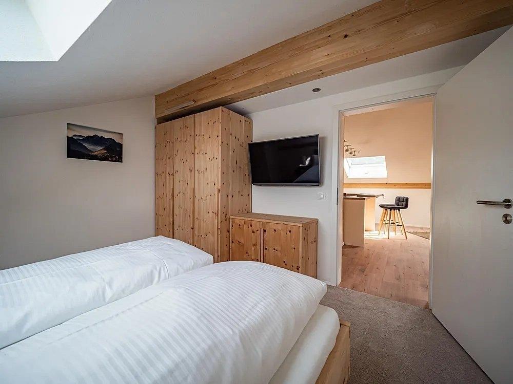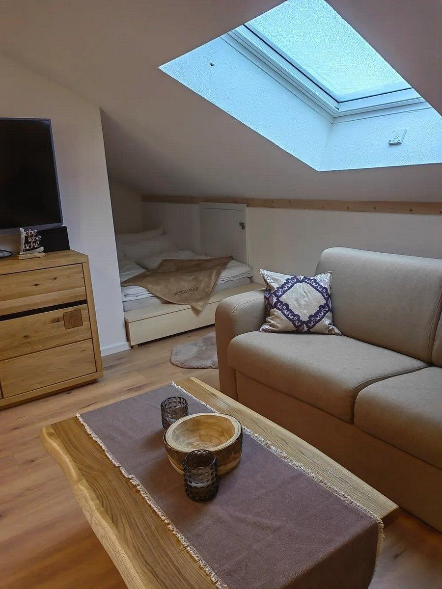 Zweizimmerwohnung im Dachgeschoss mit einem Schlafzimmer mit Zirbenholzbett und einer vollwertigen Schlafcouch mit einer Matratze im Wohnzimmer.