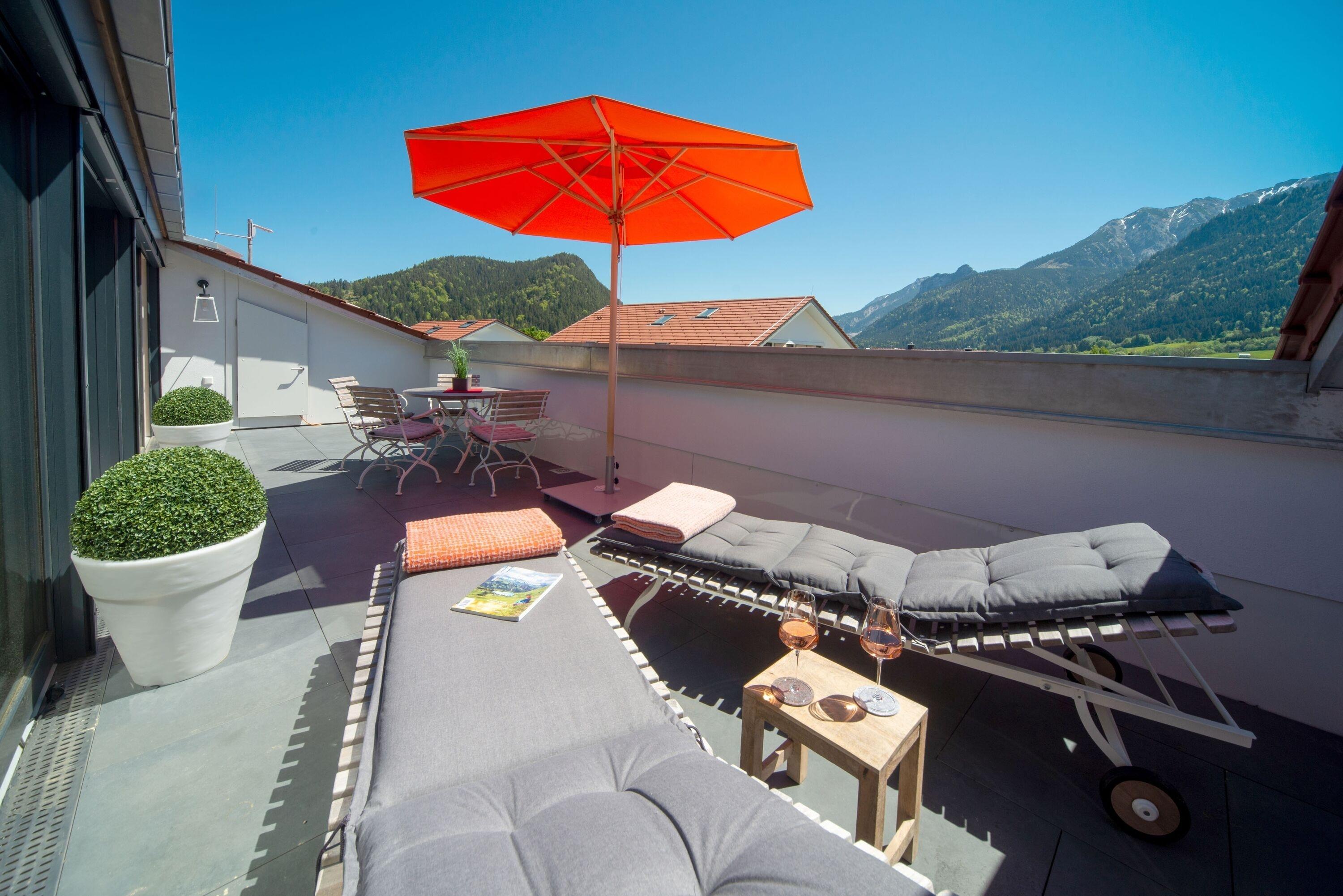 Tauchen Sie ein in den ultimativen Luxus dieser außergewöhnlichen 4 Zimmer-Penthouse-Ferienwohnung mit 137 m² im exquisiten Chalet-Style. Mit drei Doppelschlafzimmern und ebenso vielen eleganten Badezimmern bieten wir Ihnen bis max. 6 Personen einen unvergleichlichen Komfort und Privatsphäre, die Sie verdienen. Jeder Raum ist mit raffinierter Eleganz gestaltet, von den hochwertigen Möbeln bis hin zu den stilvollen Details. Entspannen Sie im großzügigen Wohn-Ess-Bereich und genießen Sie dabei die herrliche Aussicht. Erleben Sie Ihren ganz persönlichen Rückzugsort auf der 20 qm großen, uneinsehbarer Süd-Dachterrasse, die sich bequem über die Panorama-Schiebefront öffnet. Genießen Sie die warme Sonne auf den komfortablen Liegestühlen, während Sie den atemberaubenden Panorama-Bergblick bewundern. Diese großzügige Ferienwohnung vereint luxuriösen Komfort mit alpinem Charme – perfekt für alle, die Ruhe, Qualität und Natur lieben. Wohnen in bester Lage. Zwei reservierte Tiefgaragenplätze und ein privater Aufzug bringen Sie bequem und sicher direkt in Ihre Wohnung.