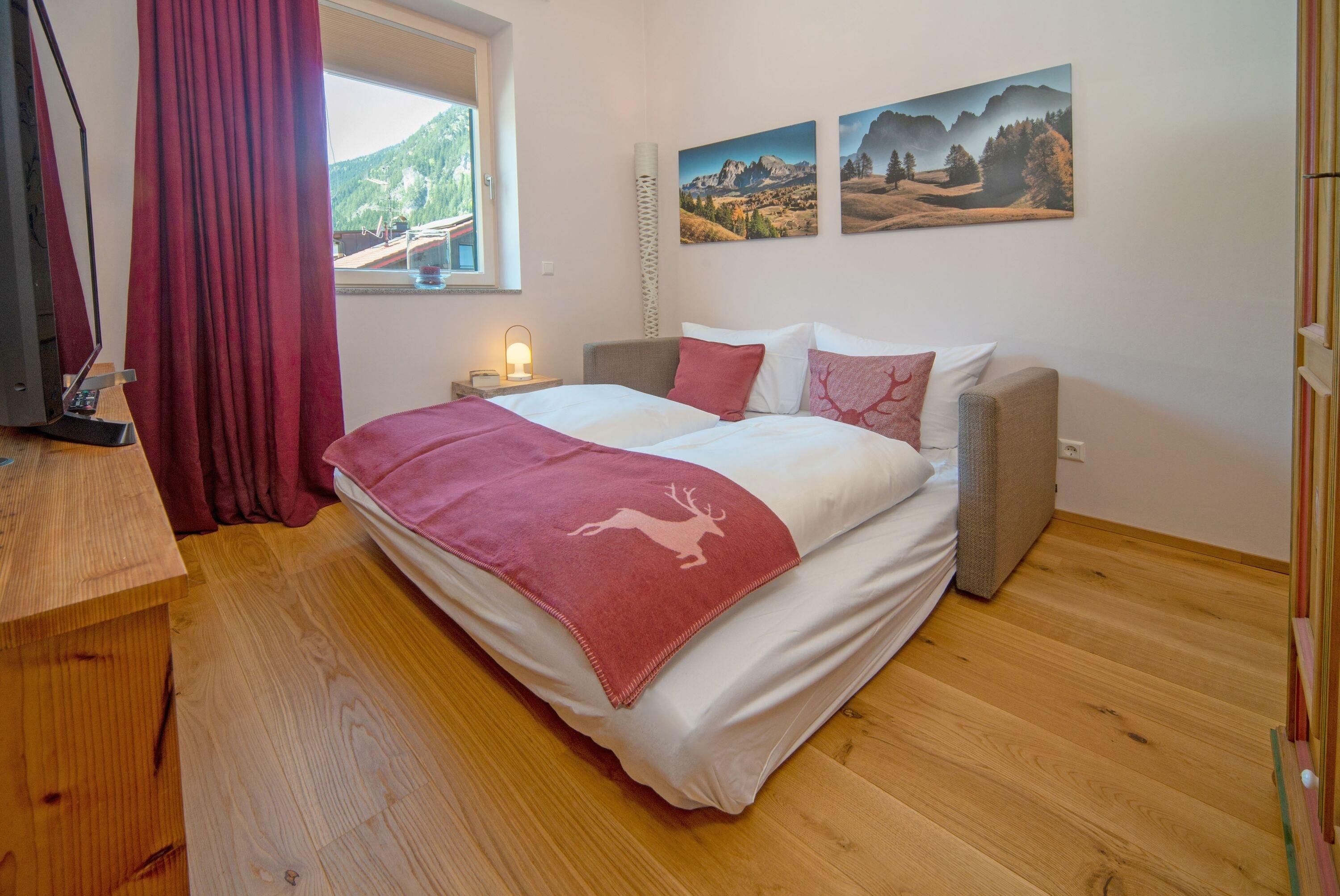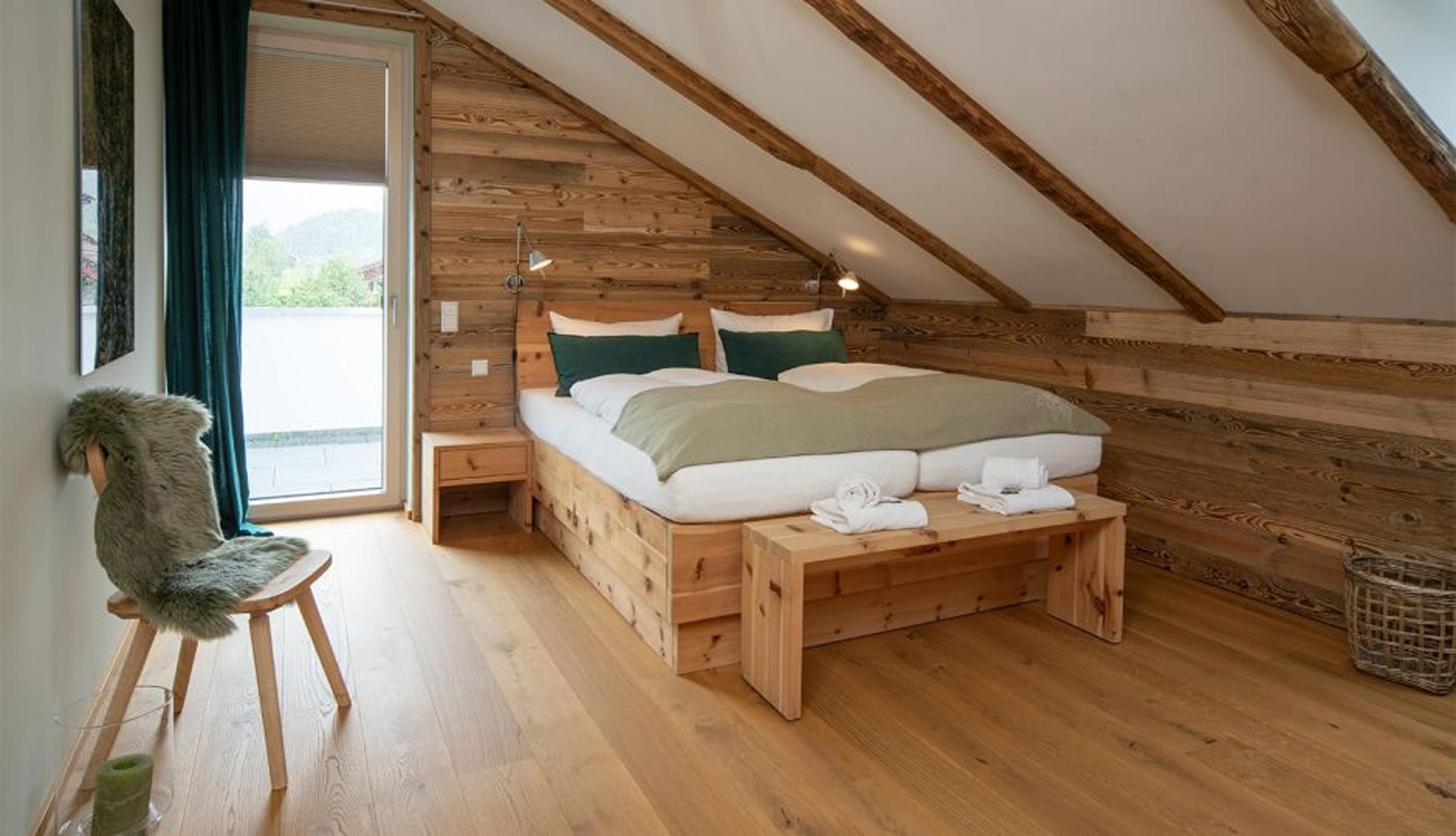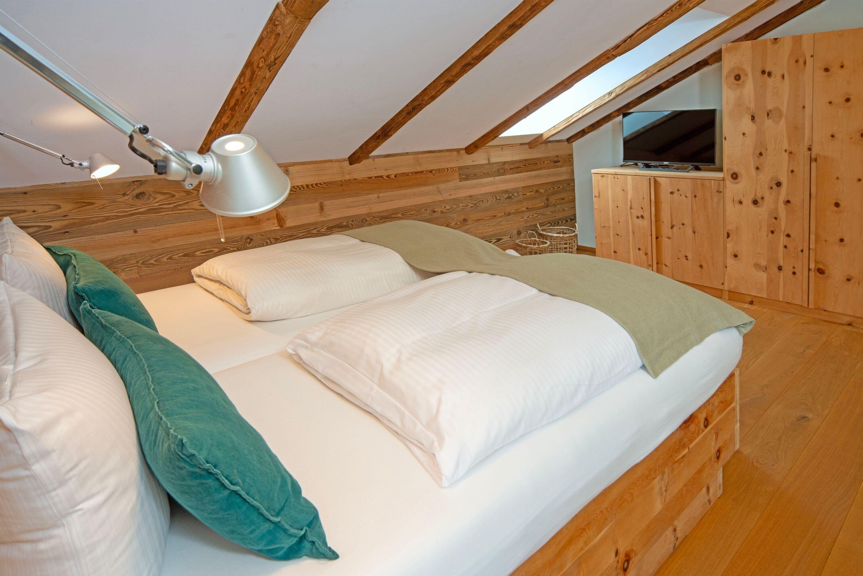 2 Zirbenholz-Doppelschlafzimmer (180x200) mit vom Schreiner gefertigte Zirben-Boxspringbetten auf höchstem Komfort, Zirben-Kleiderschrank, Kommode, Smart-TV und Verdunkelungsmöglichkeit durch Fensterläden/Plissees