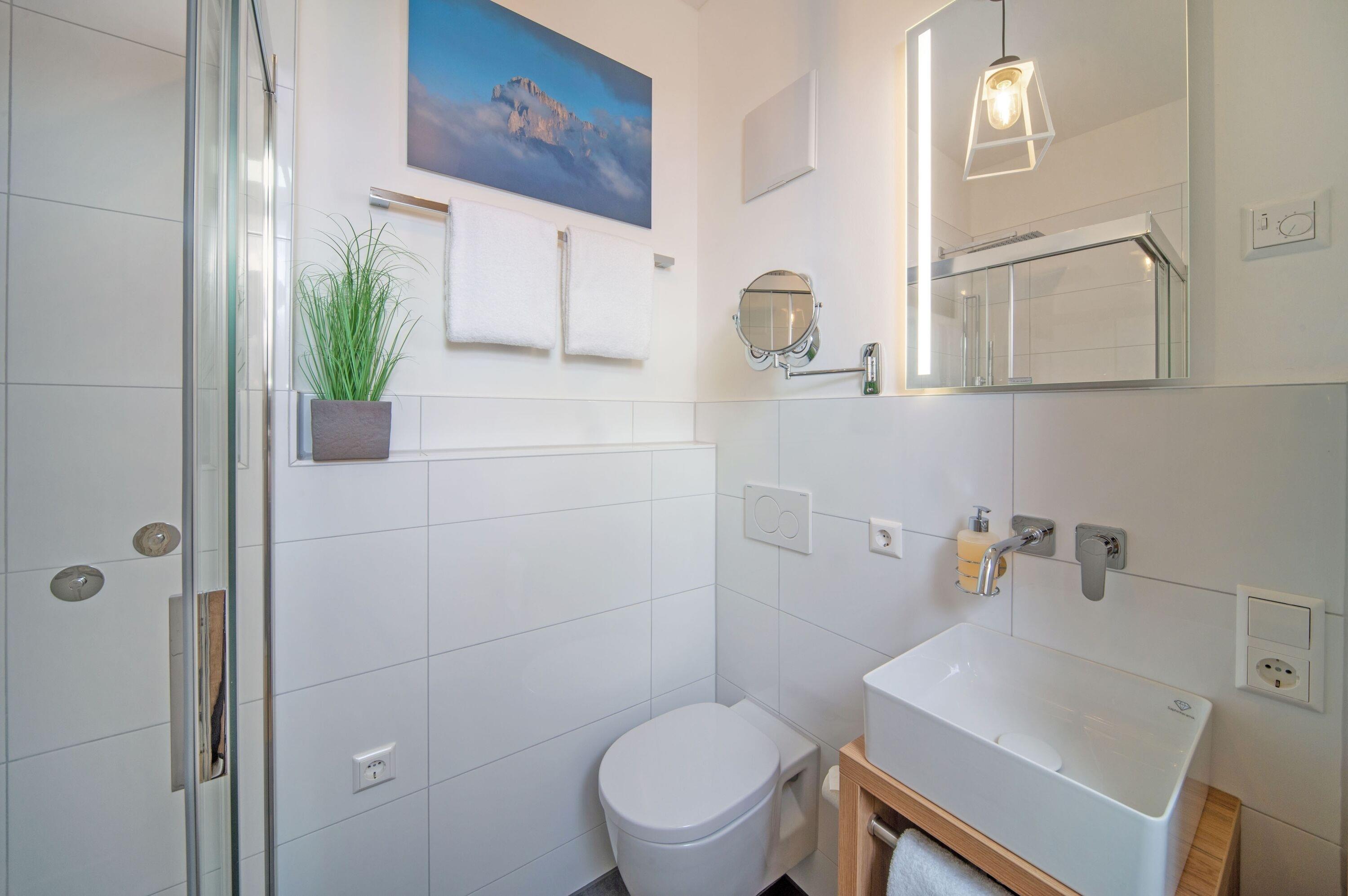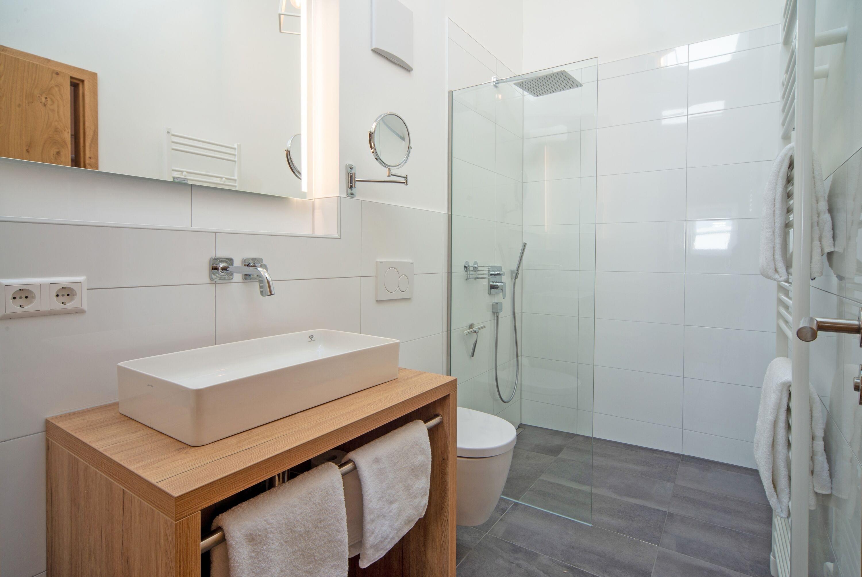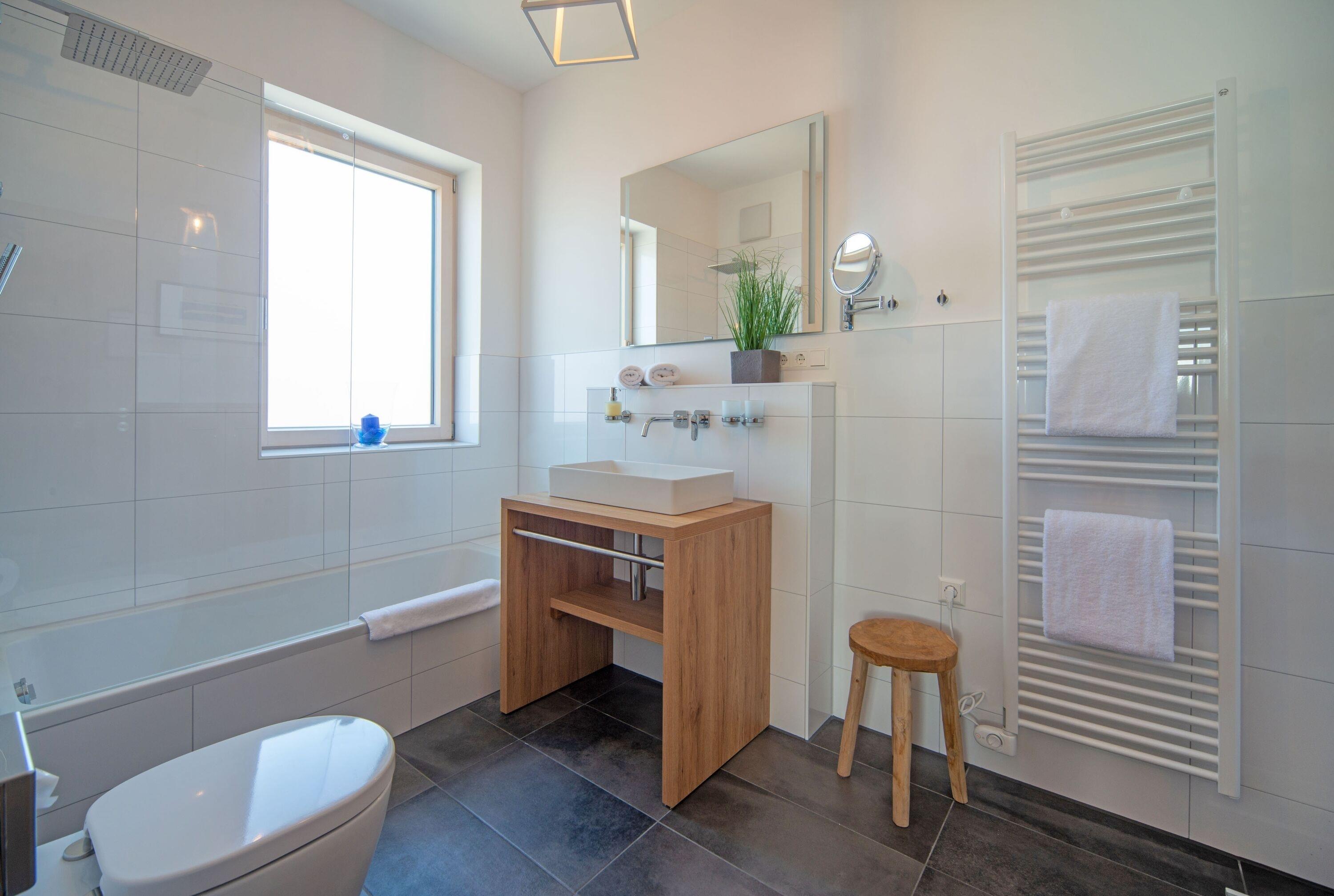 Drei stilvolle Badezimmer - Ein Tageslichtbad mit Badewanne und zwei moderne Bäder mit ebenerdiger Walk-In-Dusche, elektrischer Lüftung, Fußbodenheizung und Handtuchwärmer bieten Komfort und Privatsphäre für alle Gäste.