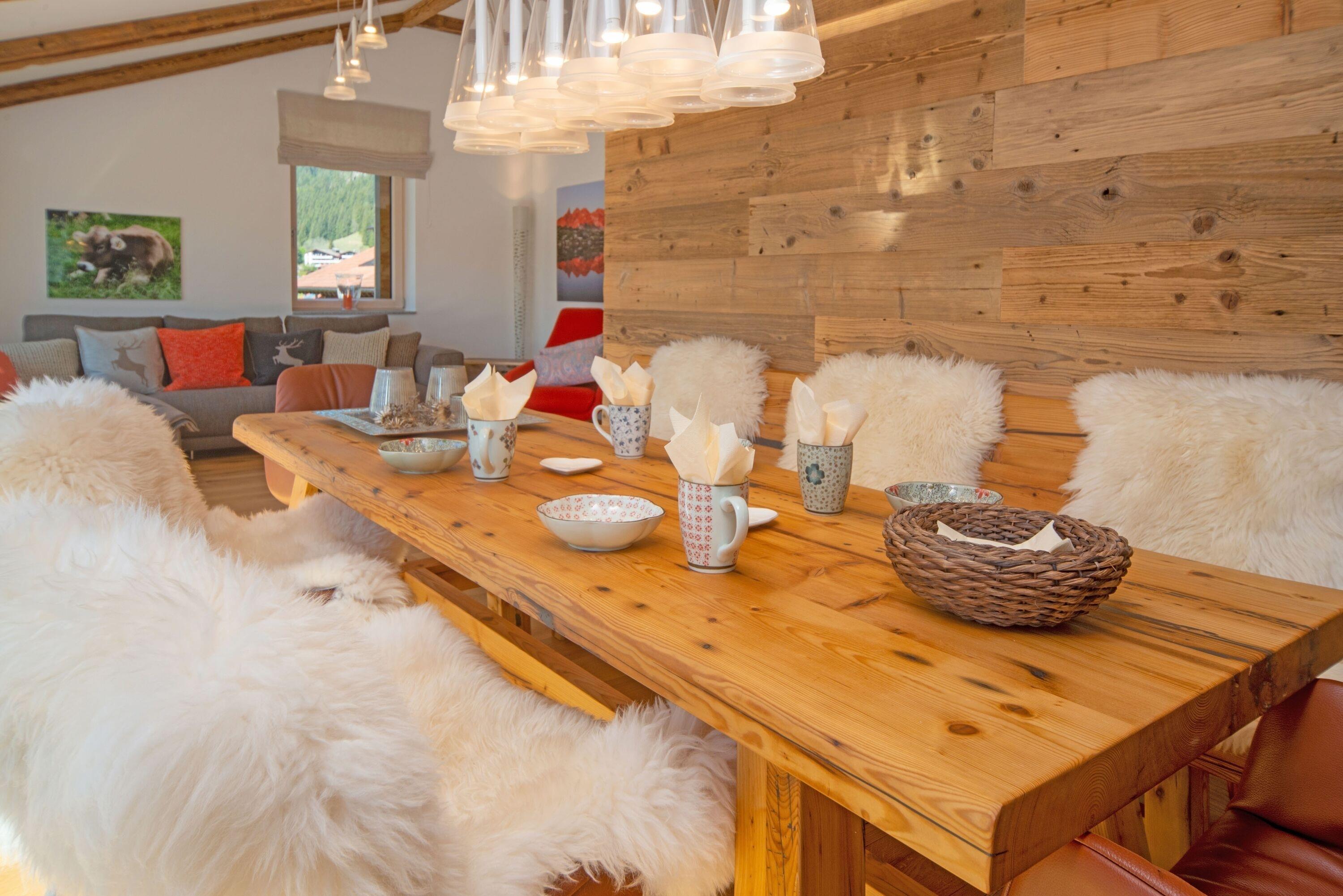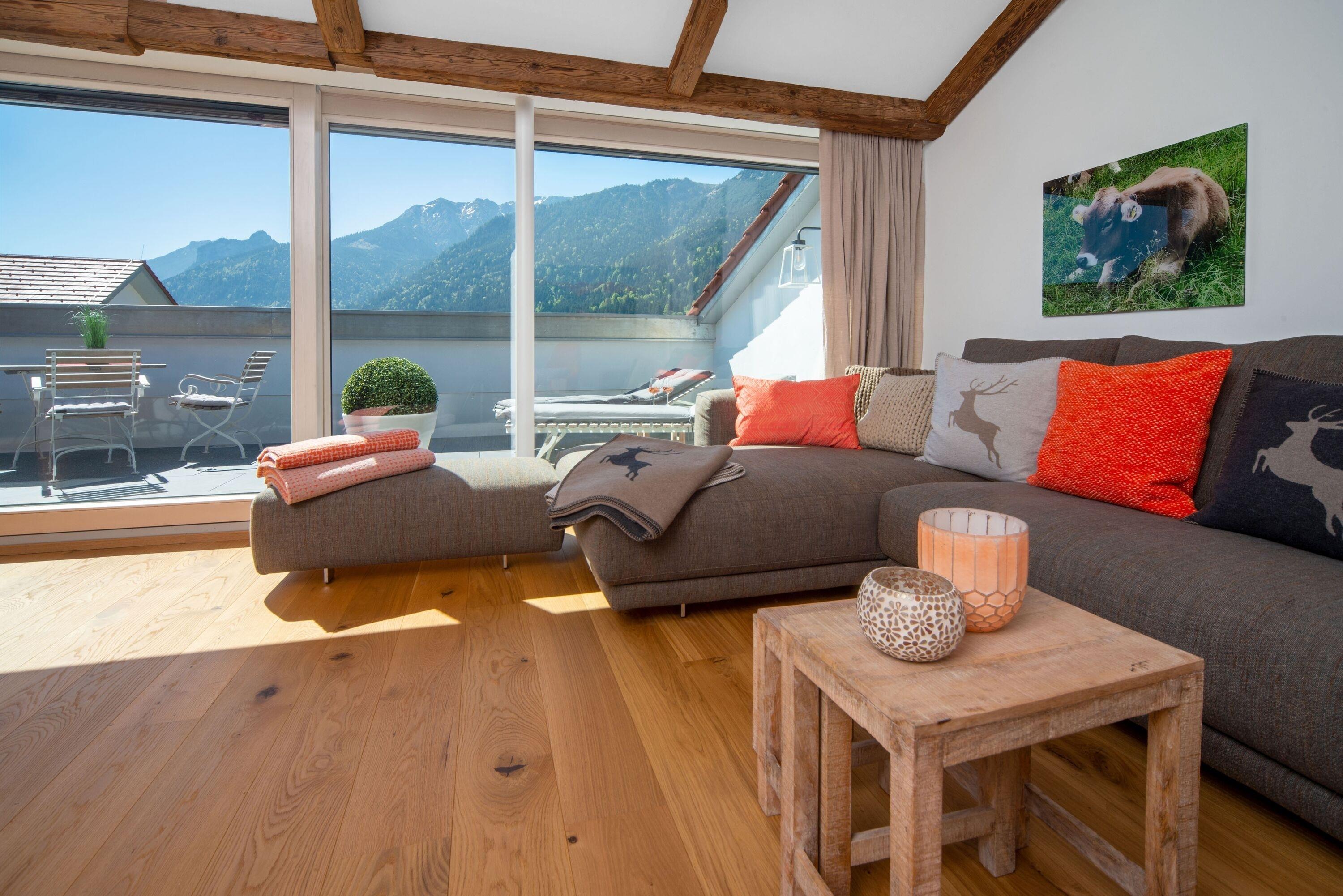 Unschlagbarer Panorama-Bergblick - Der lichtdurchflutete Wohn-Essbereich mit Panorama-Bergblick begeistert mit Altholz-Elementen, Echtholzboden, großer Couchlandschaft, Smart-TV, Bluetooth-Lautsprecher und einem Echtholz-Esstisch für 6 Personen.