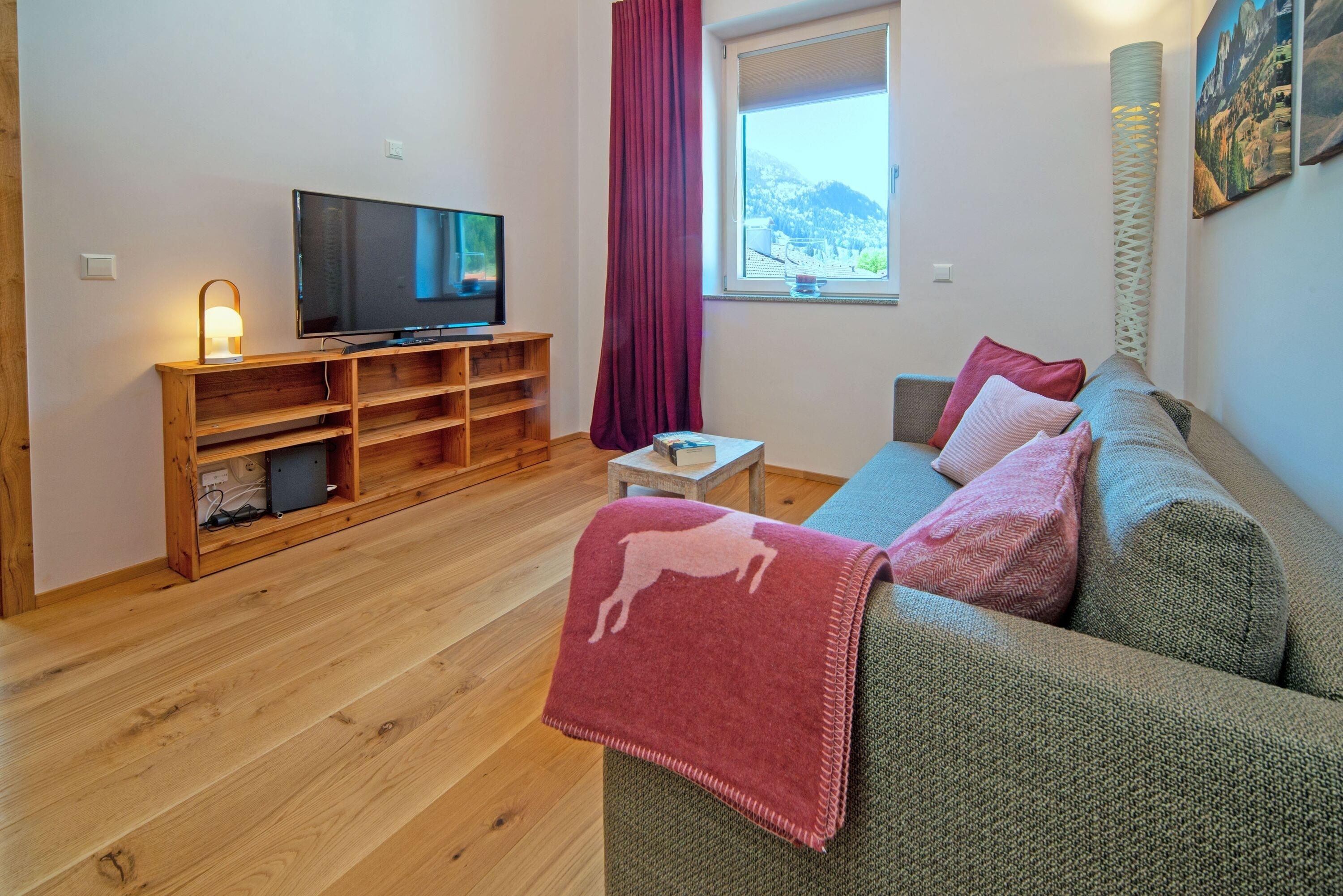 Wohn-Essbereich, im modernen alpinen Stil, hochwertig mit Altholz-Elementen und Echtholz-Fußboden, große gemütliche Couchlandschaft, Smart-TV, Bluetooth-Lautsprecher,