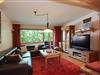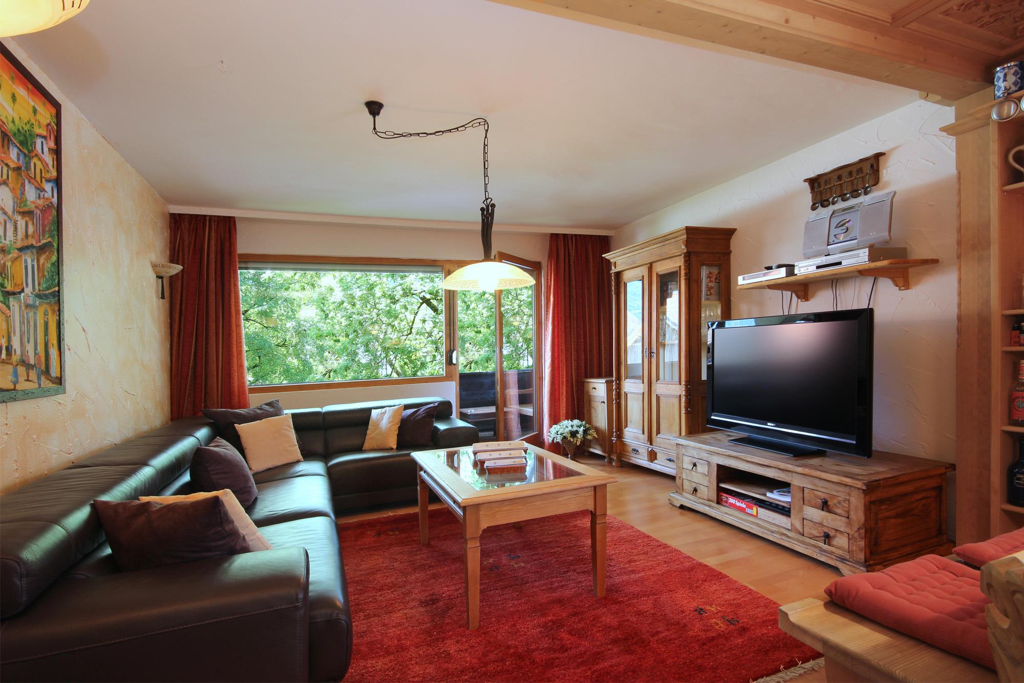 Wohnzimmer mit gemütlicher Leder-Couchgarnitur, Fernsehschrank und TV, Hifi-Anlage