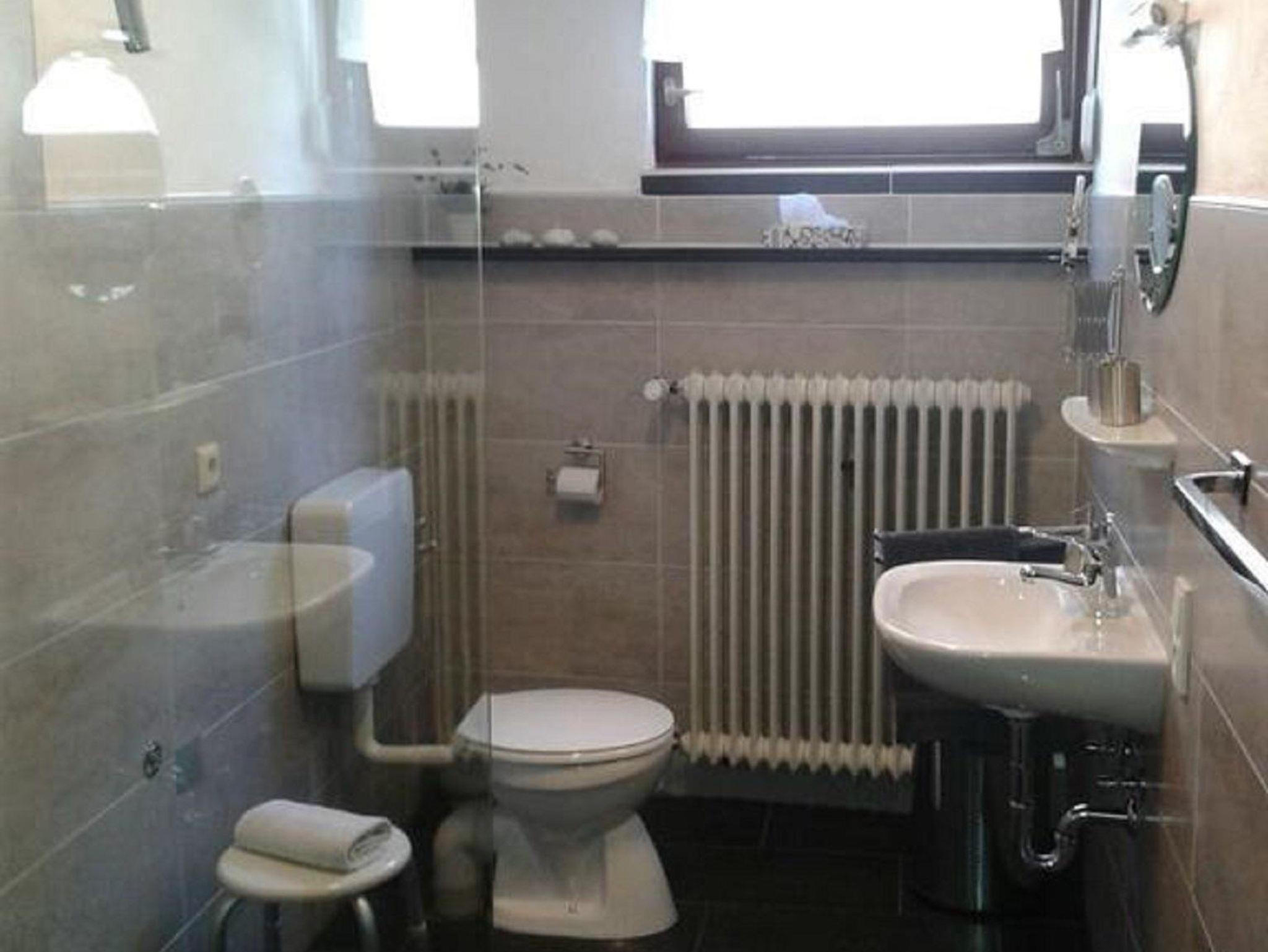 Das moderne, ebenerdige Badezimmer mit Dusche sorgt für angenehmen Komfort. Auf dem Balkon genießen Sie ruhige Momente an der frischen Luft – ideal für ein entspanntes Frühstück oder den Abend bei einem Glas Wein.