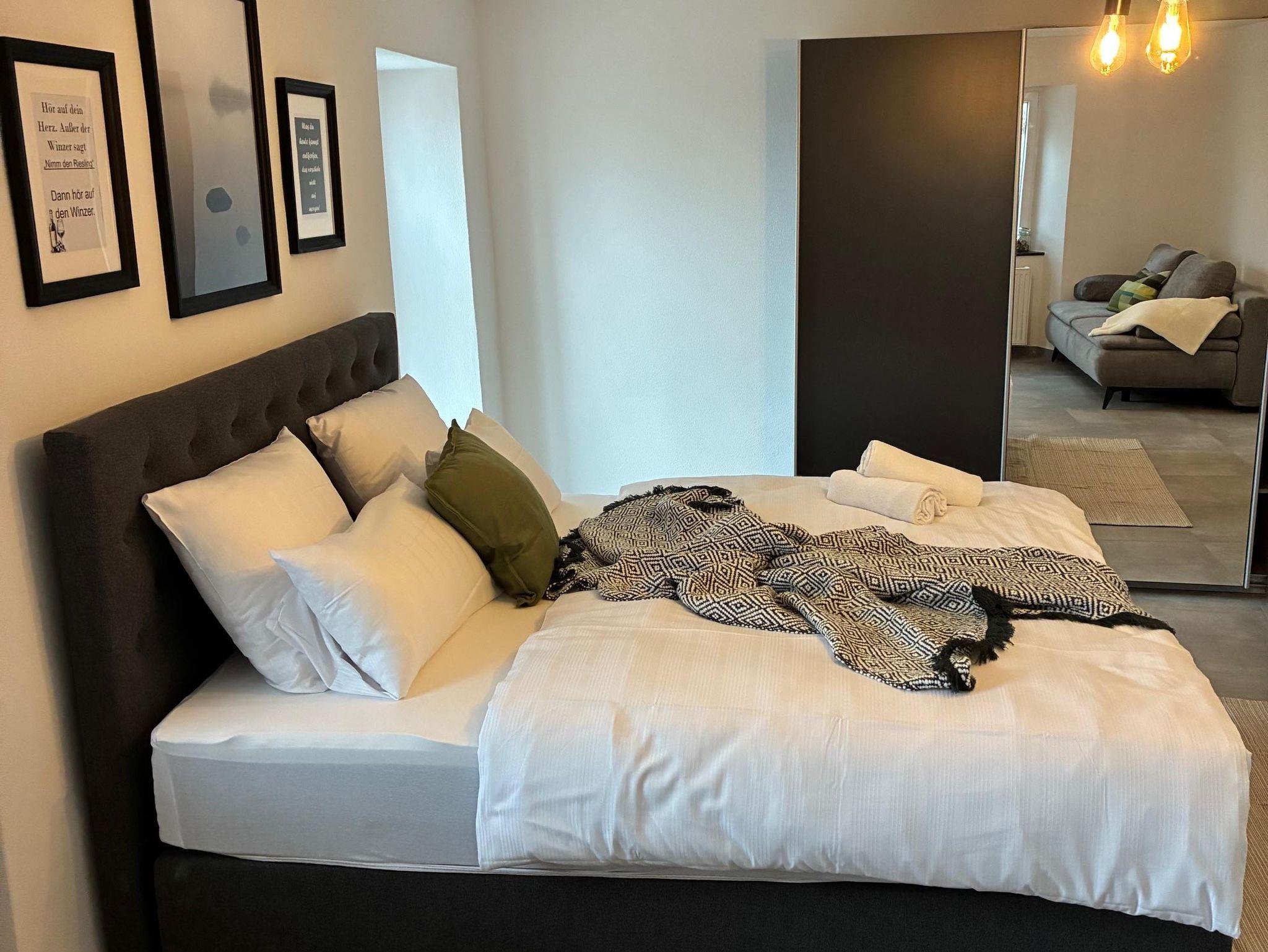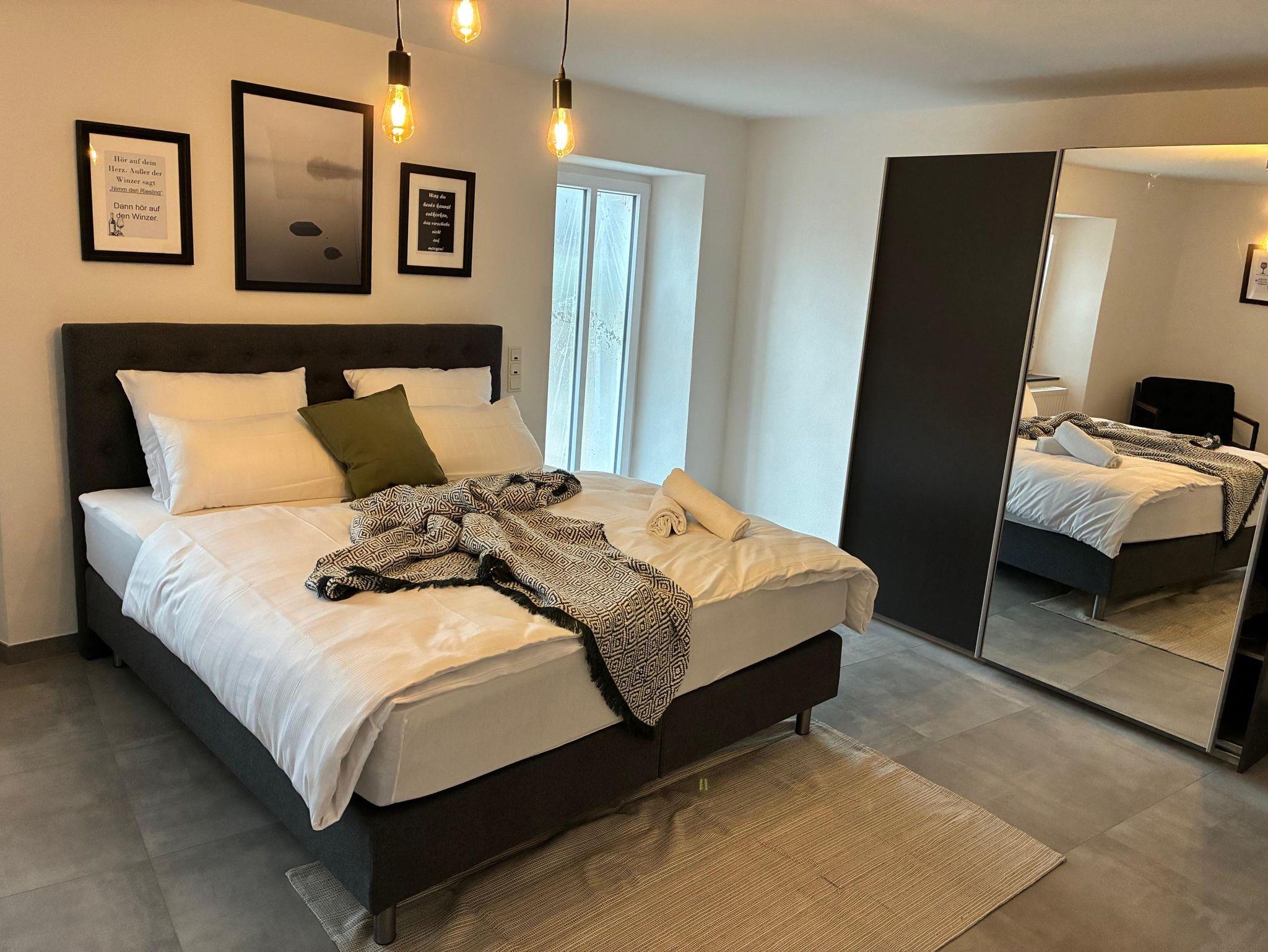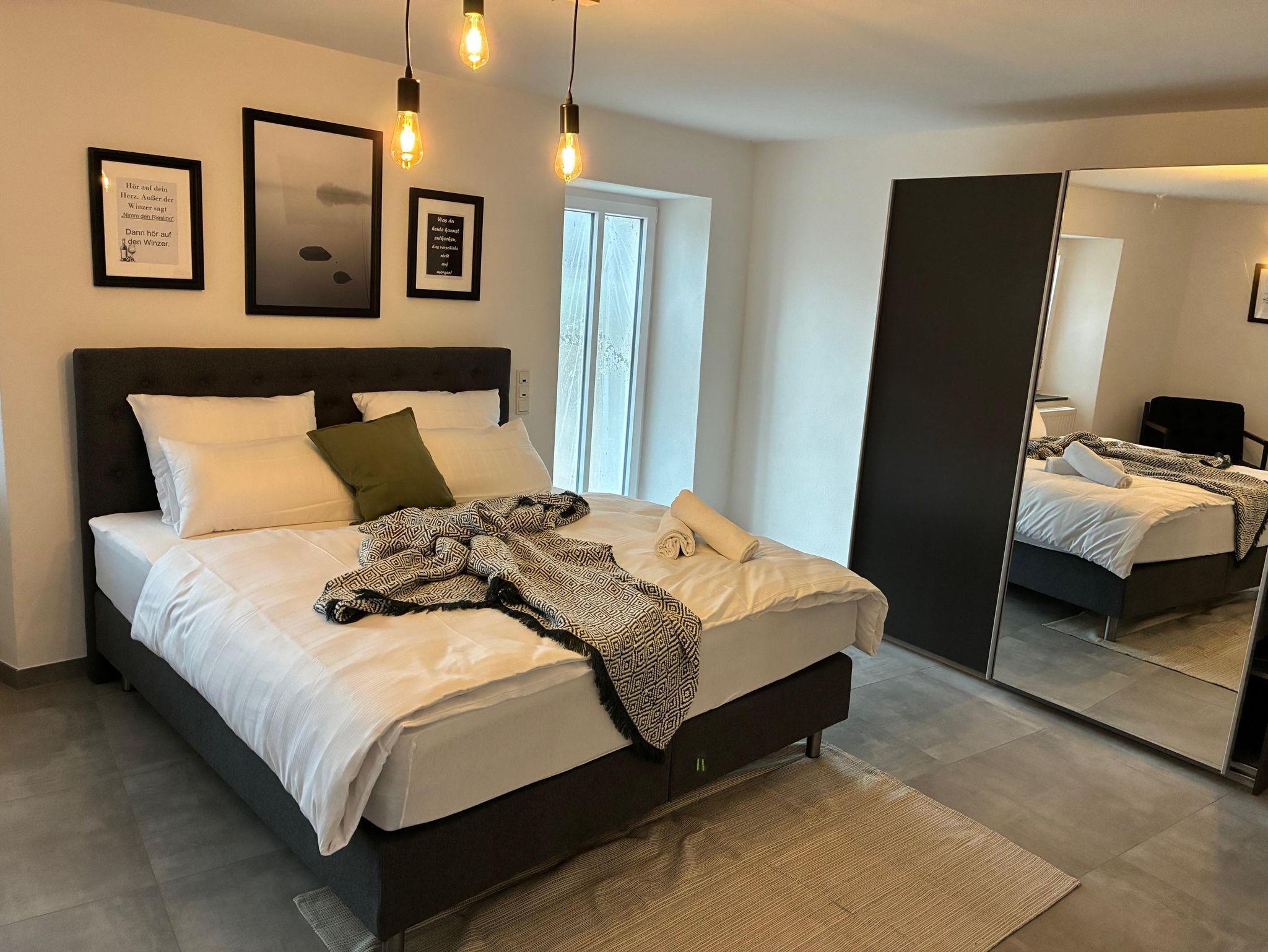 Für Gäste, die Weite und spektakuläre Ausblicke lieben, ist unsere Galeriewohnung die ideale Wahl. Mit großzügigen 160 m² bietet sie viel Raum und Freiheit. Sie erreichen diese exklusive Wohnung über einen charmanten Balkon auf der Rückseite des Hauses, der Sie direkt in die erste Etage führt. Im Inneren erwarten Sie moderne Schlafzimmer, eine brandneue Küche und ein großes, lichtdurchflutetes Bad. Von gleich zwei Balkonen genießen Sie einen atemberaubenden Fernblick auf die Moselschleife – perfekt für entspannte Morgenstunden oder laue Abende.