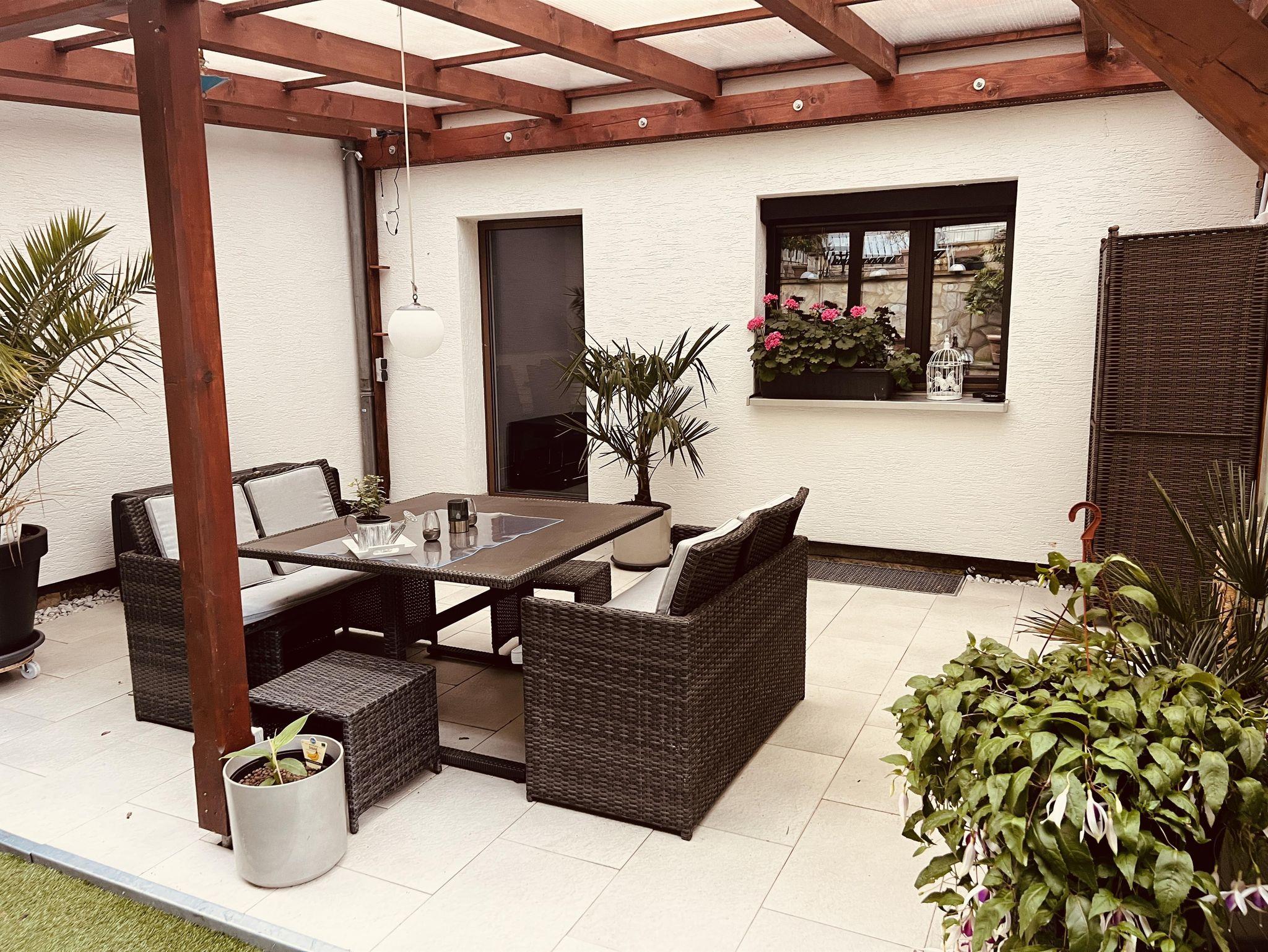 Mit viel Liebe haben wir im Juni 2024 ein ca. 80 m² große Ferienwohung im angrenzenden Reihenhaus für bis zu 4 Gäste + 1 Kleinkind modern eingerichtet. Im Erdgeschoss befindet sich die Wohnküche mir Kochinsel und Esstisch, ein Wohnzimmer sowie ein Gäste-WC. Im Obergeschoss sind zwei Schlafzimmer und das Bad mit Wanne (keine Dusche). Auf der gemütlichen überdachten Terrasse in Richtung Wald, können Sie bei schönem Wetter unter Palmen, duftenden Zitruspflanzen sowie Feigenbäumen entspannen.