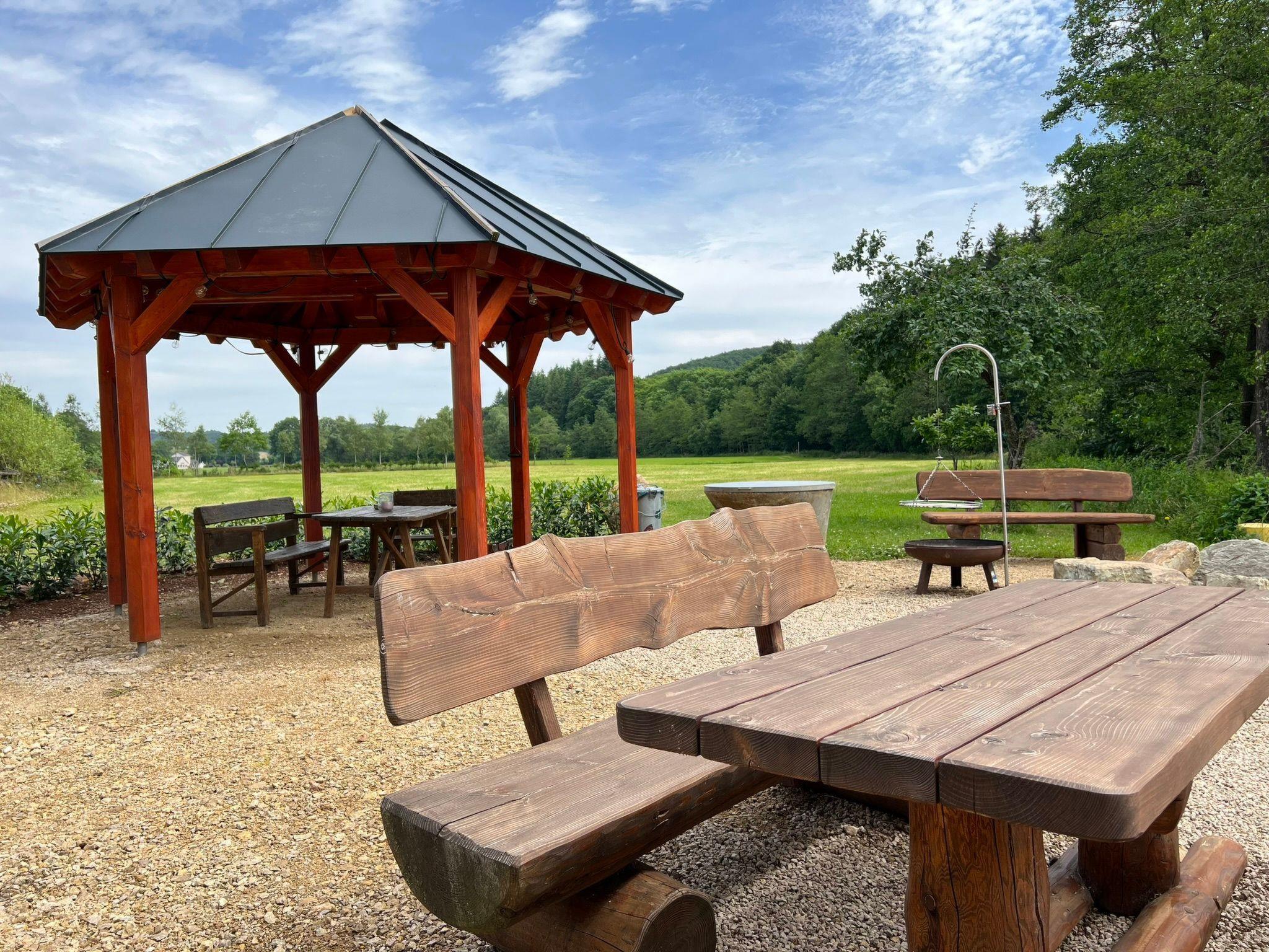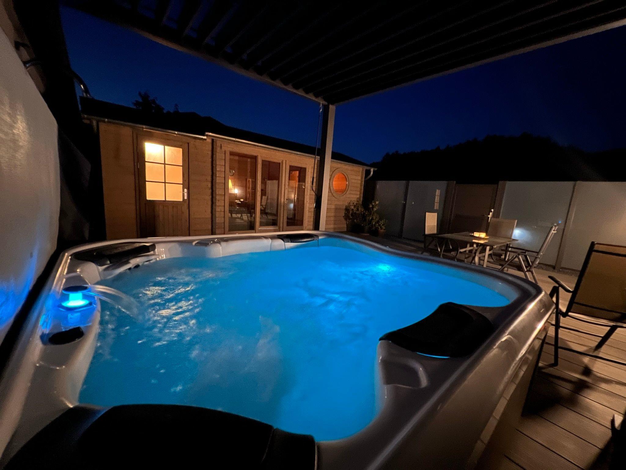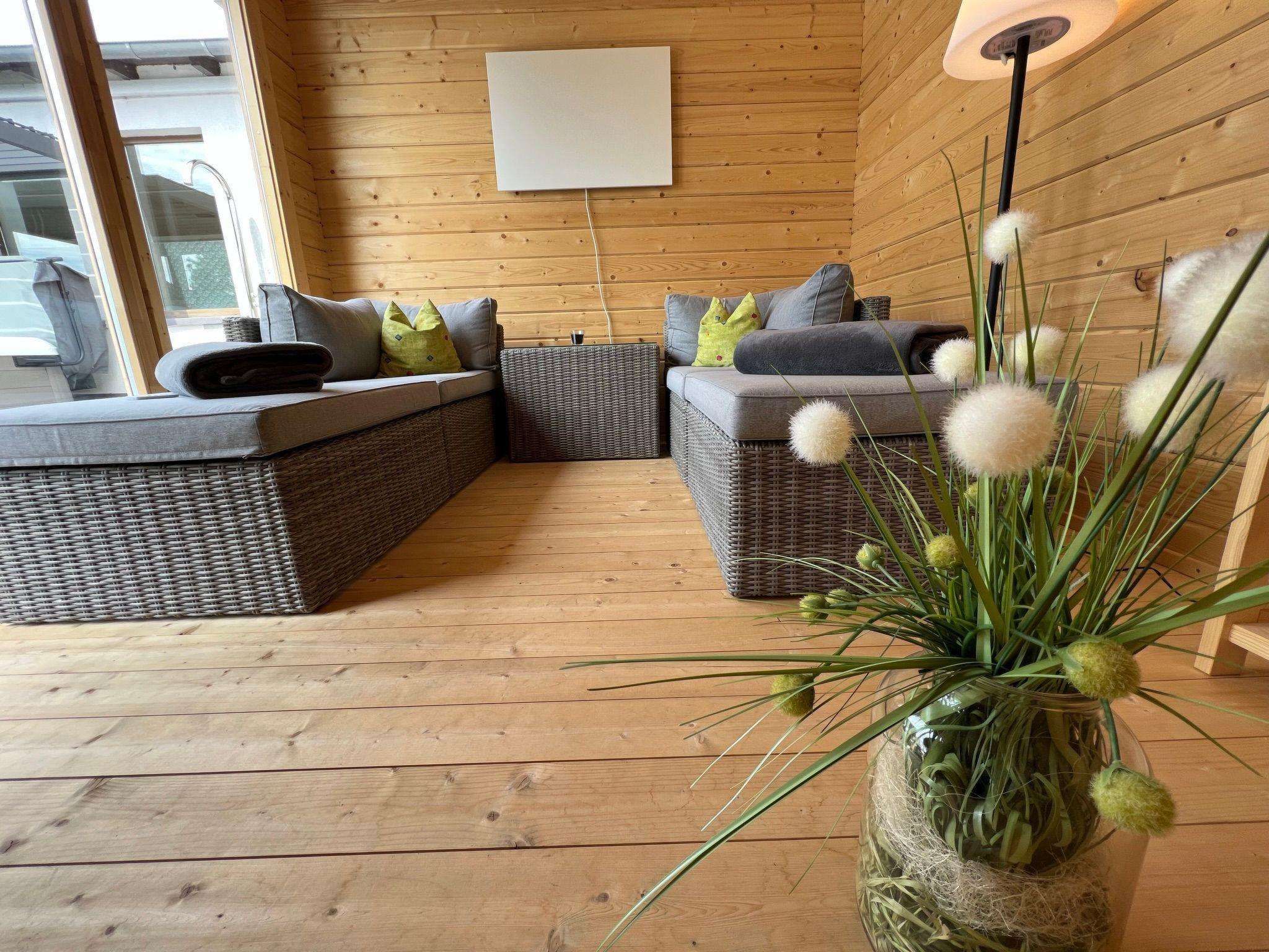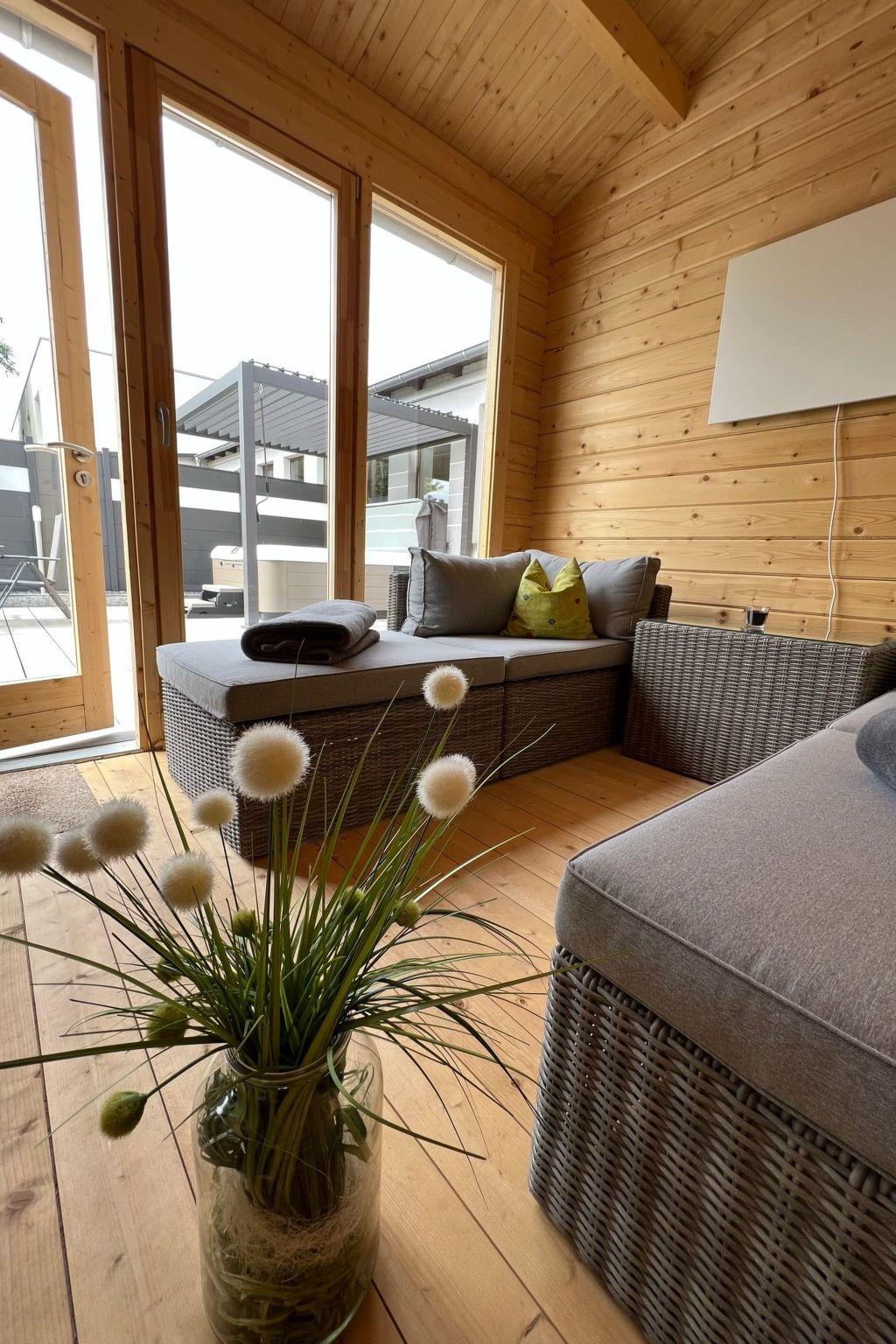 Outside, a generously designed wellness area awaits you, inviting you to relax. This area includes a sauna house, a jacuzzi and a terrace and is open daily from 9 am to 10 pm. Garden furniture, a barbecue area with a large barbecue as well as a well-tended lawn and a wide meadow offer additional space for activities or relaxing hours outdoors.