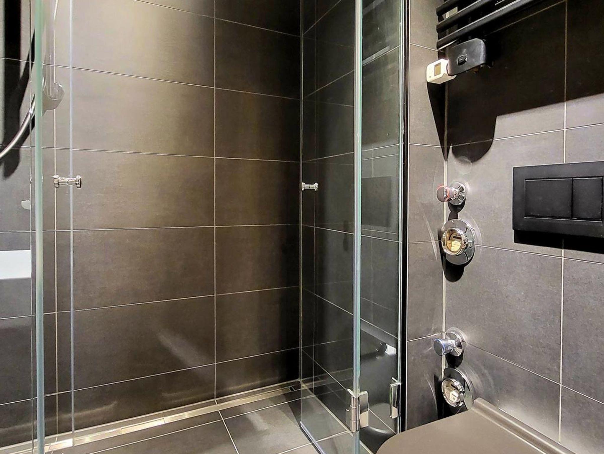 Wurde 2022 komplett entkernt und neu modern hergerichtet mit großzügiger Dusche mit langer Ablaufschiene aus VA, mit Kristall-Ganzglaswänden-/Türen. Dazu WC mit Tornadospülung, Toilettendeckel mit Absenkautomatik, Spiegelschrank mit einstellbarer Beleuchtung und Steckdose, Waschtisch mit Unterschrank. Handtuchheizkörper und diverse Haken und Handtuchhalter. Hygieneeimer und WC-Papiervorratshalter.