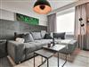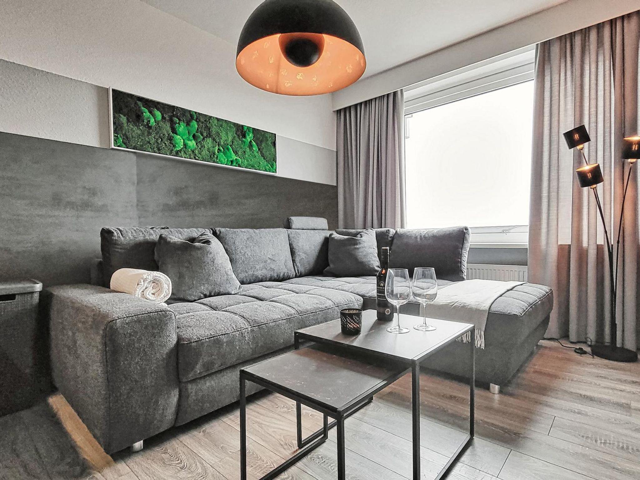Der Wohnbereich ist mit warmgoldenen Leuchtmitteln ausgestattet, wenn Sie einen gemütlichen Abend verbringen möchten. Zuschaltung von hellerem Licht im Möbelbereich und über dem Esstisch ist möglich.