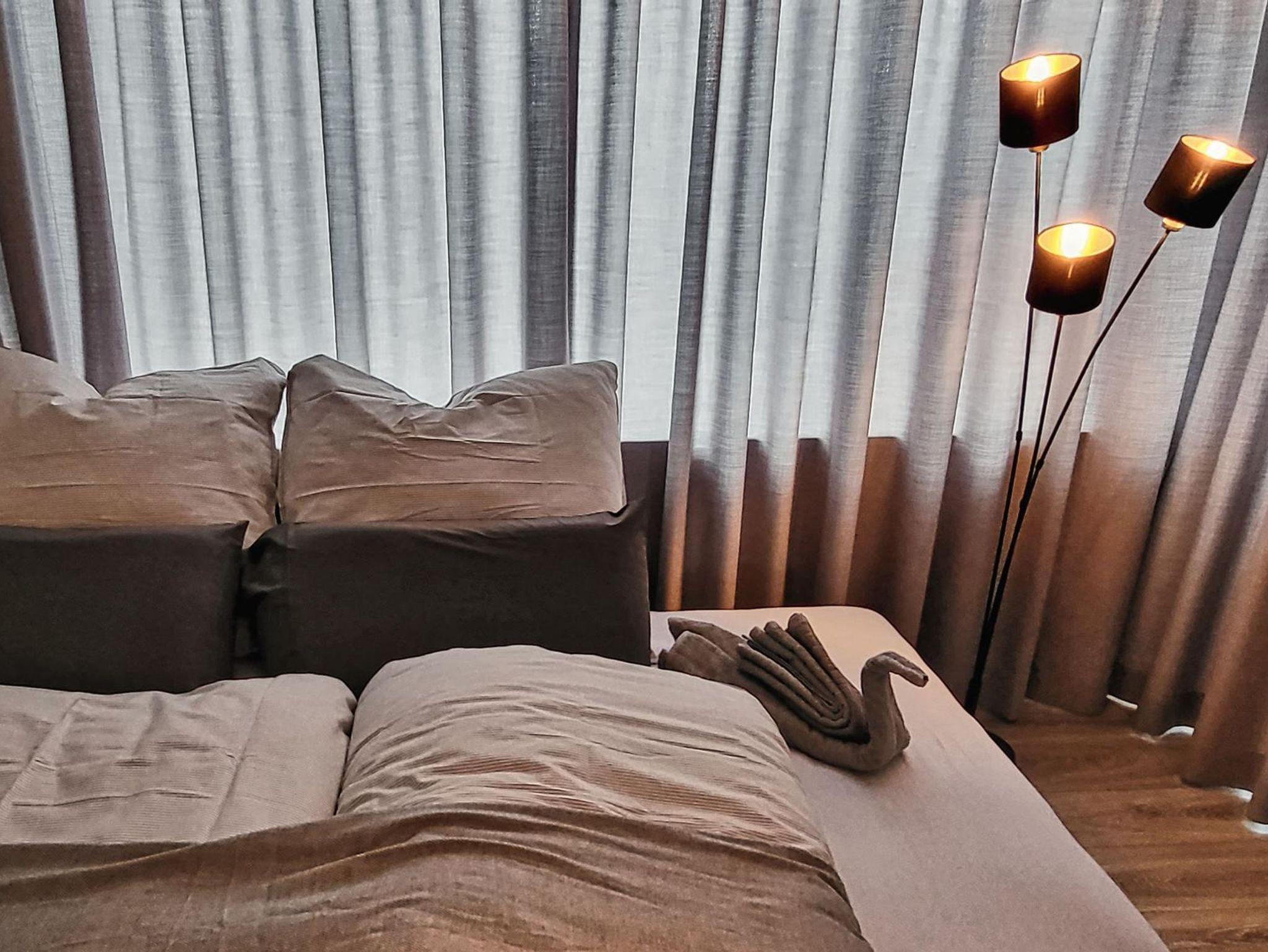 Die Vorhänge im Schlafzimmer sind schwer entflammbar und voll verdunkelnd.