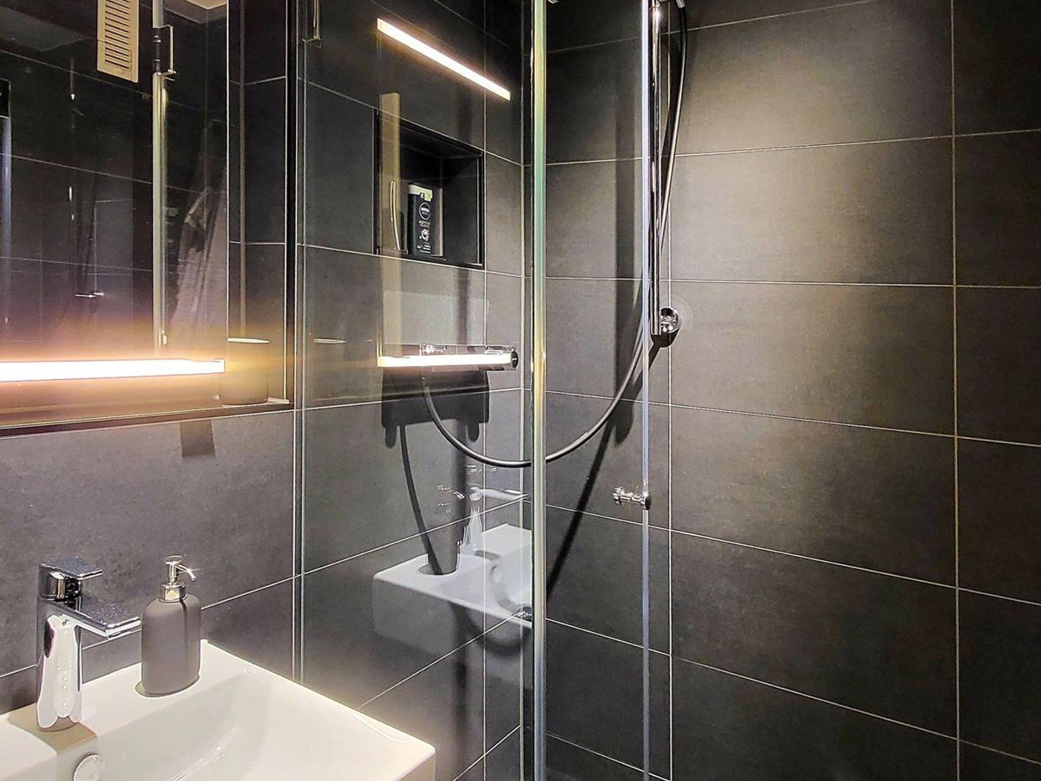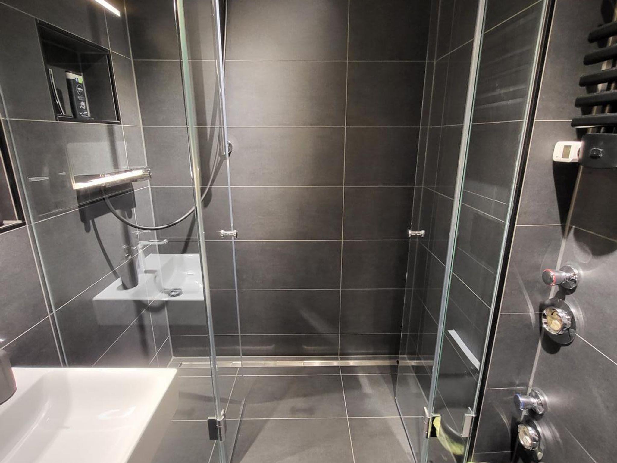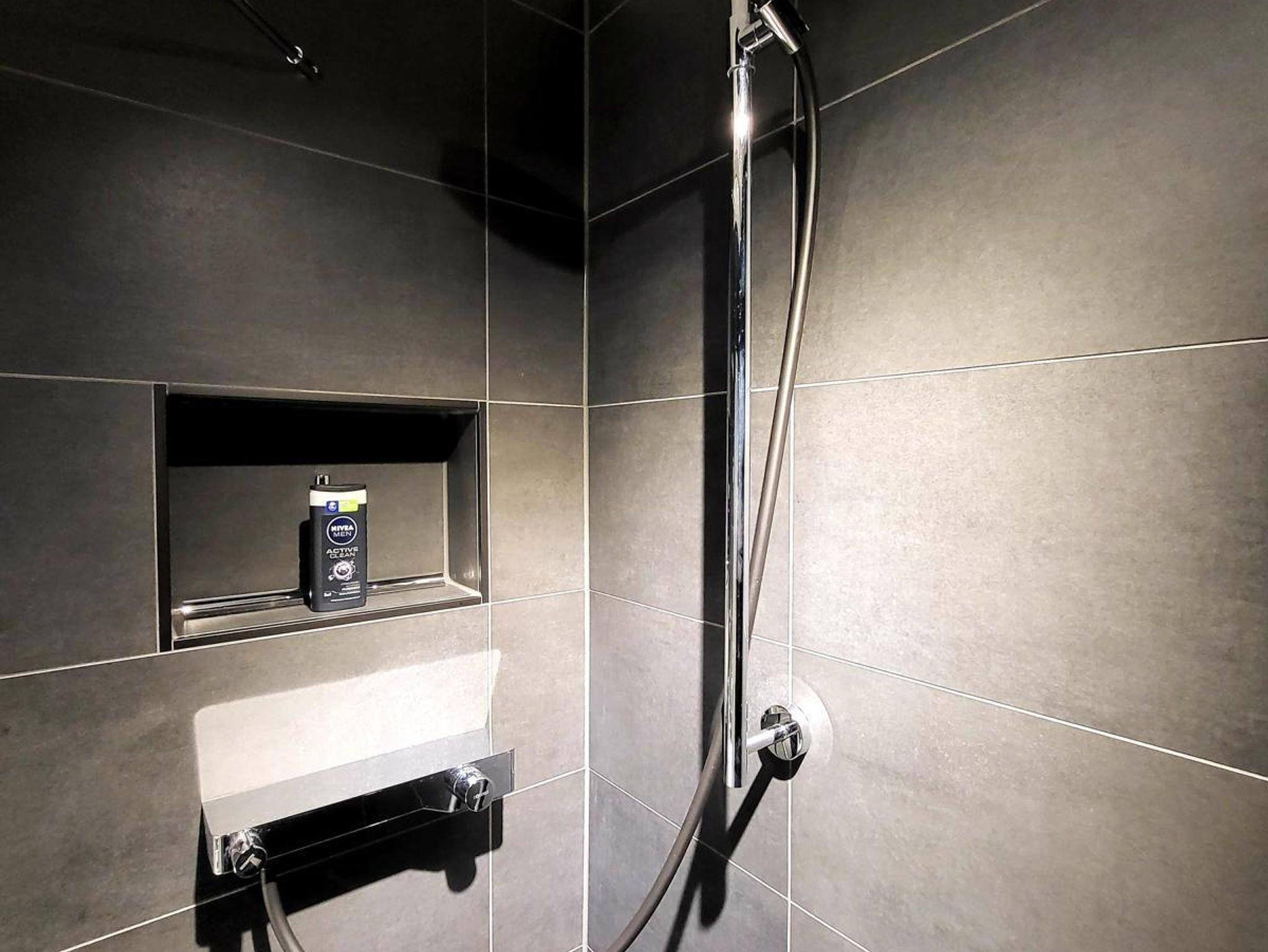 Moderne dunkelanthrazitfarbene Fliesen in Boden- und Wandbereichen.