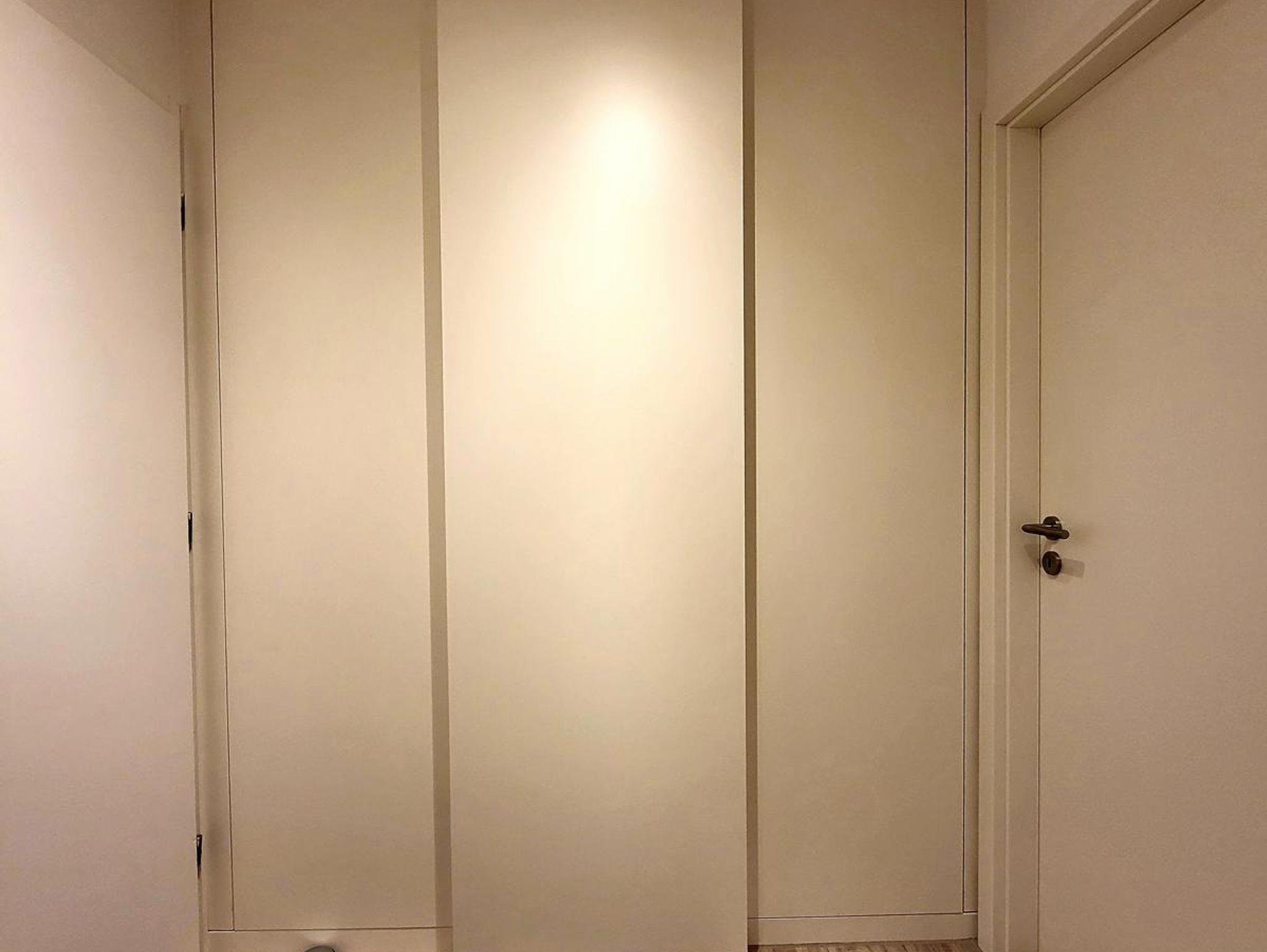 Im Flur ist auch ein dreiflügeliger Einbauschrank (2022) mit push-to-open-Beschlägen eingebaut. Drücken Sie auf den Flügelrand, und der Flügel springt auf.