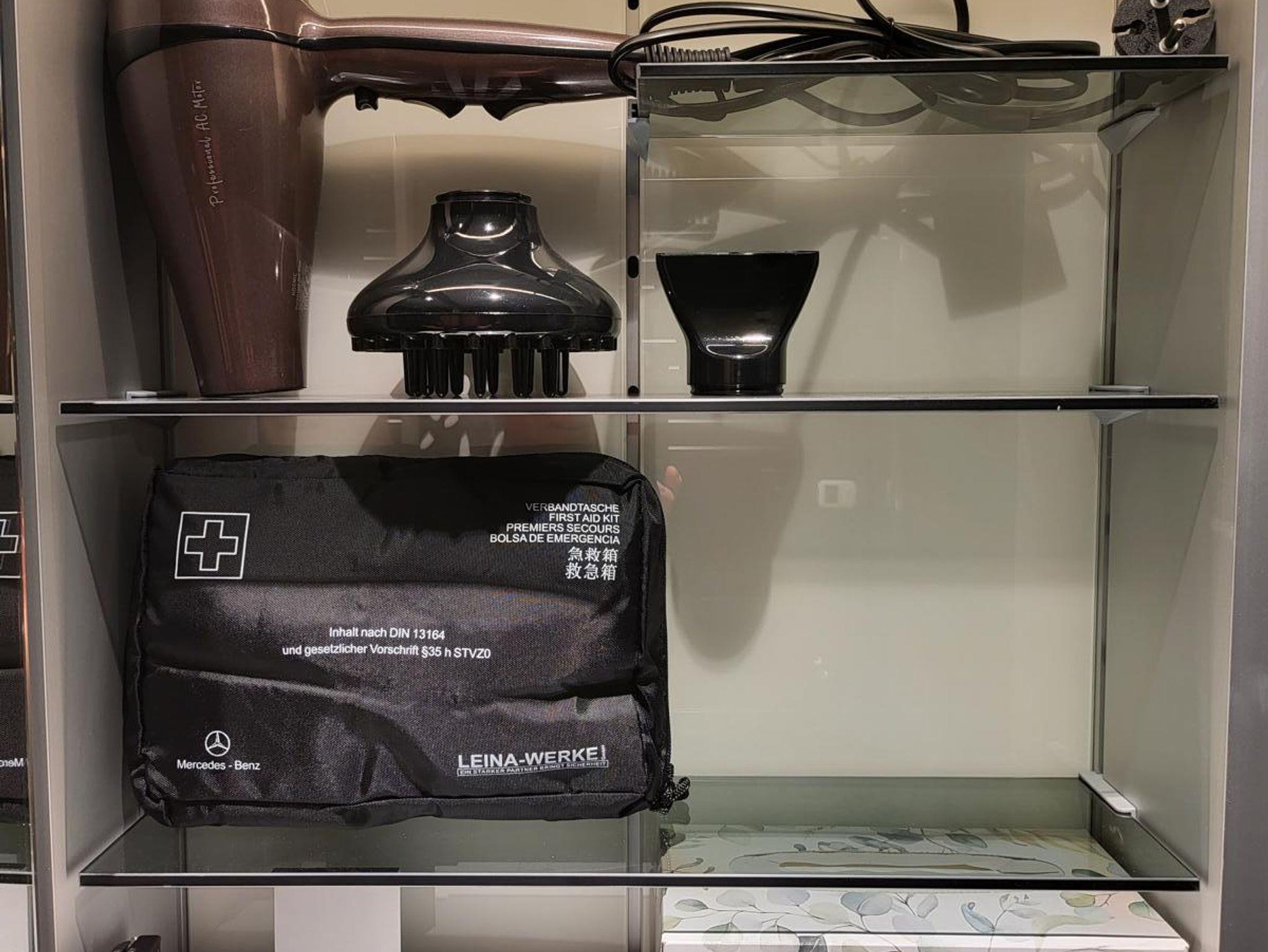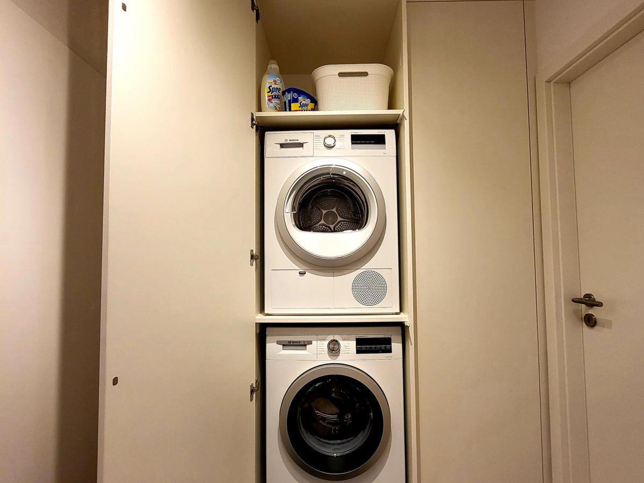 Links im Schrank ist der allgemeine Putzmittelbereich incl. Wäscheständer und Staubsauger, sowie ein Möbeltresor, den Sie benutzen können. Im hinterlüfteteten Schrankmittelteil sind eine Waschmaschine (2022) und ein Trockner (2022) integriert. Der Trockner hat einen festen Kondensat-Anschluss. Sie müssen kein Kondenswasser manuell entleeren.