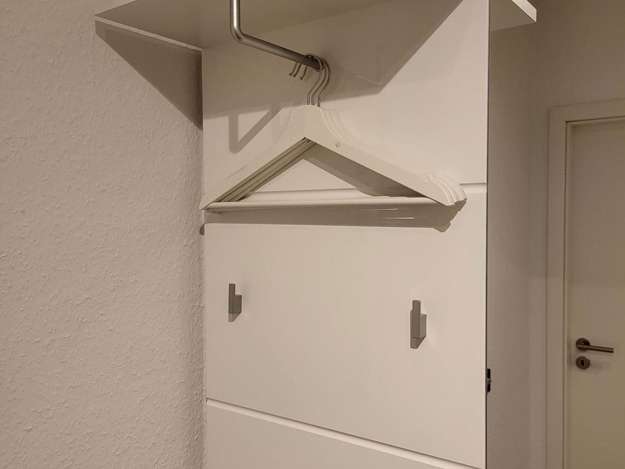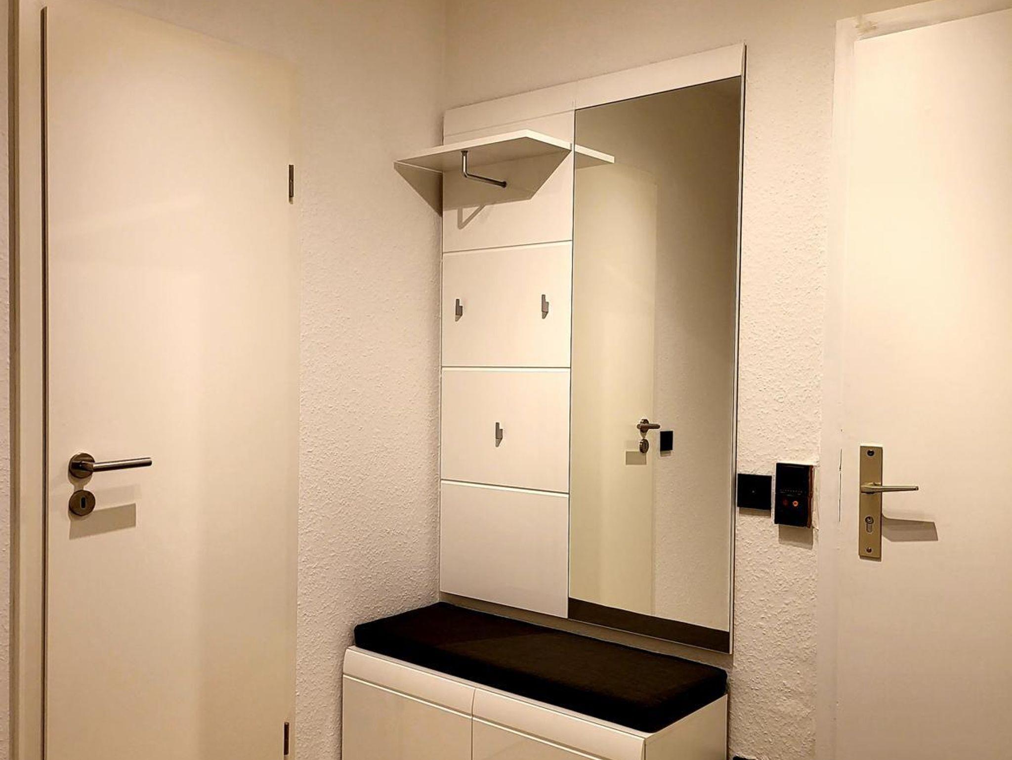 Im rechten Schrankteil sind Handtücher bevorratet, eine Trittleiter, und Sie haben dort eine Garderobenstange und Schuhablagemöglichkeit. Eine weitere Wandgarderobe mit hohem Spiegel ist auf der anderen Seite angeordnet.
