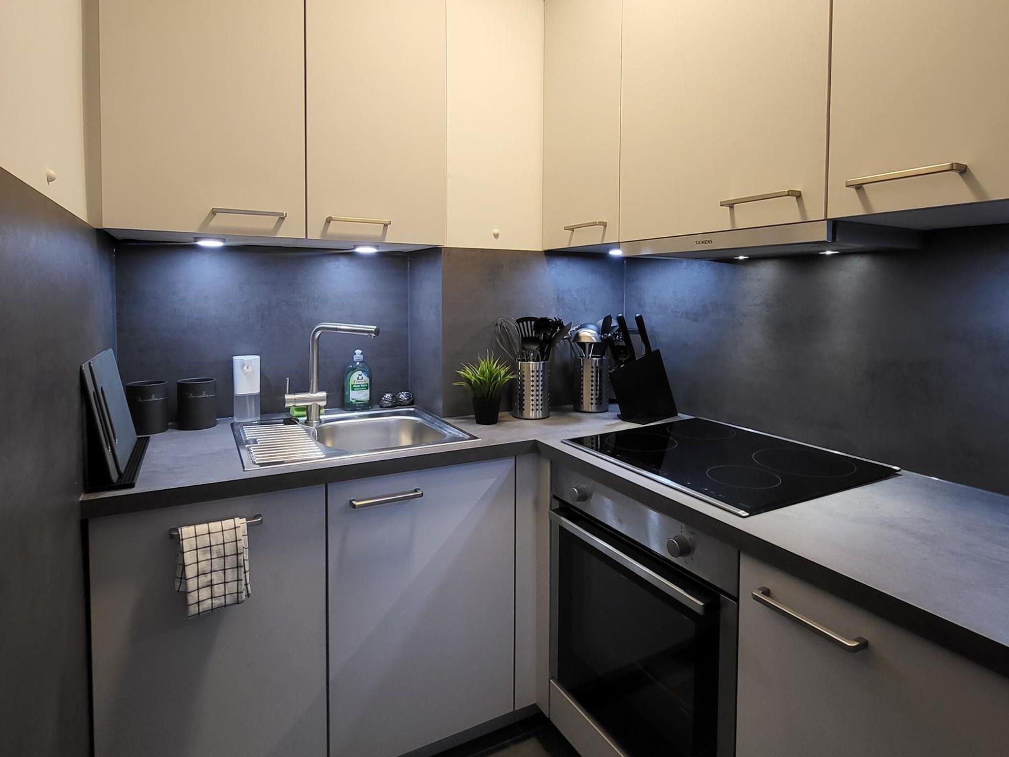 In der neuen Einbauküche (2022) mit Geschirrspüler, Kühlschrank mit Gefrierfach und Induktionsherd mit Mikrowelle können Sie sich gut selbst versorgen. Der in die Küche vorgelagerte Essbereich kann auch gleichzeitig als Laptop-Arbeitsplatz dienen. Bis zu vier Gäste können dort Platz nehmen an höhenverstellbaren Hockern, die platzsparend unter dem Tisch geparkt werden können.