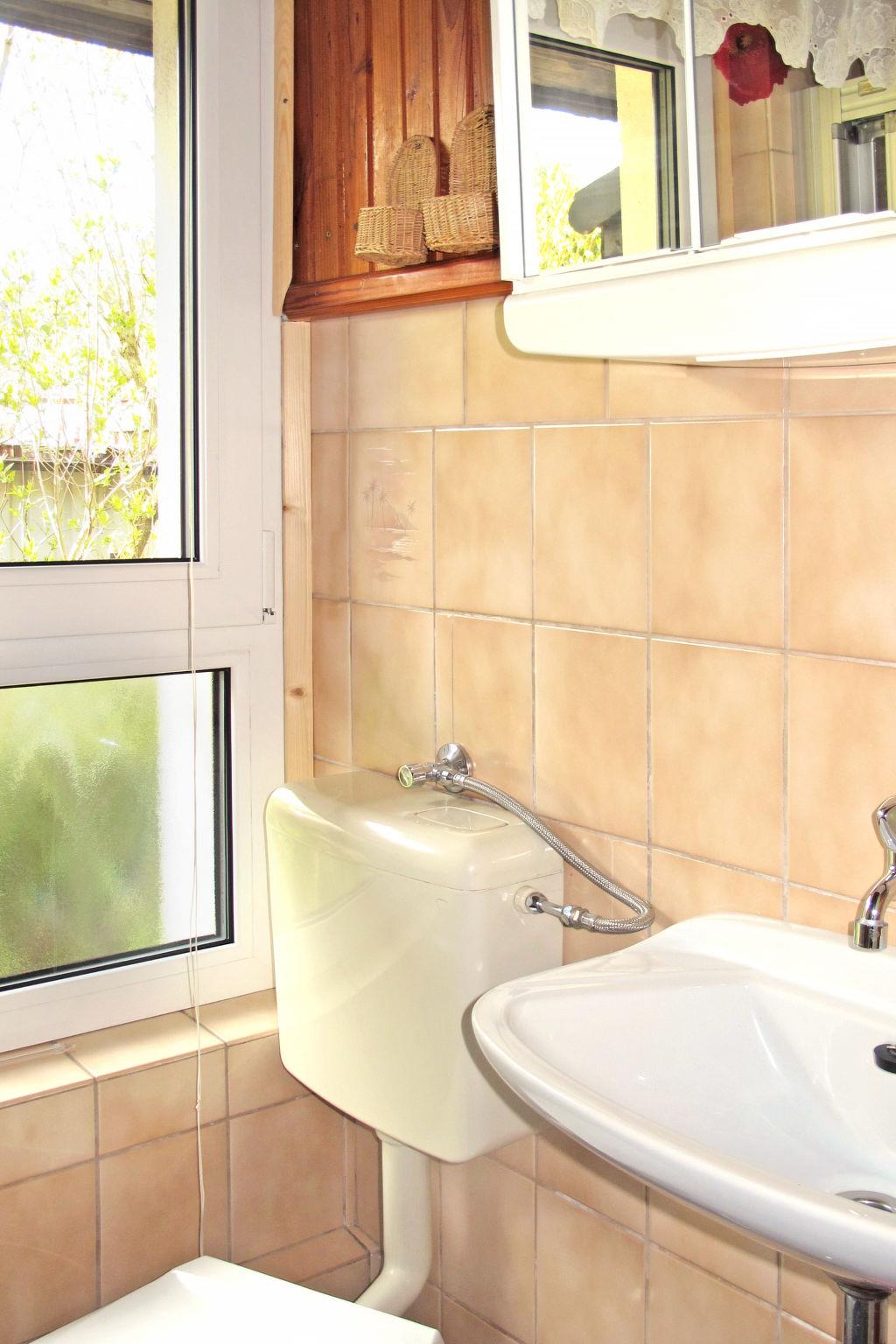 "Katarina I+II", 4-room house 55 m2 on 2 levels. Practical furnishings: living room with satellite TV (flat screen), radio. Exit to the terrace. Living room with satellite TV and radio. Exit to the terrace. Kitchenette (4 hot plates, oven, microwave, electric coffee machine). 2 showers/WC. Gas heating. Upper floor: (steep stair), 1 open room with sloping ceilings, without wardrobe with 3 beds. 1 open room, without wardrobe with 2 beds. Carpet. Facilities: children's high chair, baby cot. Internet (WiFi, free). Please note: non-smoking house. 1 small pet/ dog allowed. Smoke alarm. No internal connecting door between the separated properties. The house consists of the two apartments DE9248.619.1 and DE9248.619.2 as a whole house.