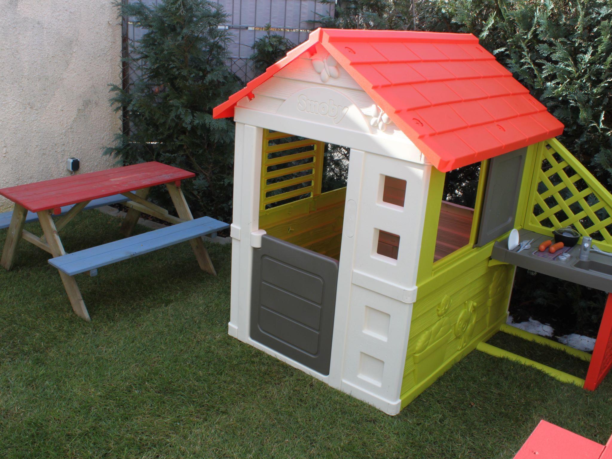 Outside there is a terrace, small lawn, patio furniture, children's play area with playhouse, 2 sun loungers and a charcoal barbecue.