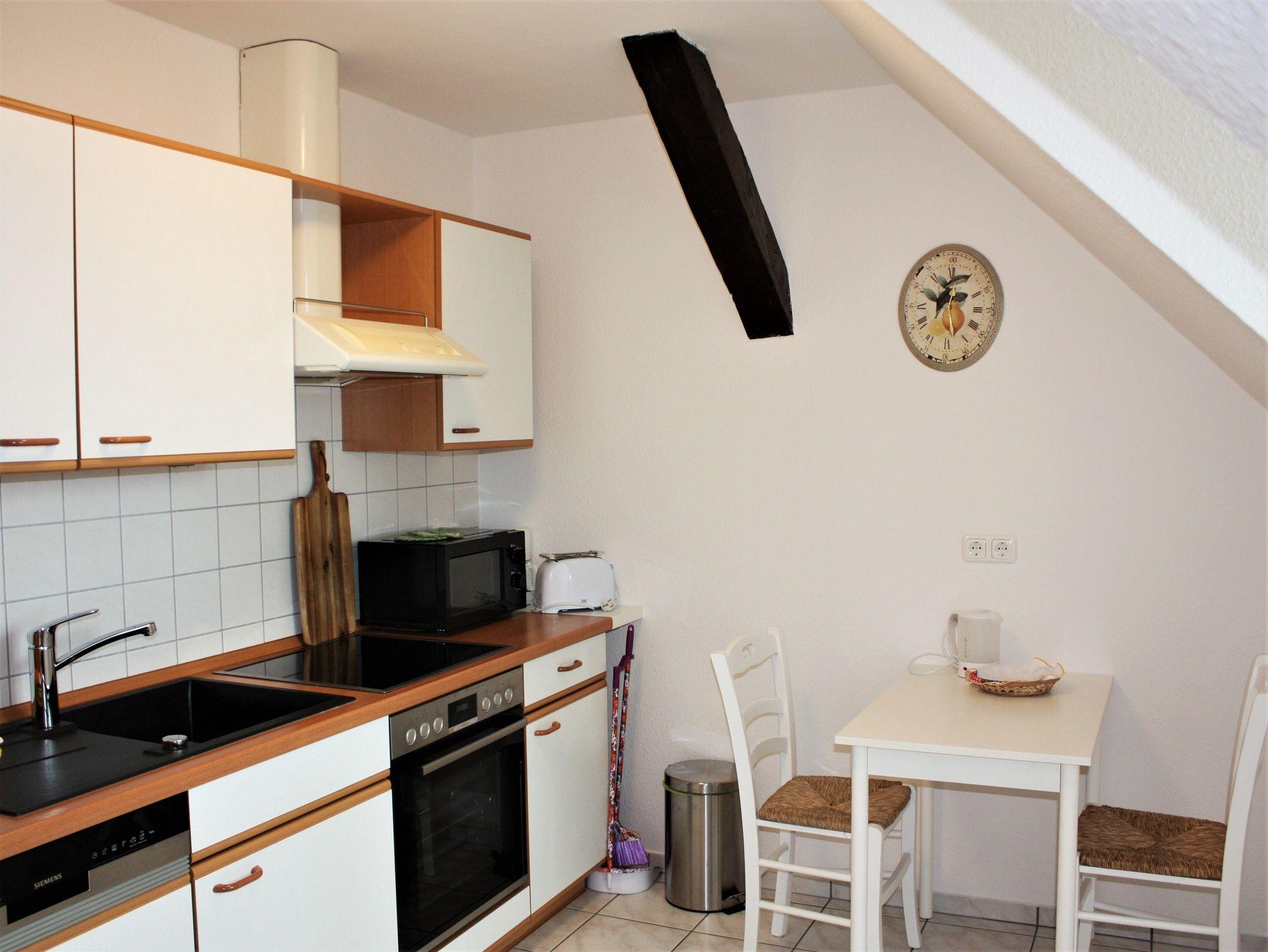 Die Wohnung liegt im Dachgeschoß und besteht aus einem offenen Wohn-/Essbereich, separatem Schlafzimmer mit Doppelbett, voll eingerichtete Küche und Bad mit Dusche/WC. Küche, Wohn- und Schlafzimmer haben Blick zum Burgturm.