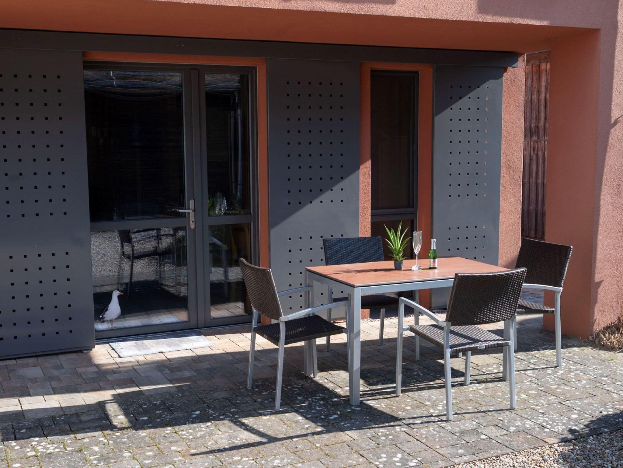 Die Terrasse in unserer charmanten Ferienwohnung ist ein wahrer Rückzugsort, der zum Entspannen und Genießen einlädt. Die Terrasse ist mit einem großzügigem Tisch und 4 Stühlen ausgestattet, ideal für ein Frühstück im Freien oder ein Glas Wein am Abend. Ob Sie die frische Luft genießen, ein gutes Buch lesen oder einfach nur die Seele baumeln lassen möchten ? die Terrasse ist der perfekte Ort.