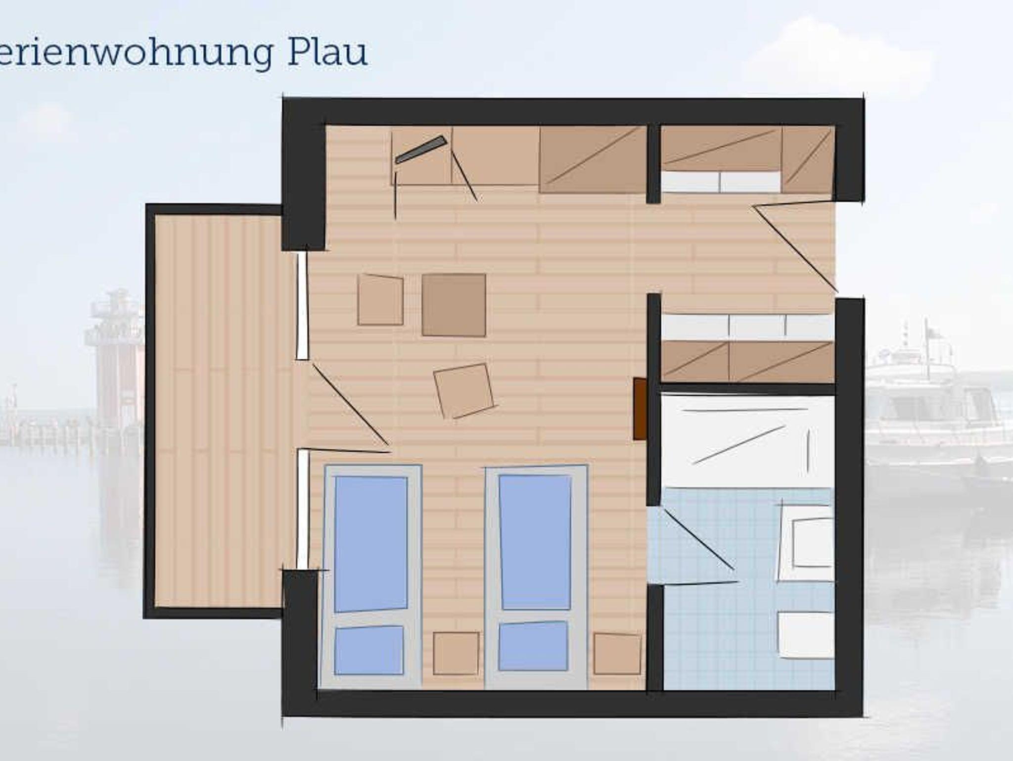 Zwei Betten befinden sich im Wohnbereich, weitere Betten sind über eine schmale Leiter im Obergeschoß erreichbar. Auf dem Balkon finden Sie natürlich praktische Sitzgelegenheiten.