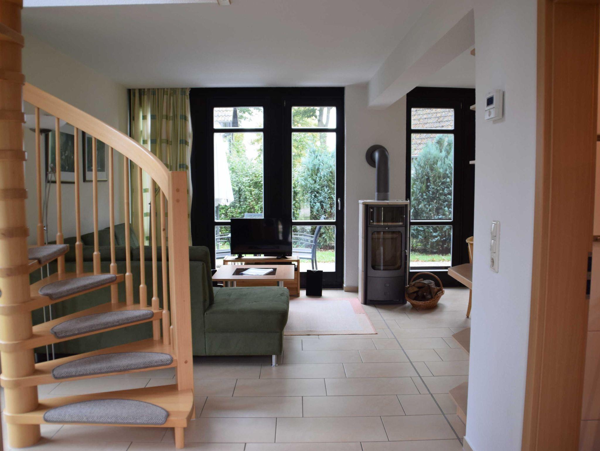 Im EG befindet sich ein Duschbad mit Sauna und die Küche mit Wohn -und Essbereich und einem Kamin.