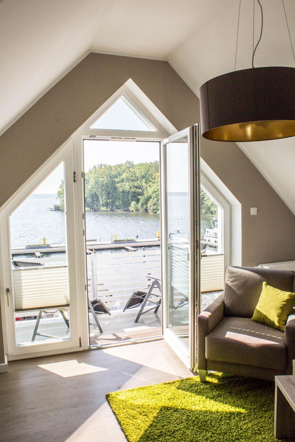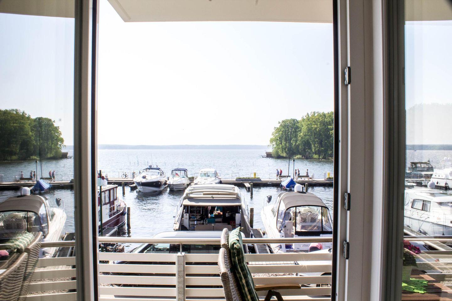 Einen traumhaften Ausblick über den gesamten Plauer See, der Hafenanlage und der Elde-Ausfahrt in Südrichtung genießt man aus dem Panoramazimmer mit einer zusätzlichen Schlafcouch (Liegefläche 1,70 m x 2,00 m). Auch auf dieser Etage befindet sich ein Balkon mit 2 Sonnenliegen (Süd Lage).