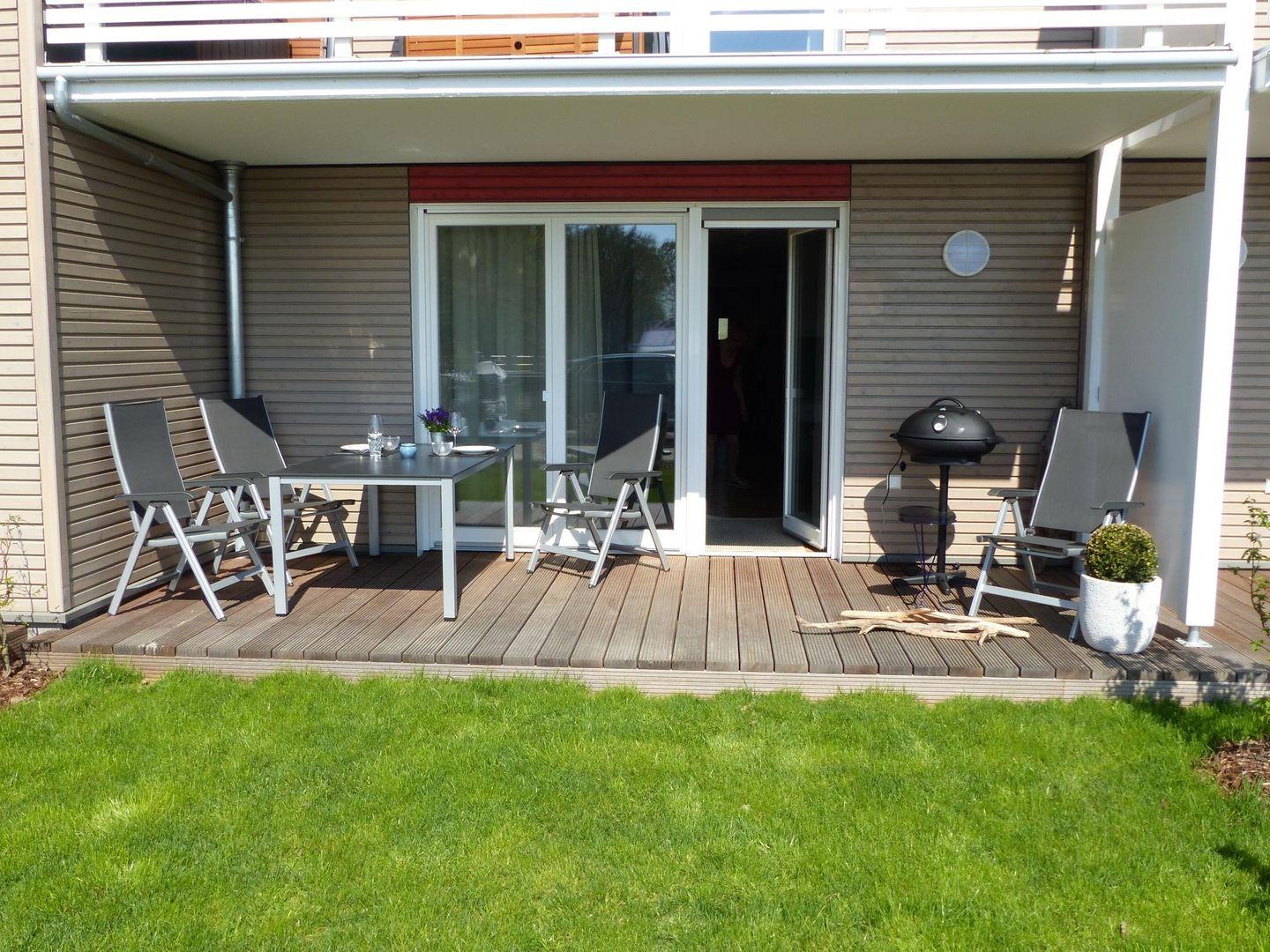 Die Terrasse mit Grünfläche ist nach Süden ausgerichtet und einem Tisch, vier Stühlen